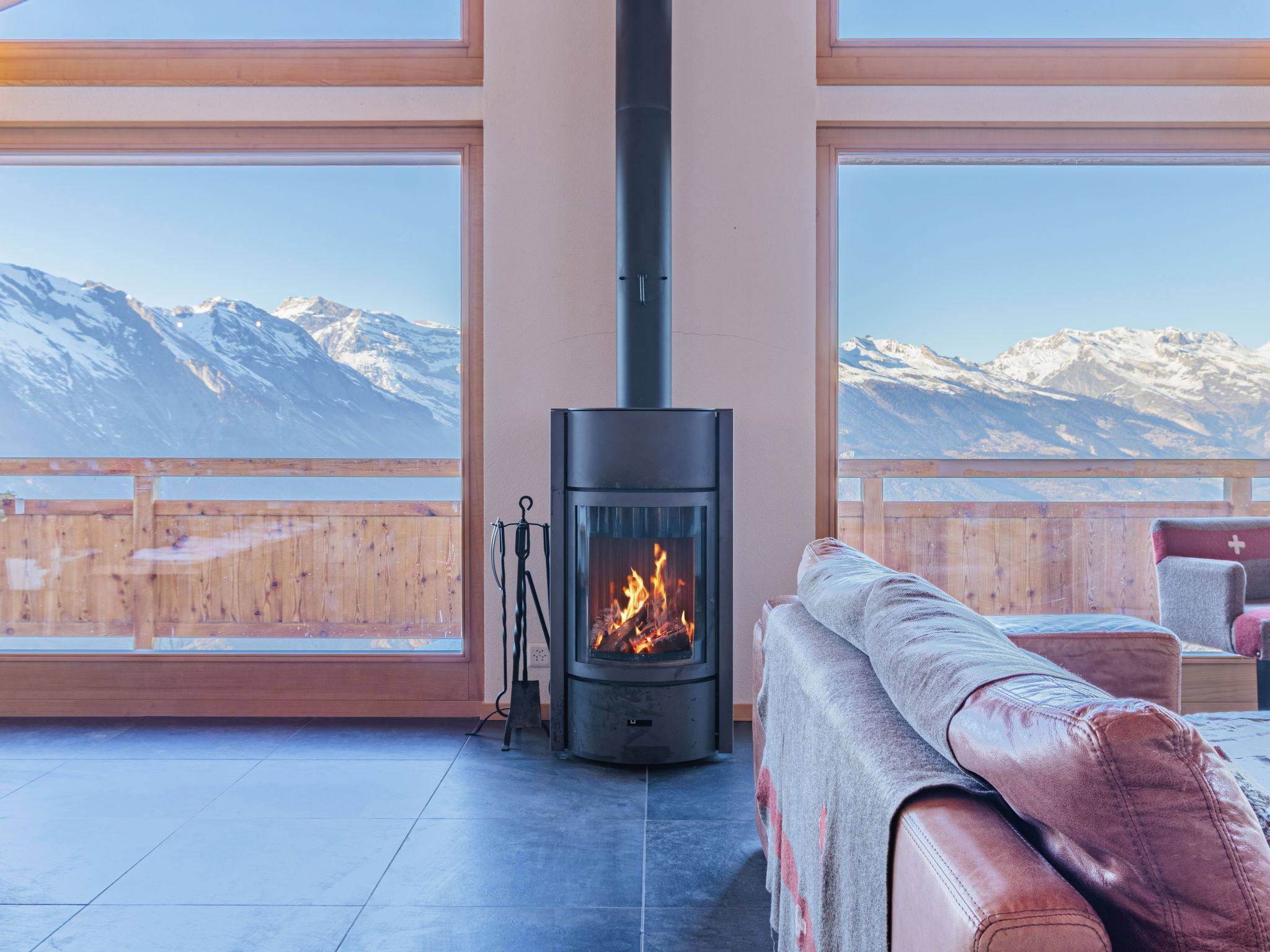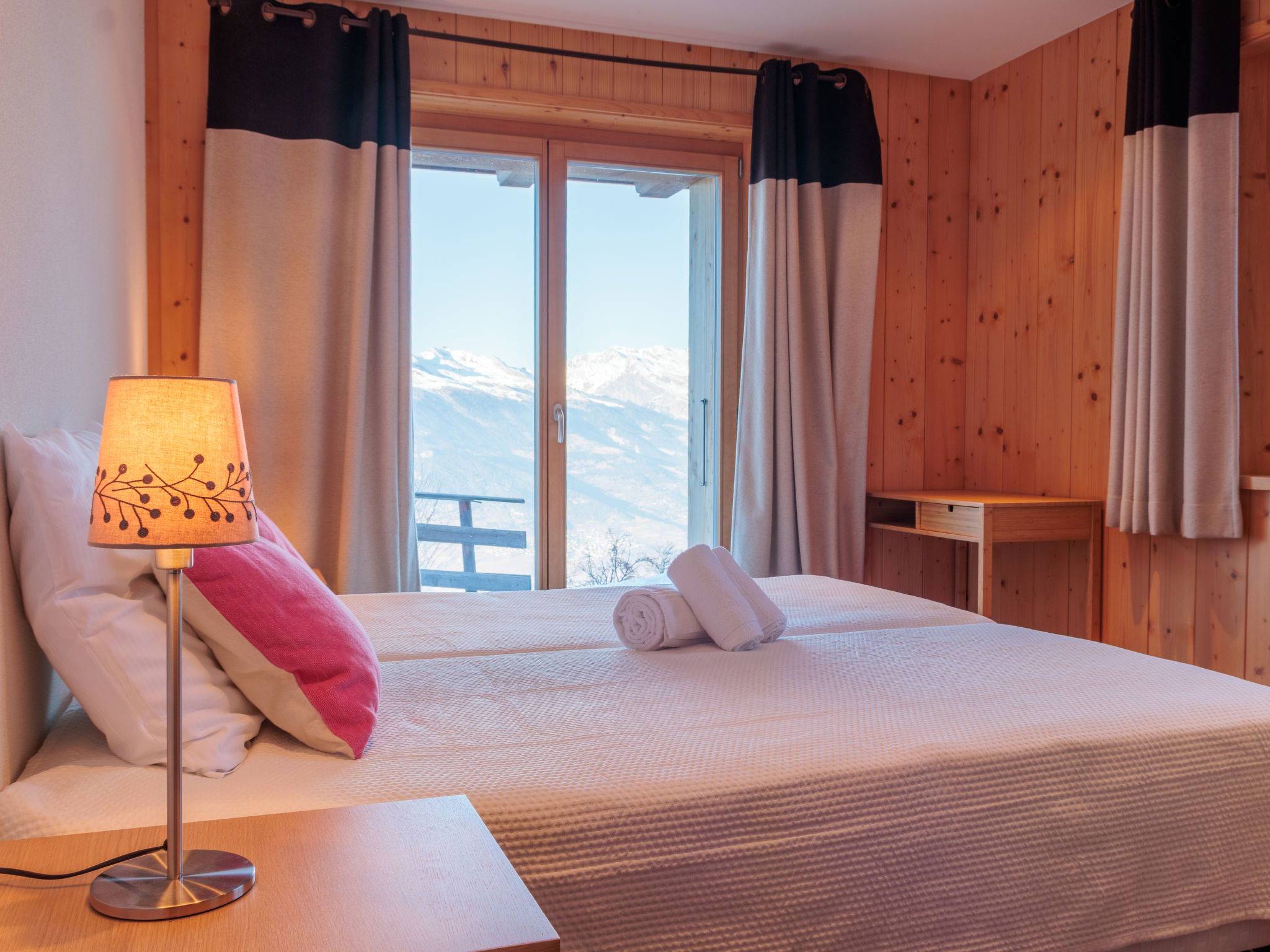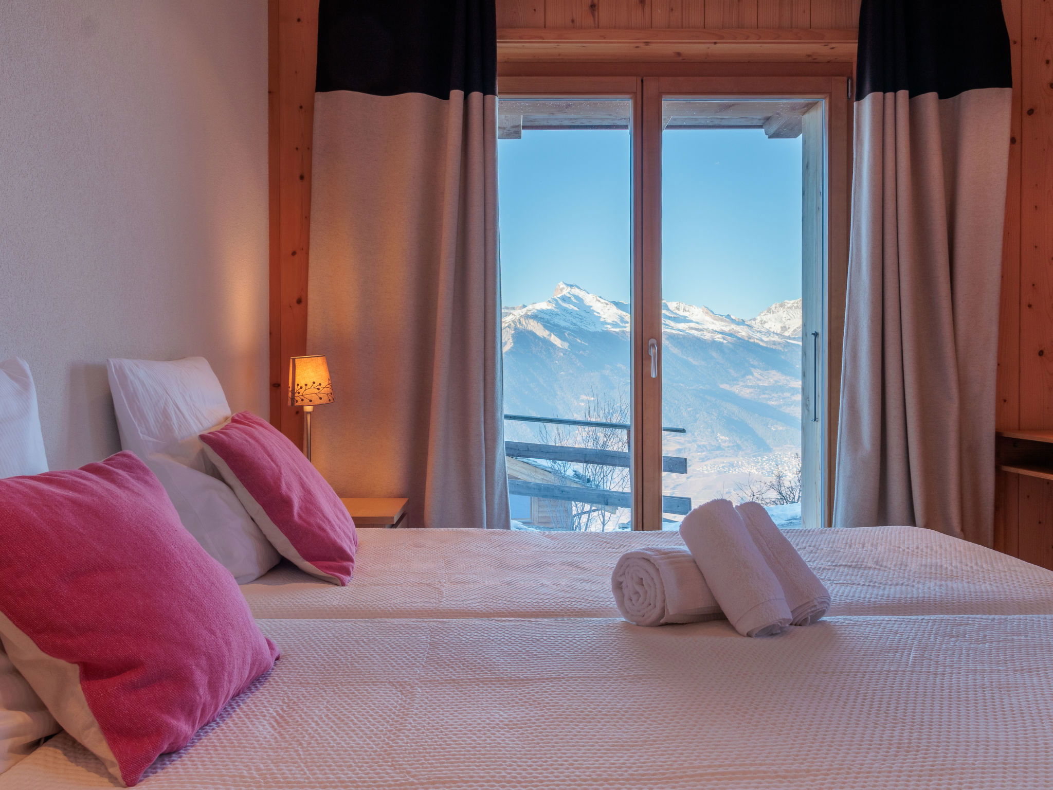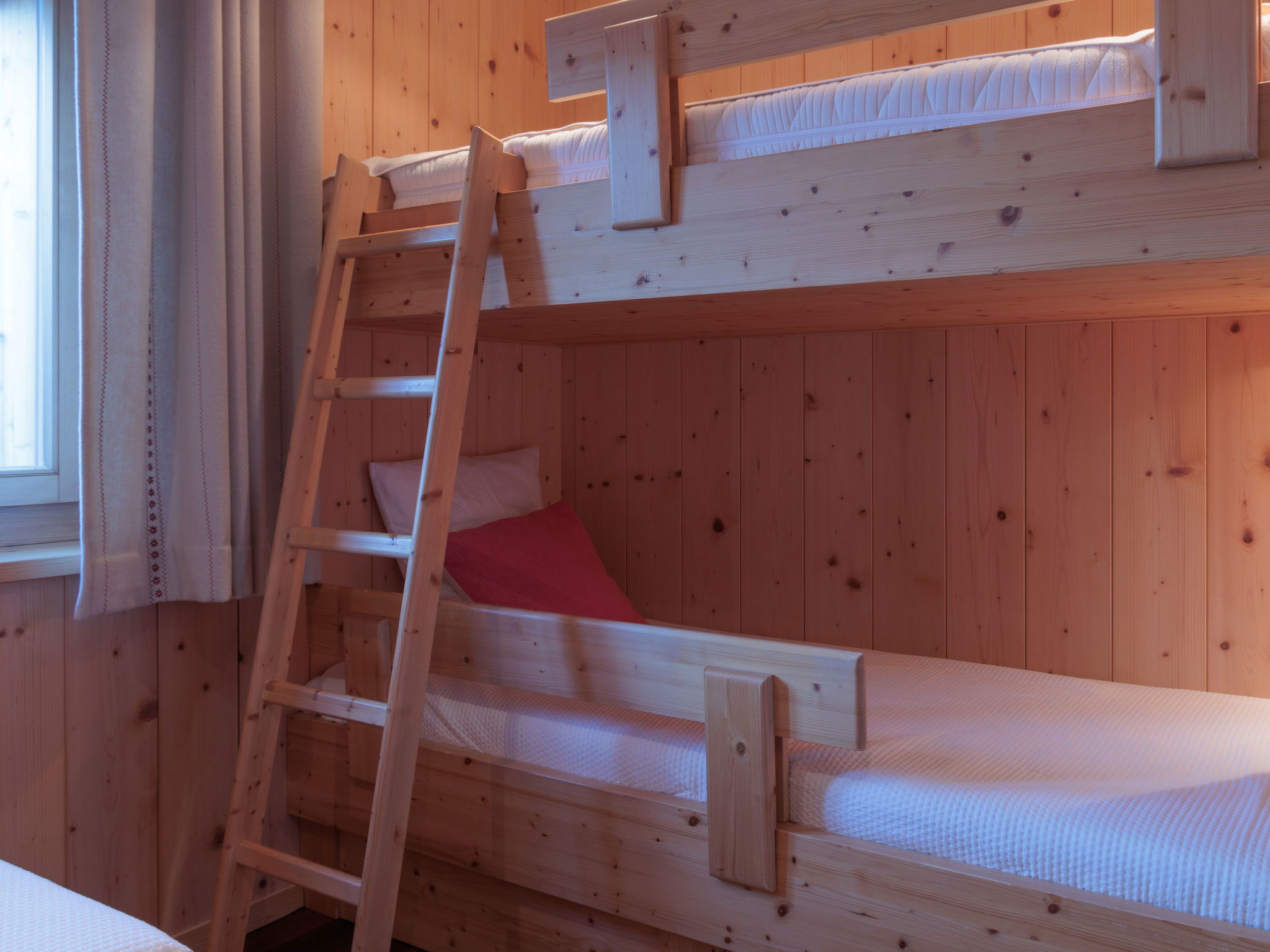 "Chalet Flocon de Neige", 5-room chalet 184 m2 on 2 levels. Comfortable furnishings: large living/dining room with panoramic window with Scandinavian wood stove, dining nook, cable TV and DVD. Open kitchen (oven, dishwasher, 6 induction hot plates, toaster, kettle, microwave, electric coffee machine, Capsules for coffee machine (Nespresso) extra, raclette grill, cooking island, fondue Set (cheese)). Sep. WC. Heating. On the lower ground floor: 2 double bedrooms, each room with 2 beds (90 cm, length 200 cm). 1 children's room with 1 bed (90 cm, length 190 cm), 1 x 2 bunk beds (90 cm, length 190 cm), cable TV, flat screen and DVD. 1 double bedroom with 1 french bed (160 cm, length 190 cm), shower/WC, cable TV and flat screen. Bath/WC, shower/WC. Balcony, north facing position, terrace, west facing position and north facing position. Terrace furniture, barbecue, deck chairs (2). Very beautiful view of the mountains and the valley. Facilities: washing machine, dryer, children's high chair, baby cot, hair dryer. Internet (WiFi, free). Parking (3 cars). Please note: non-smoking house.
