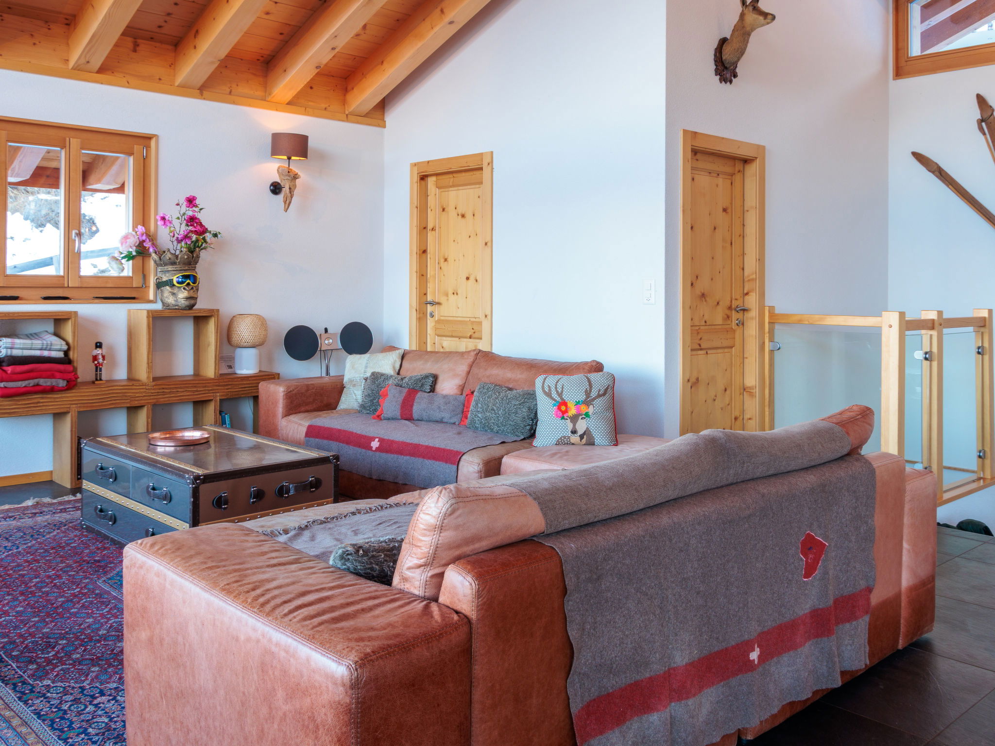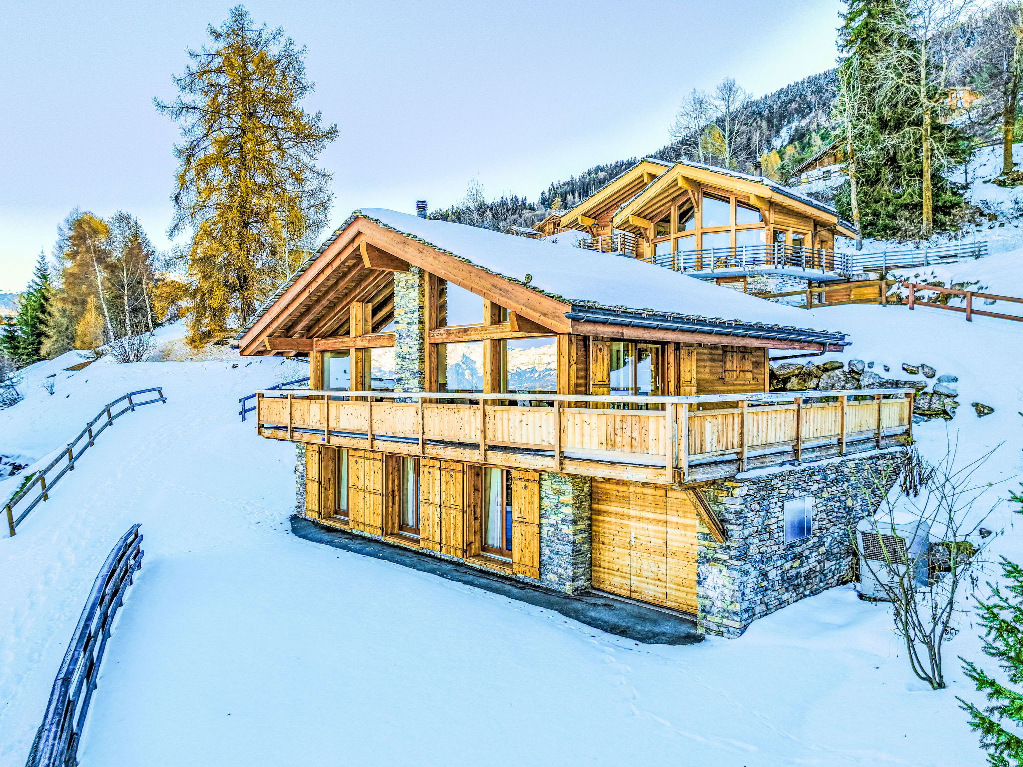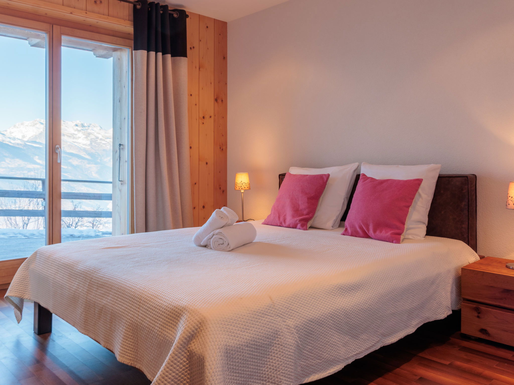 "Chalet Flocon de Neige", 5-room chalet 184 m2 on 2 levels. Comfortable furnishings: large living/dining room with panoramic window with Scandinavian wood stove, dining nook, cable TV and DVD. Open kitchen (oven, dishwasher, 6 induction hot plates, toaster, kettle, microwave, electric coffee machine, Capsules for coffee machine (Nespresso) extra, raclette grill, cooking island, fondue Set (cheese)). Sep. WC. Heating. On the lower ground floor: 2 double bedrooms, each room with 2 beds (90 cm, length 200 cm). 1 children's room with 1 bed (90 cm, length 190 cm), 1 x 2 bunk beds (90 cm, length 190 cm), cable TV, flat screen and DVD. 1 double bedroom with 1 french bed (160 cm, length 190 cm), shower/WC, cable TV and flat screen. Bath/WC, shower/WC. Balcony, north facing position, terrace, west facing position and north facing position. Terrace furniture, barbecue, deck chairs (2). Very beautiful view of the mountains and the valley. Facilities: washing machine, dryer, children's high chair, baby cot, hair dryer. Internet (WiFi, free). Parking (3 cars). Please note: non-smoking house.