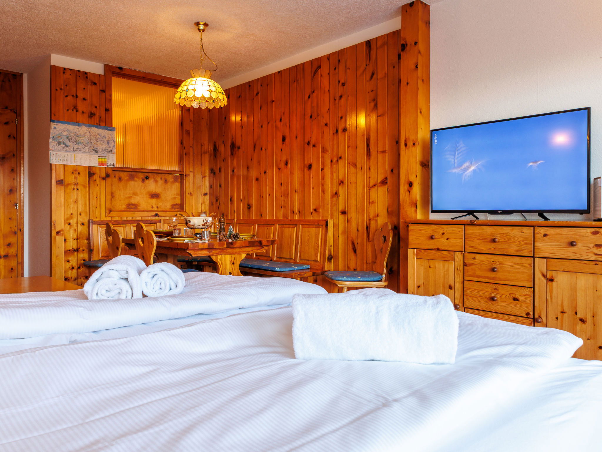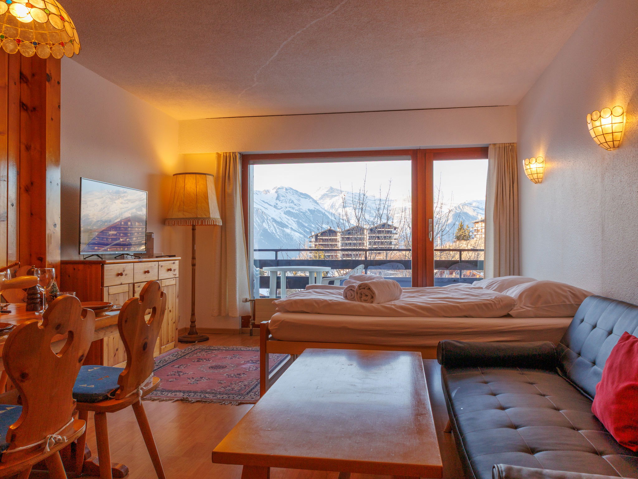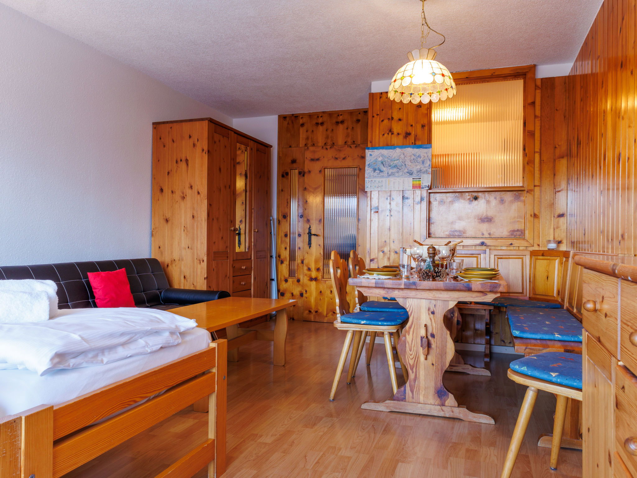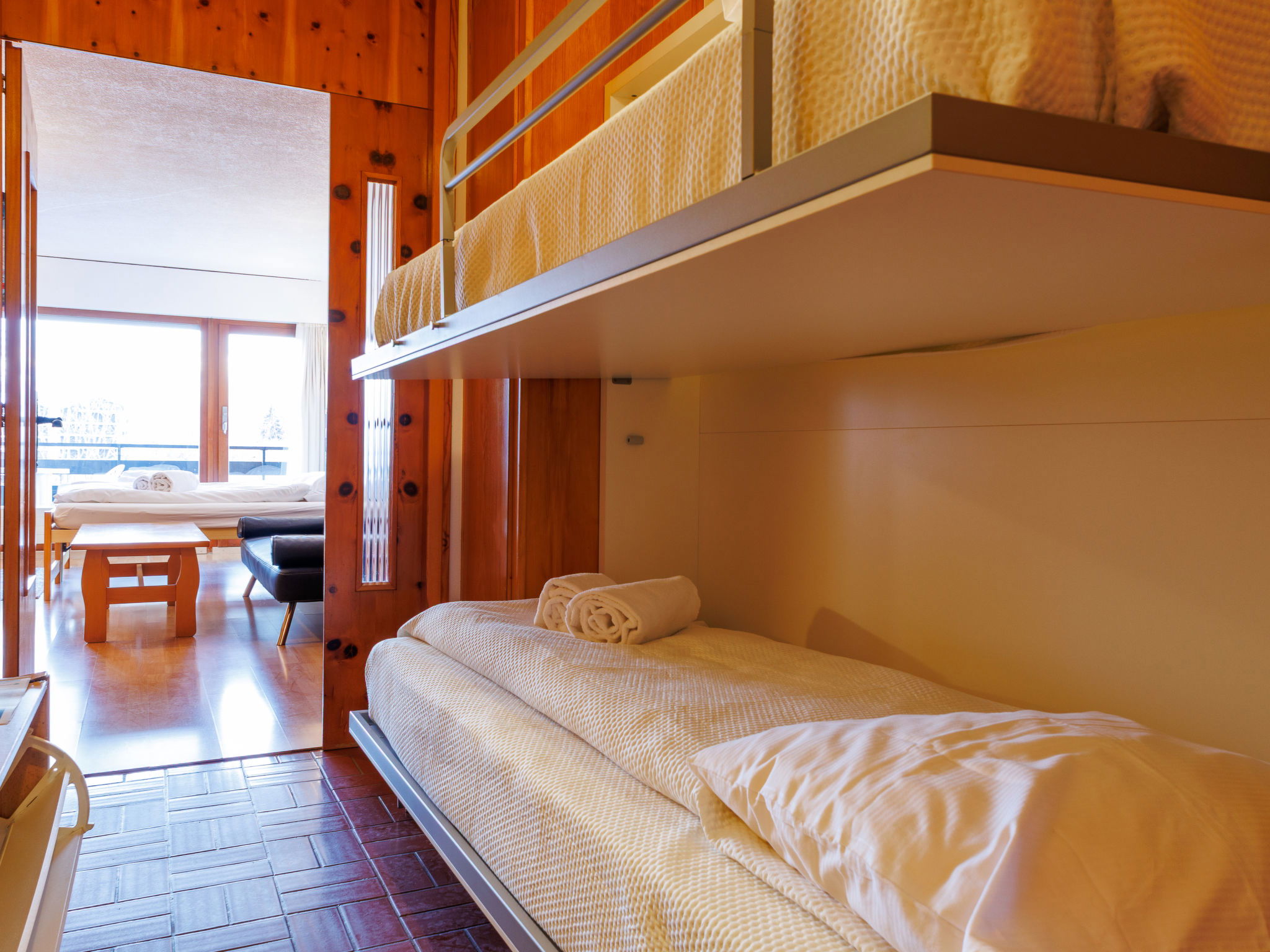 "Christiania 2 Sbel", 1-room apartment 38 m2, on the upper ground floor. Living/dining room with 1 pull-out bed (2 pers. 2 x 90 cm, length 190 cm), cable TV (flat screen). Exit to the balcony. Entrance hall with 1 x 2 bunk beds (80 cm, length 180 cm). Kitchen (3 hot plates, oven, toaster, kettle, microwave, electric coffee machine, Capsules for coffee machine (Delizio) extra, fondue Set (chinoise, cheese)). Bath/WC. Balcony, north facing position. View of the mountains and the resort. Facilities: hair dryer. Internet (WiFi, free). Please note: non-smokers only, no parking. Maximum 1 pet/ dog allowed. Instead of an enclosed bedroom, some sleeping areas are located in an open-plan area (gallery, alcove, etc.).
