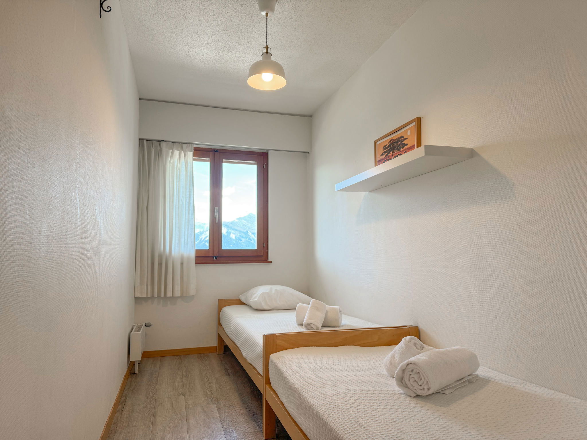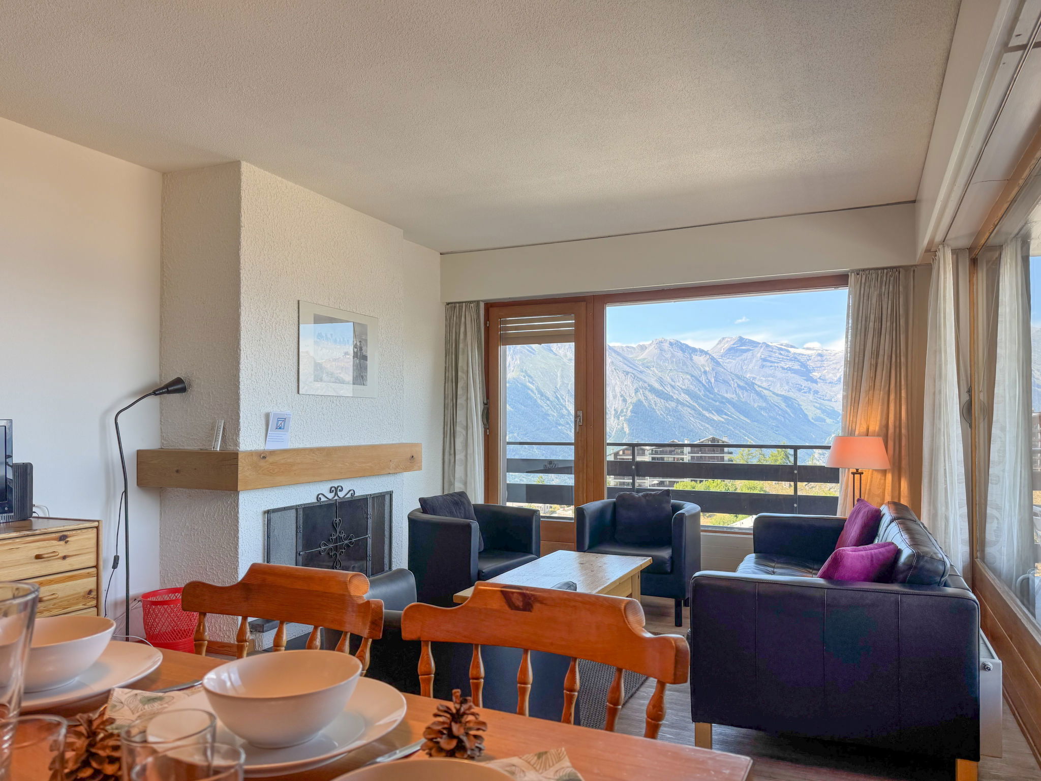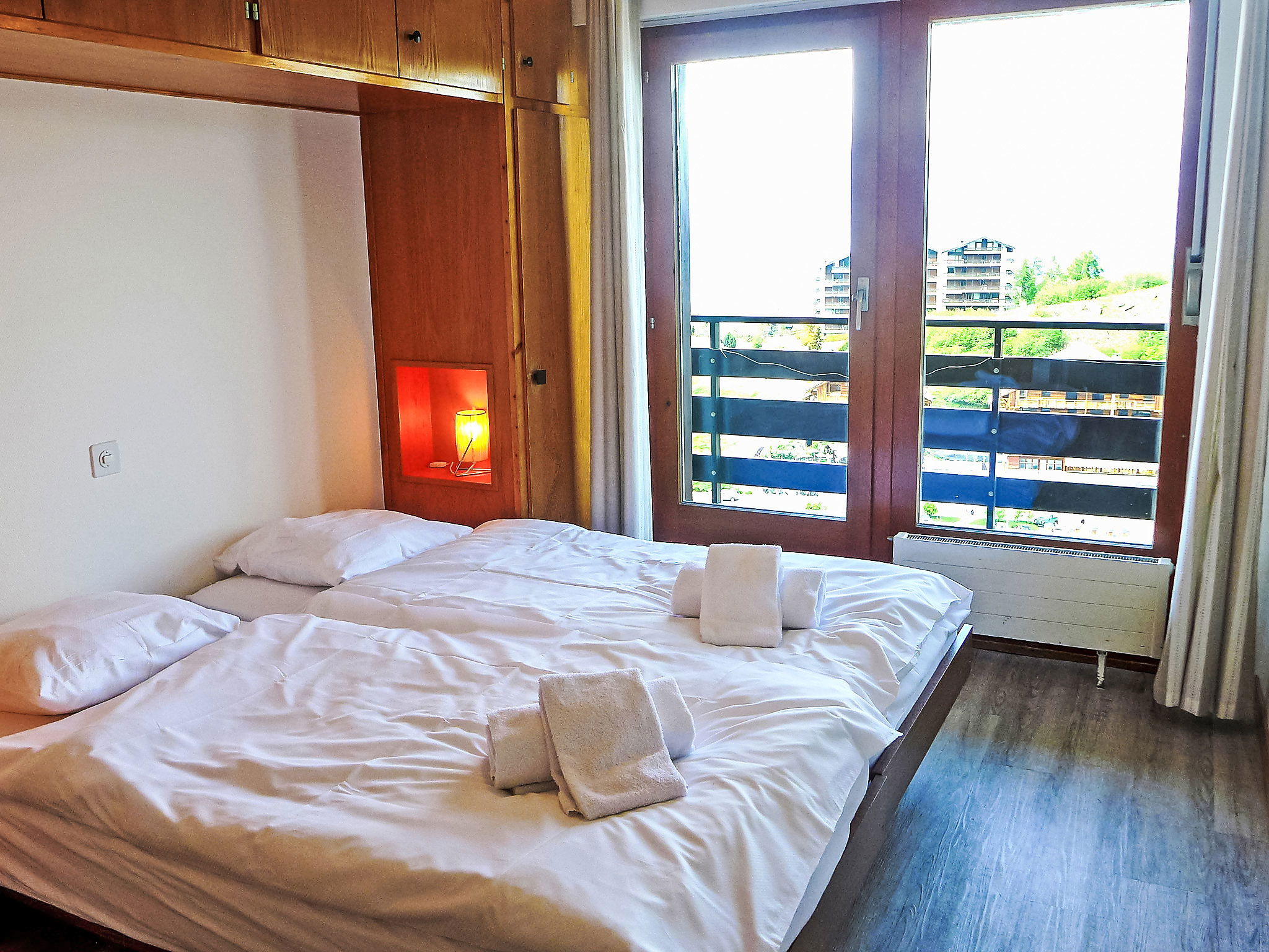 "Christiania I F6", 3-room apartment 70 m2 on 6th floor. Entrance hall with 1 x 2 bunk beds (90 cm, length 190 cm). Living/dining room with open-hearth fireplace (only for decoration), cable TV and flat screen. 1 room with 2 beds (90 cm, length 190 cm). Exit to the balcony, north facing position. 1 small room with 2 beds (90 cm, length 190 cm). Kitchen (3 hot plates, oven, toaster, kettle, microwave, electric coffee machine, raclette grill, fondue Set (cheese)). Bath/WC, sep. WC. Balcony, north facing position balcony, east facing position. Beautiful view of the mountains and the resort. Facilities: Internet (WiFi, free). Parking space n 6A (roofed), height 190 cm, width 210 cm. Please note: fridge without freezer, non-smokers only. Maximum 1 pet/ dog allowed. Instead of an enclosed bedroom, some sleeping areas are located in an open-plan area (gallery, alcove, etc.).