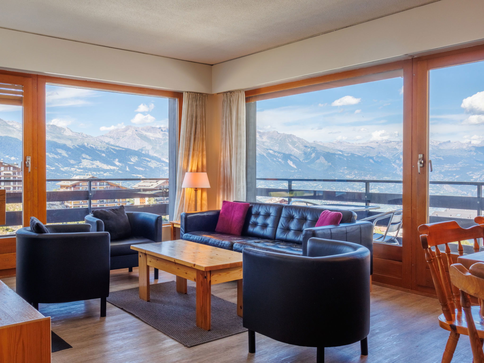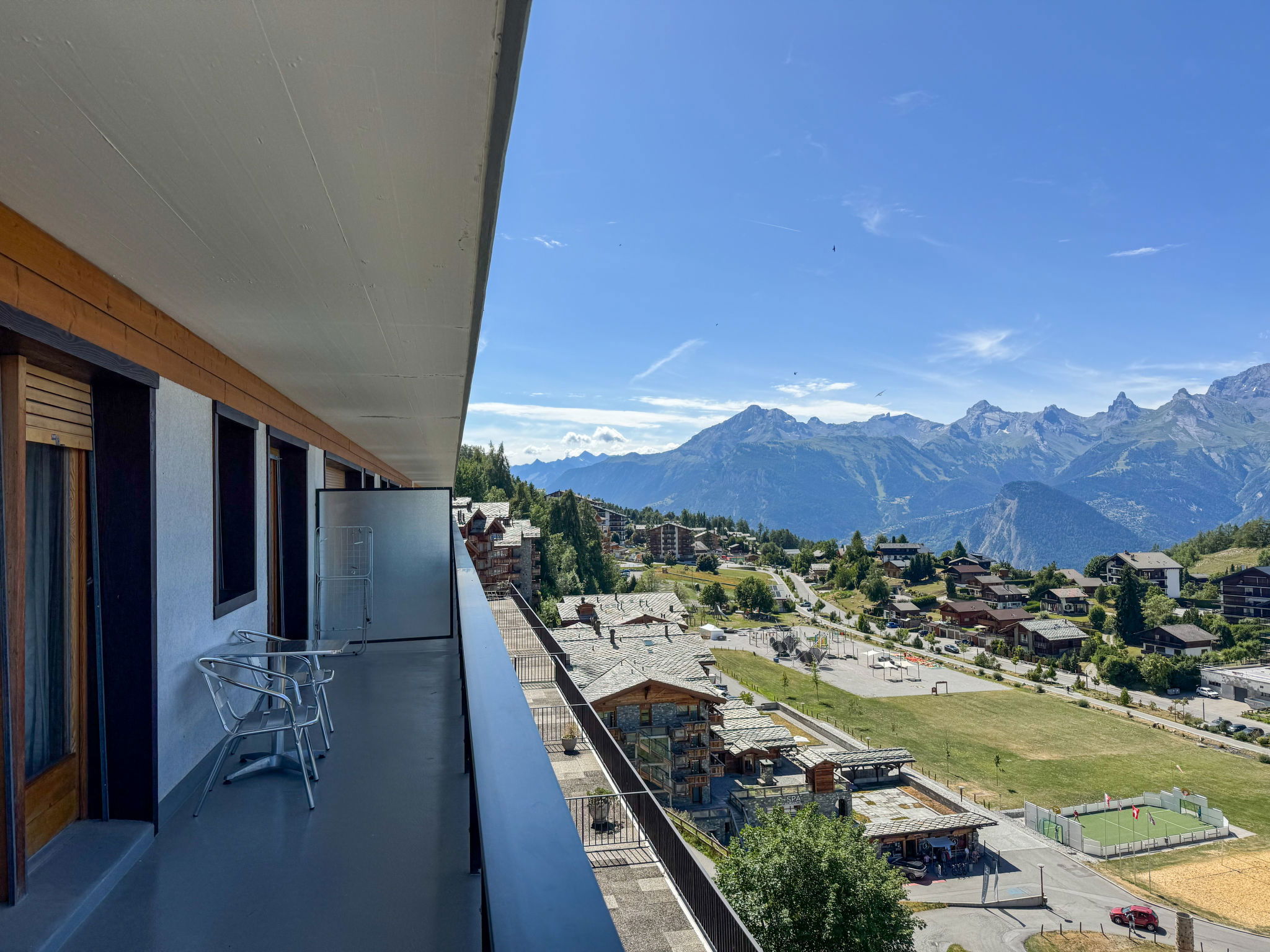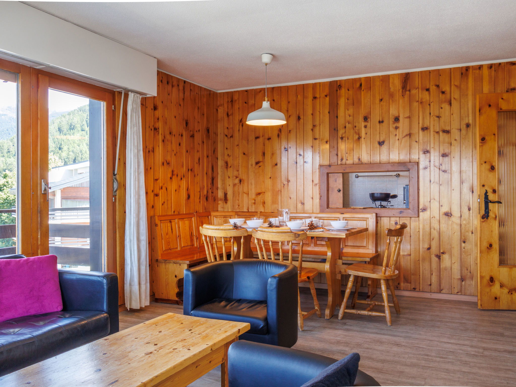 "Christiania I F6", 3-room apartment 70 m2 on 6th floor. Entrance hall with 1 x 2 bunk beds (90 cm, length 190 cm). Living/dining room with open-hearth fireplace (only for decoration), cable TV and flat screen. 1 room with 2 beds (90 cm, length 190 cm). Exit to the balcony, north facing position. 1 small room with 2 beds (90 cm, length 190 cm). Kitchen (3 hot plates, oven, toaster, kettle, microwave, electric coffee machine, raclette grill, fondue Set (cheese)). Bath/WC, sep. WC. Balcony, north facing position balcony, east facing position. Beautiful view of the mountains and the resort. Facilities: Internet (WiFi, free). Parking space n 6A (roofed), height 190 cm, width 210 cm. Please note: fridge without freezer, non-smokers only. Maximum 1 pet/ dog allowed. Instead of an enclosed bedroom, some sleeping areas are located in an open-plan area (gallery, alcove, etc.).