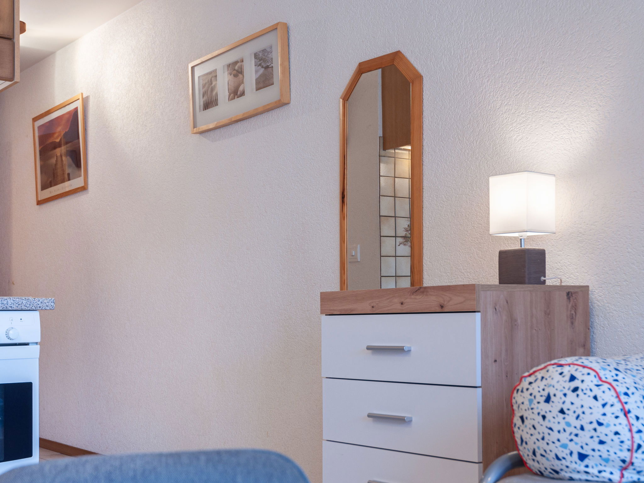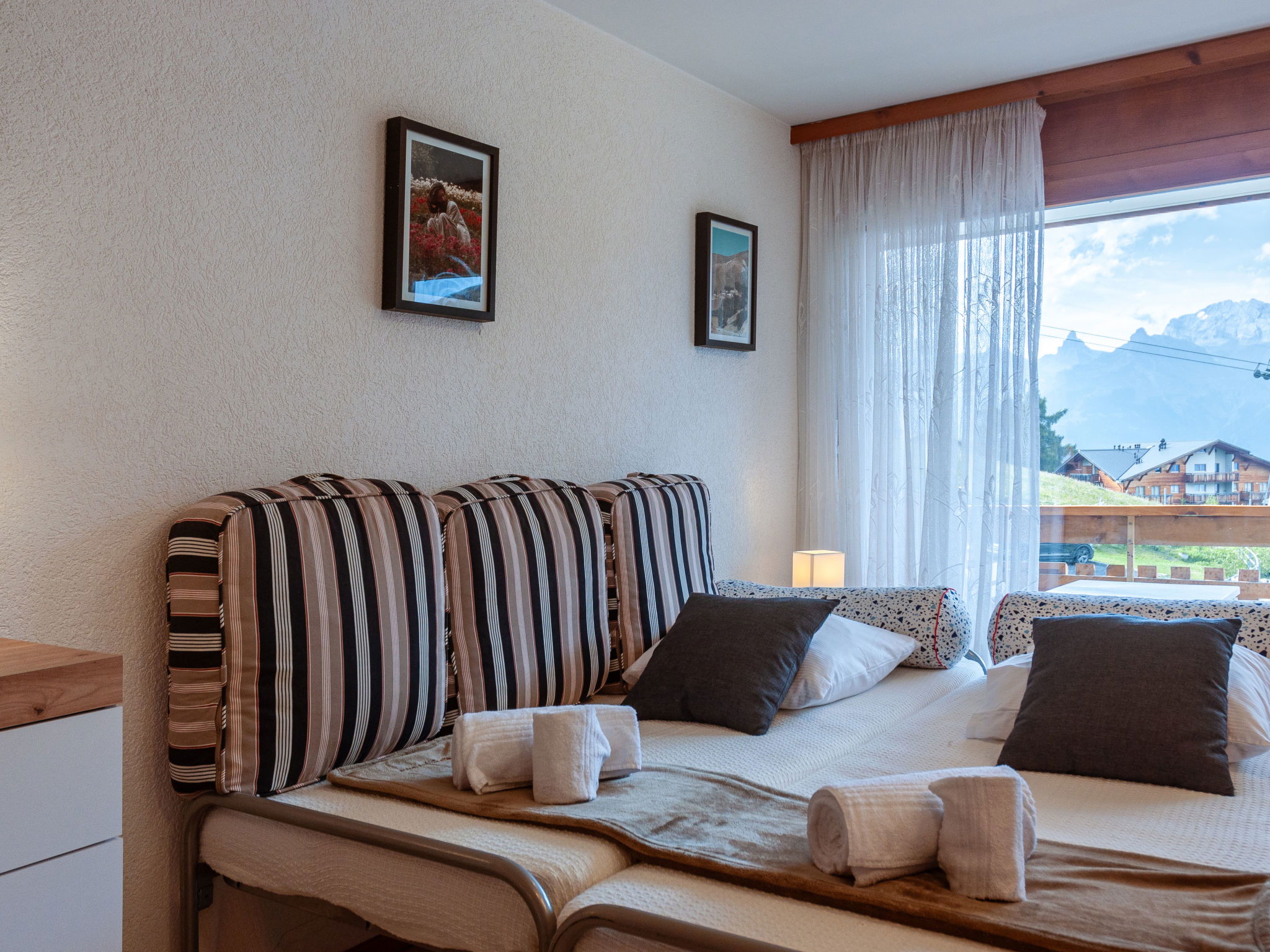 "Victoria 1 B1", 1-room apartment 31 m2 on 1st floor, north-west facing position. Practical and beautiful furnishings: entrance hall with 1 x 2 bunk beds (90 cm, length 190 cm). Living/dining room with 2 pull-out beds (2 pers. 2 x 90 cm, length 200 cm), cable TV and DVD. Exit to the balcony, north facing position and west facing position. Open kitchen (4 hot plates, oven, dishwasher, microwave, electric coffee machine, Capsules for coffee machine (nespresso) extra, raclette grill, fondue Set (cheese)). Shower/WC. Balcony furniture. Beautiful view of the mountains and the ski run. Facilities: hair dryer. Internet (WiFi, free). Parking space n C1 dans la montée. Please note: non-smokers only. Maximum 1 pet/ dog allowed. This apartment can be rented with the apartment Victoria C1 because they are both contiguous and can be reached directly by their 2 balconies. Instead of an enclosed bedroom, some sleeping areas are located in an open-plan area (gallery, alcove, etc.).
