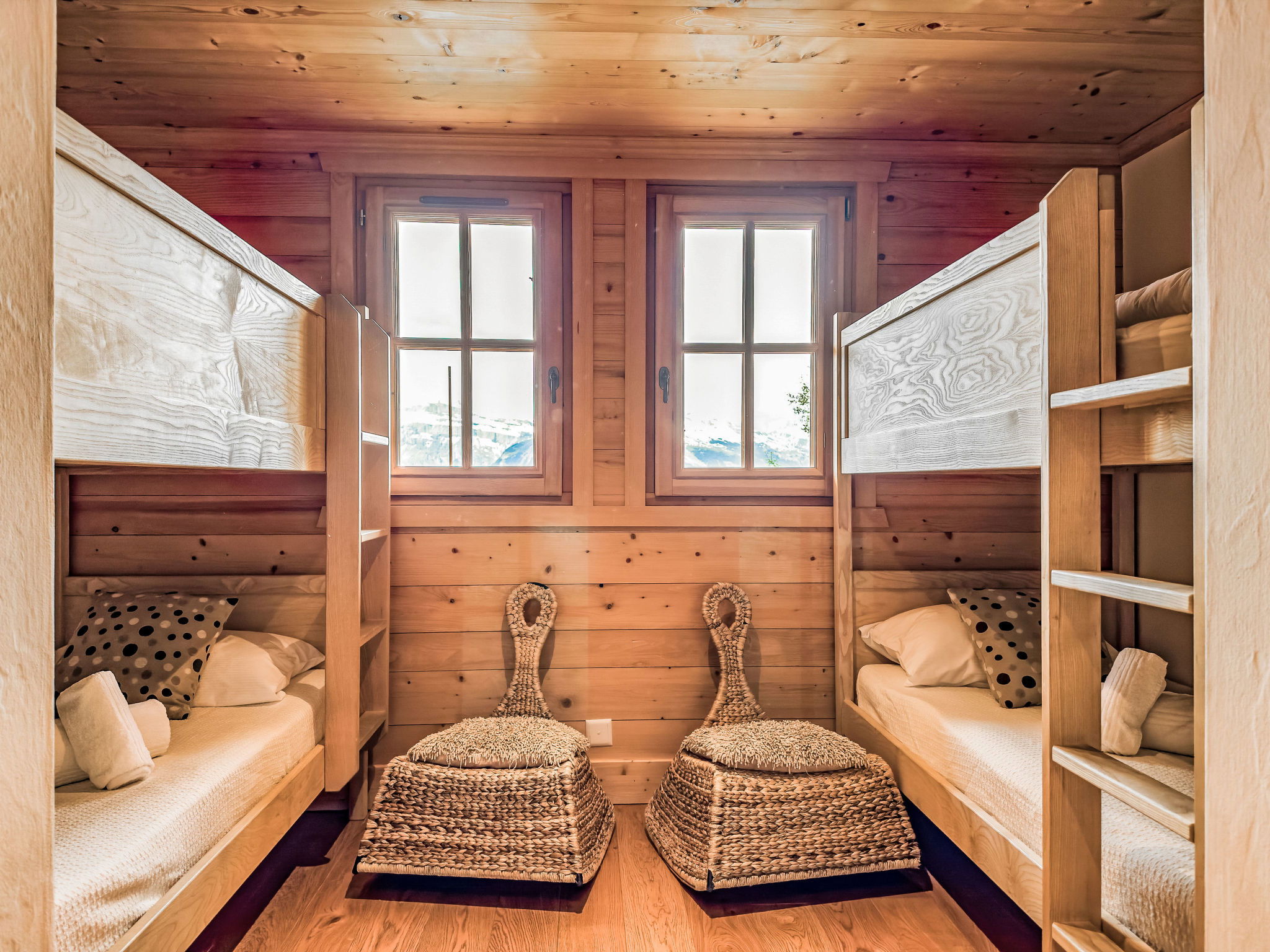 "Gingembre 12", 7-room chalet 250 m2 on 3 levels. Spacious, partly renovated in 2023, comfortable and beautiful furnishings: entrance hall. Large living/dining room 60 m2 with Scandinavian wood stove and cable TV. Exit to the terrace. Large, open kitchen (oven, dishwasher, 4 induction hot plates, toaster, kettle, microwave, freezer, electric coffee machine, Capsules for coffee machine (nespresso), raclette grill, fondue Set (cheese)). On the lower ground floor: 2 rooms, each room with 1 double bed (2 x 90 cm, length 200 cm), shower/WC. Exit to the terrace. 1 room with 2 x 2 bunk beds. Bath/WC. Underfloor heating. Upper floor: 1 room with 1 double bed (2 x 90 cm, length 200 cm), bath/WC. Exit to the balcony. 1 room with 1 double bed (2 x 90 cm, length 200 cm), shower/WC. Exit to the balcony. 2 small balconies, south facing position balcony, north facing position terrace, south facing position and west facing position. Barbecue, deck chairs (2). Very beautiful view of the mountains and the valley. Facilities: washing machine, dryer, sauna, children's high chair, baby cot for up to 2 year olds, hair dryer. Internet (WiFi, free). Parking (2 cars), in winter at 500 m. Please note: non-smokers only.