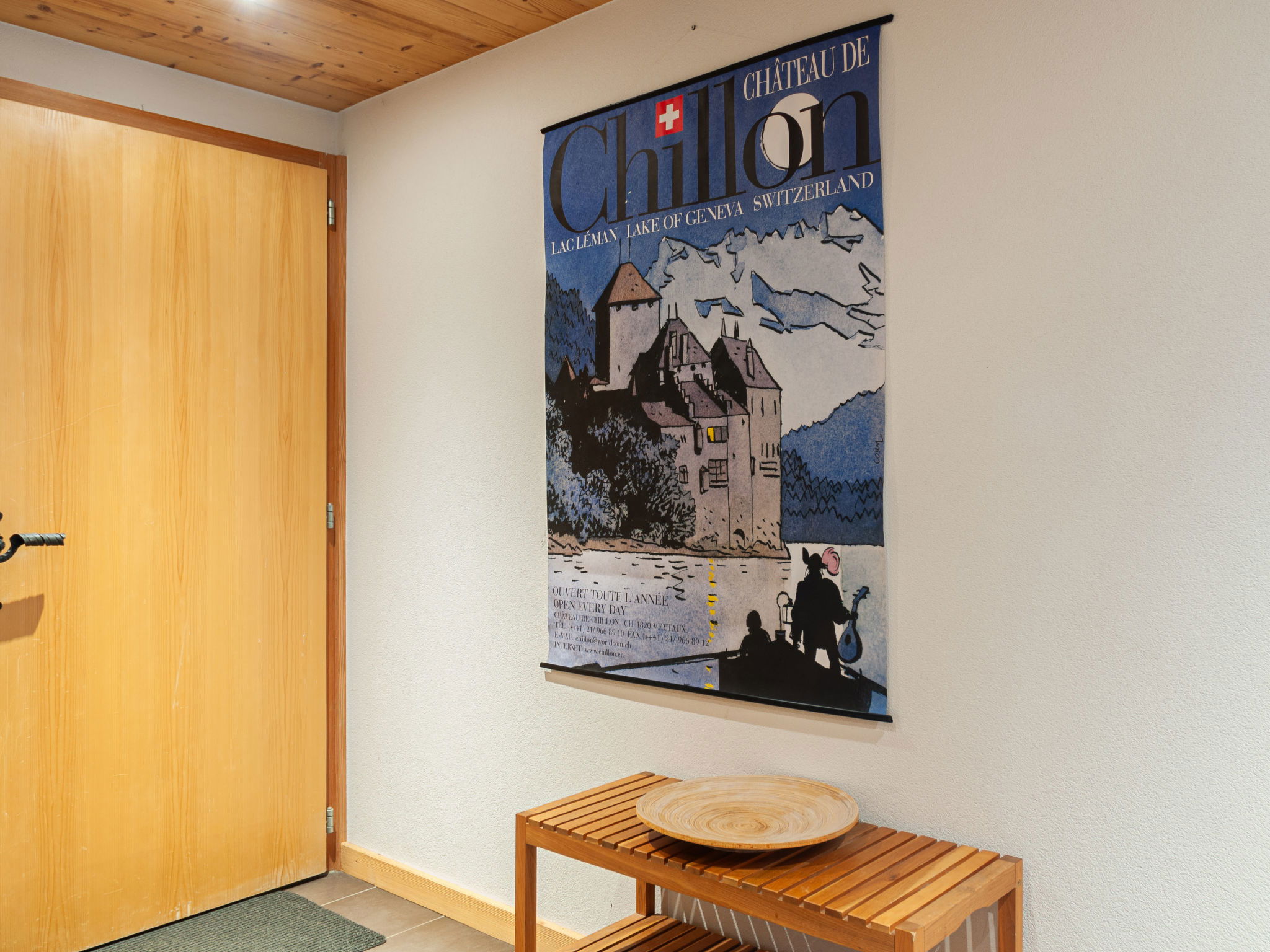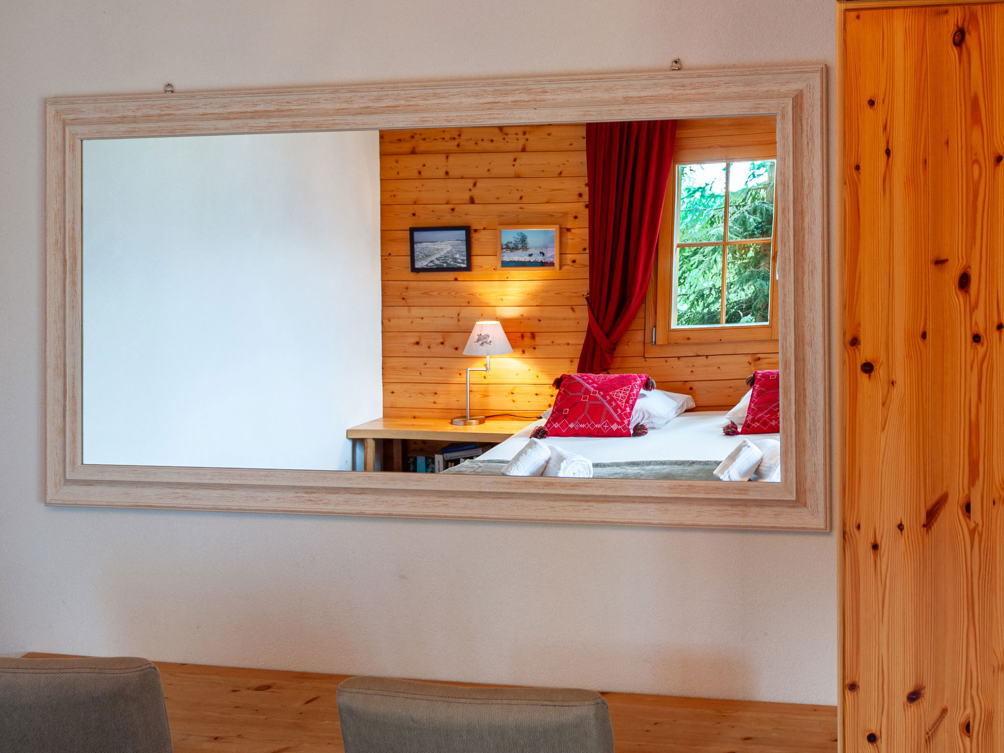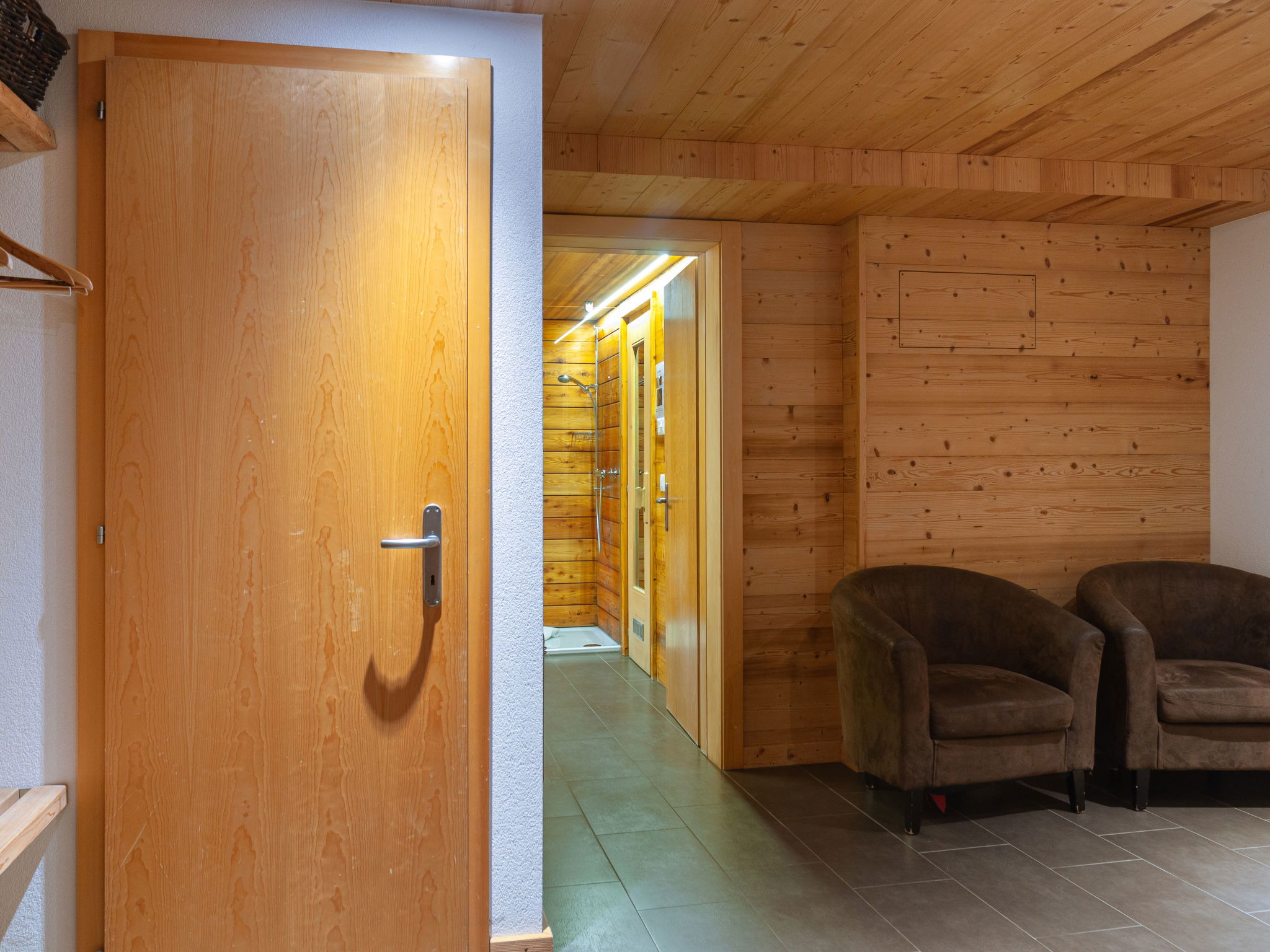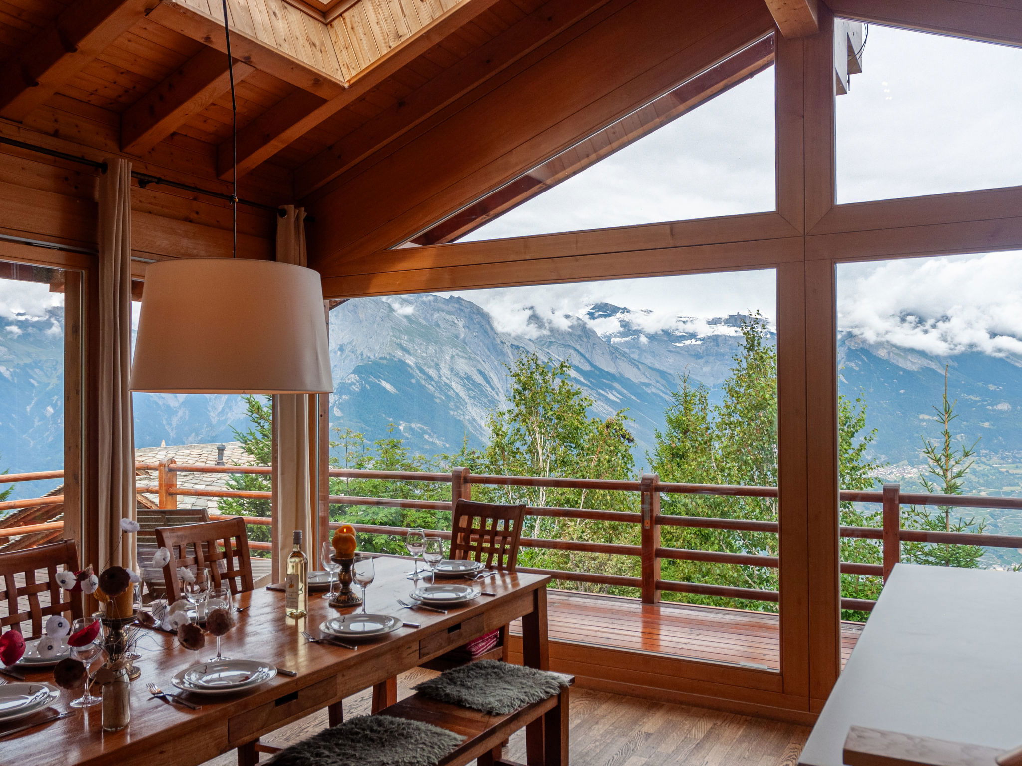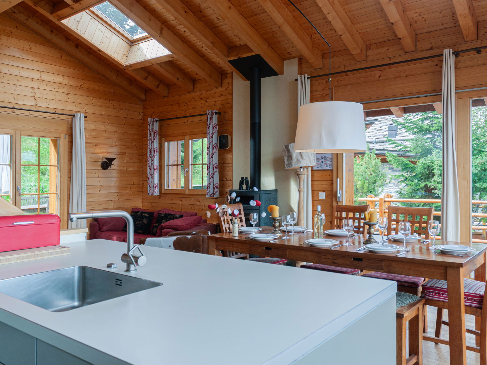 "Mimique", 5-room chalet 180 m2 on 3 levels. Bright, renovated in 2014, comfortable furnishings: living/dining room with panoramic window with Scandinavian wood stove, satellite TV, cable TV, CD-player, hi-fi system and DVD. Exit to the terrace, north-west facing position. 1 room with 1 french bed (180 cm, length 200 cm). Exit to the terrace, north facing position. Open kitchen (oven, dishwasher, 4 ceramic glass hob hotplates, toaster, kettle, microwave, freezer, electric coffee machine, Capsules for coffee machine (Nespresso) extra, raclette grill, fondue Set (cheese)). Bath/shower, sep. WC, double hand-basin. Heating. On the lower ground floor: entrance hall. 1 large room with 1 french bed (160 cm, length 200 cm), cable TV and flat screen. Exit to the terrace, north facing position. Shower, sep. WC, double hand-basin, Sauna. Upper floor: 1 room with sloping ceilings with 1 french bed (180 cm, length 200 cm). Exit to the balcony, north facing position. 1 room with sloping ceilings with 2 beds (90 cm, length 200 cm). Shower/WC. Terrace 55 m2, west facing position and south facing position. Terrace furniture, barbecue (portable), deck chairs (3). Marvellous view of the mountains and the valley. Facilities: washing machine, dryer, sauna, children's high chair, baby cot, hair dryer. Internet (WiFi, free). Parking (2 cars), garage, height 210 cm, width 250 cm. Please note: non-smokers only.