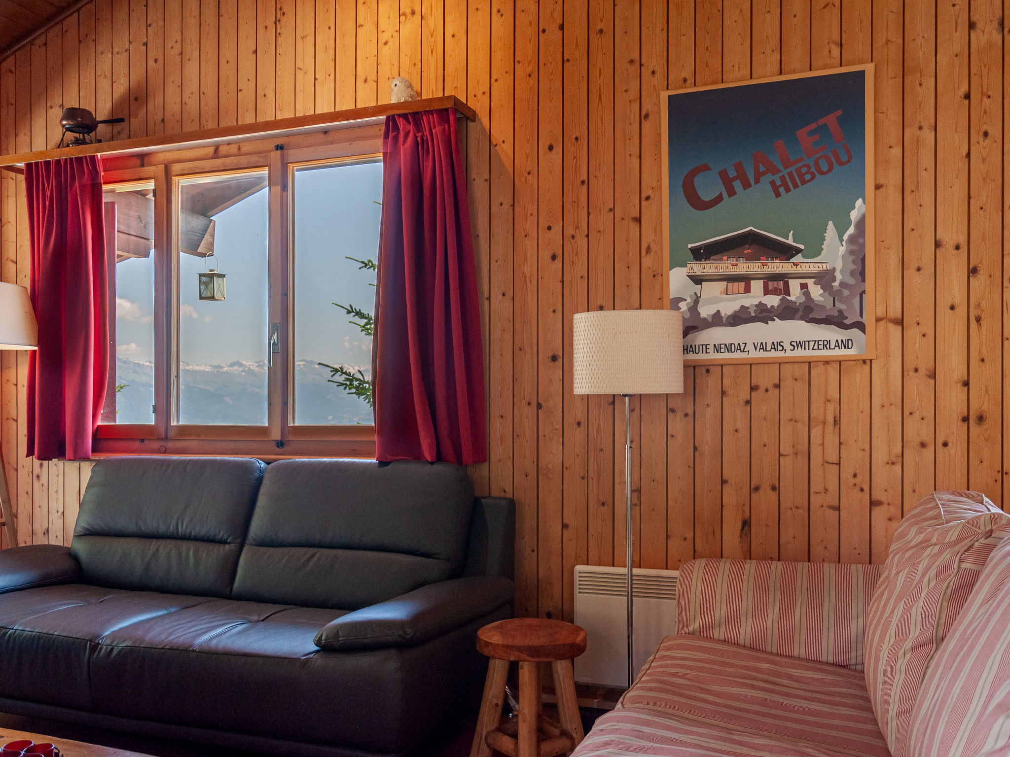 Pattier Haut: Chalet "Le Hibou". On the outskirts, 1.2 km from the centre of (600m by foot), in a quiet position. Private: garden with lawn. In the house: washing machine. Steep motor access to the house. In Winter: please take snow chains. Parking. Supermarket 1.5 km, restaurant 1.2 km, bakery 1.5 km, bus stop "Haute-Nendaz, La Crettaz" 600 m, railway station "Sion" 15.7 km. Golf course (18 hole) 18 km, tennis 2 km, skisport facilities 1.6 km, ski bus stop 100 m. Well-known ski regions can easily be reached: Nendaz 4 Vallées 1.6 km. Hiking paths: Bisse du Milieu 600 m. Please note: ski bus (free of charge).