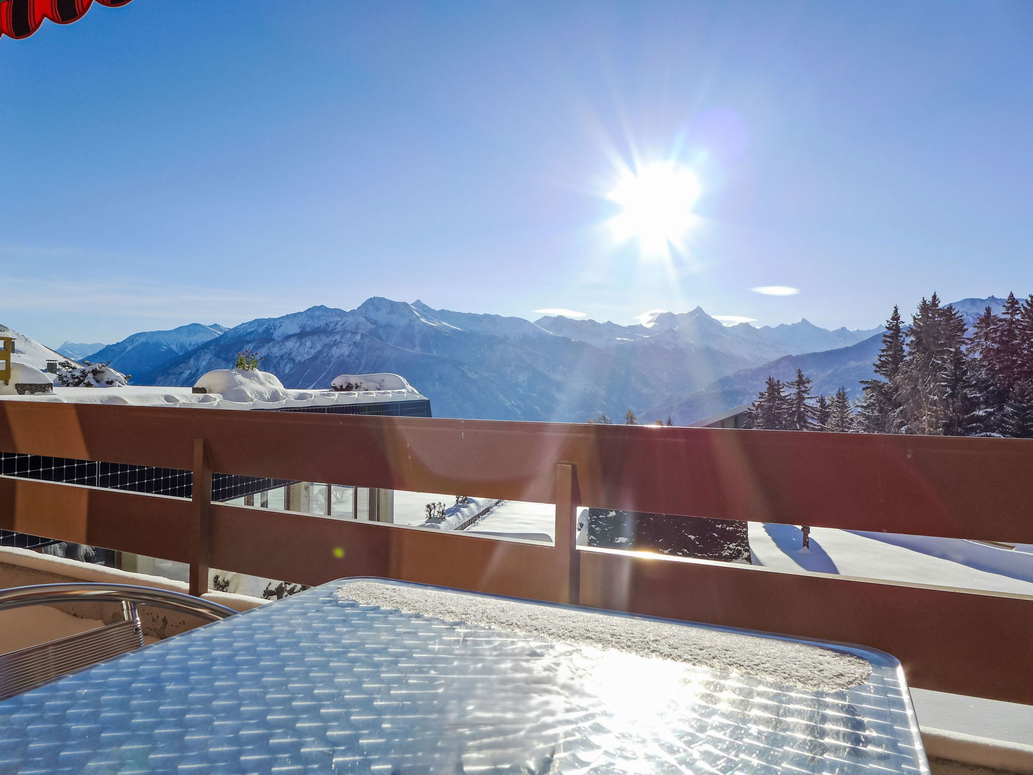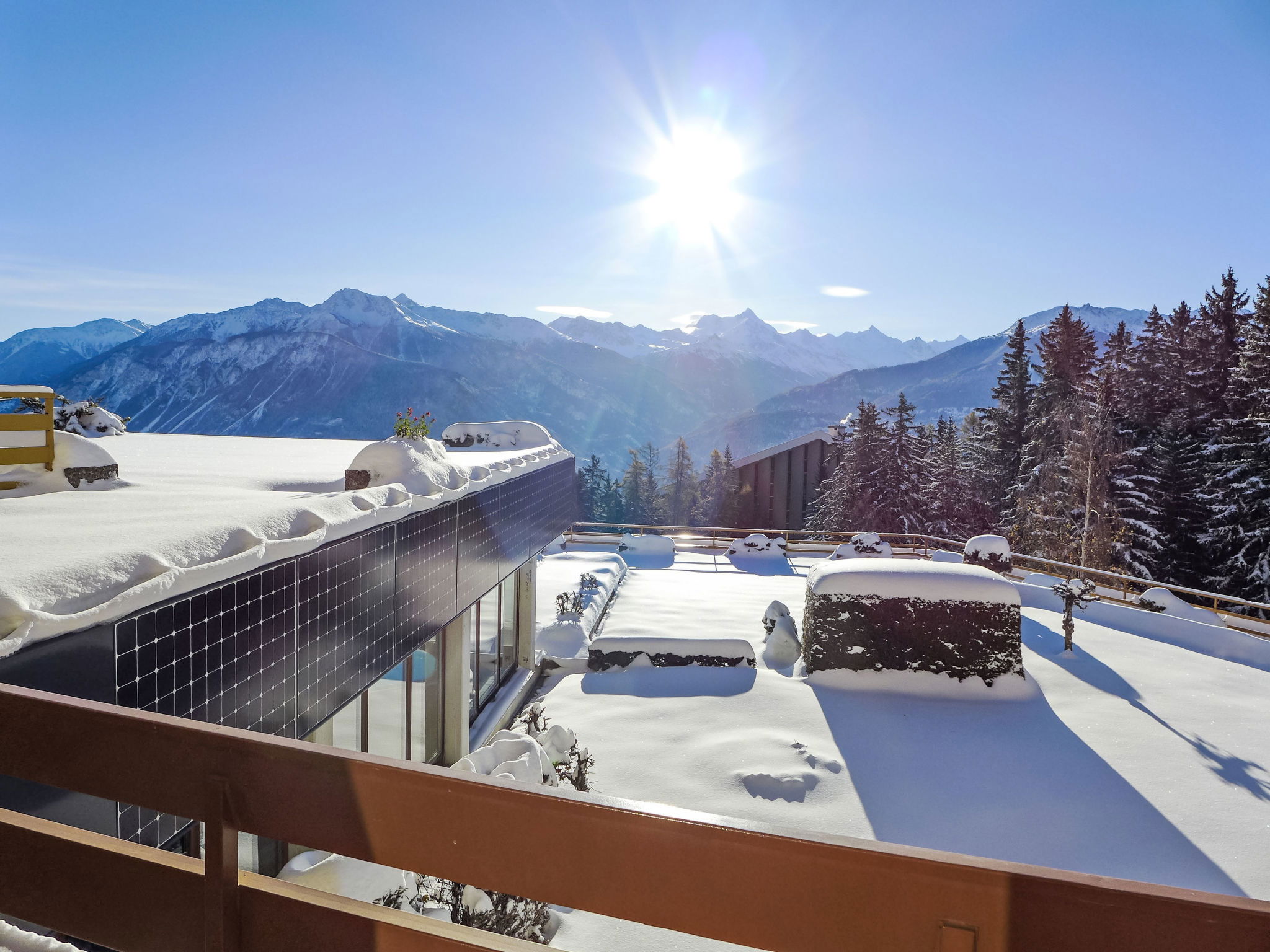 Swimming pool (approx. 26°) and hot tub (from 16 years old) closed in November. The building was built on a sloping plot. The floors are considered as levels numbered from the residence floor. In case of heavy snowfall, it is forbidden to clear snow from the terraces, according to the administrator's instructions. Hillside complex "Terrasse des Alpes". In the district of Marigny 400 m from the centre of Montana, in a sunny position, 1.5 km from the lake, 1.5 km from the skiing area, south-west facing position. For shared use: indoor pool heated (12 x 5 m, seasonal availability: 01.Jan. - 31.Oct. and 16.Dec. - 31.Dec. pool opening hours: 08:00-20:00). Hot tub, terrace. In the house: lounge, lift, storage room for skis, central heating system, washing machine, tumble dryer (for shared use, extra). Shop, supermarket, restaurant, bar, café 400 m, 5 minute walk to the centre, bus stop "Montana Poste" 300 m, railway station "Funiculaire Montana Gare" 450 m, bathing lake "Moubra" 1.5 km. Golf course (18 hole) 3.8 km, skisport facilities 1.5 km. Please note: ski bus (free of charge).