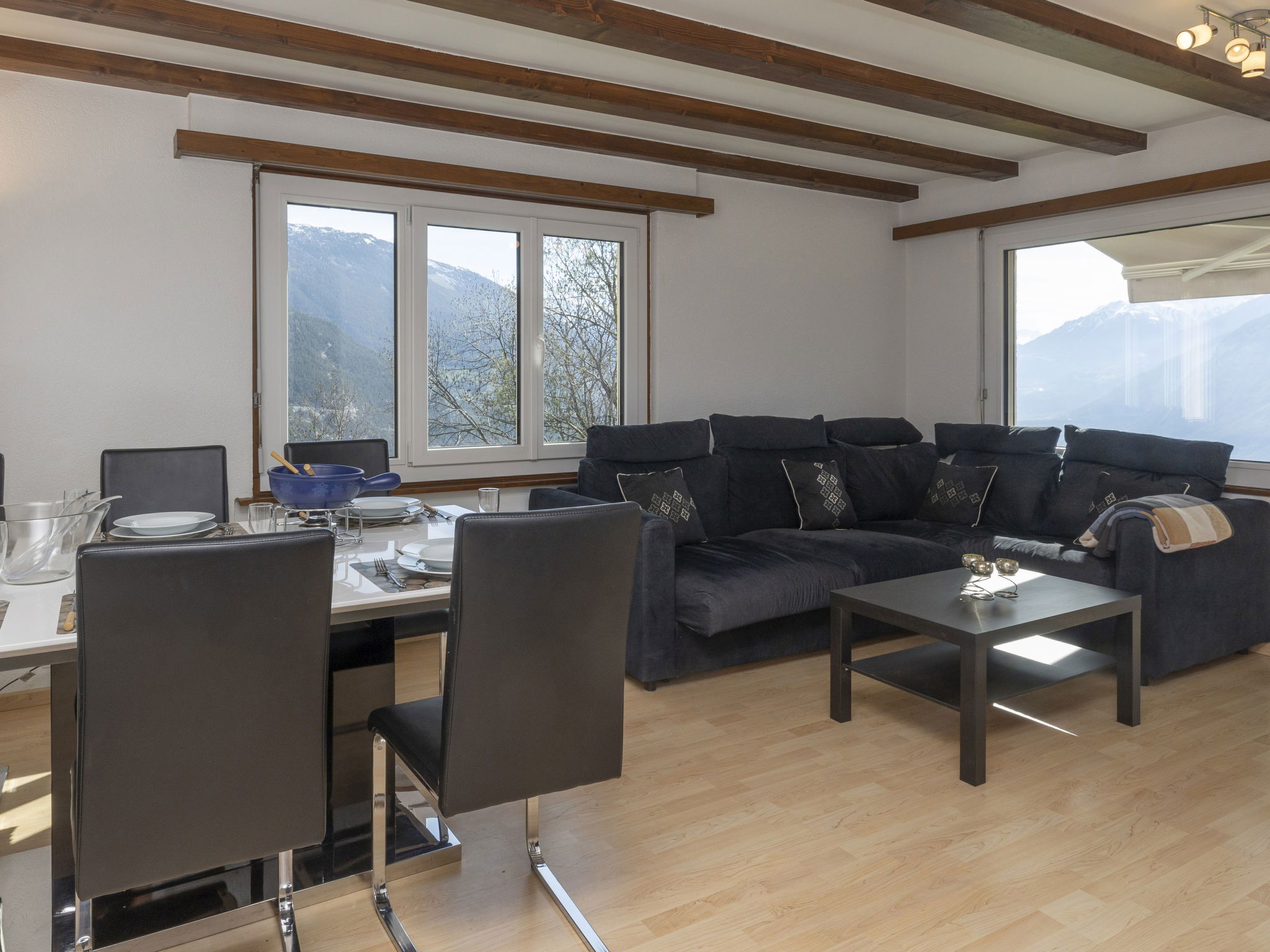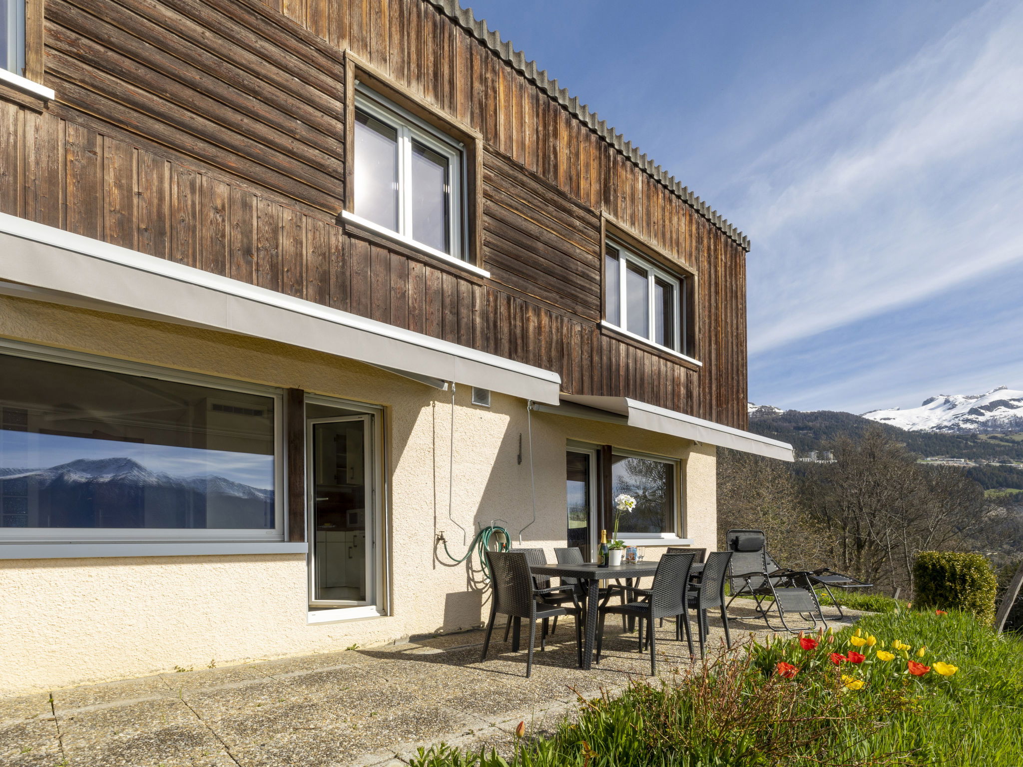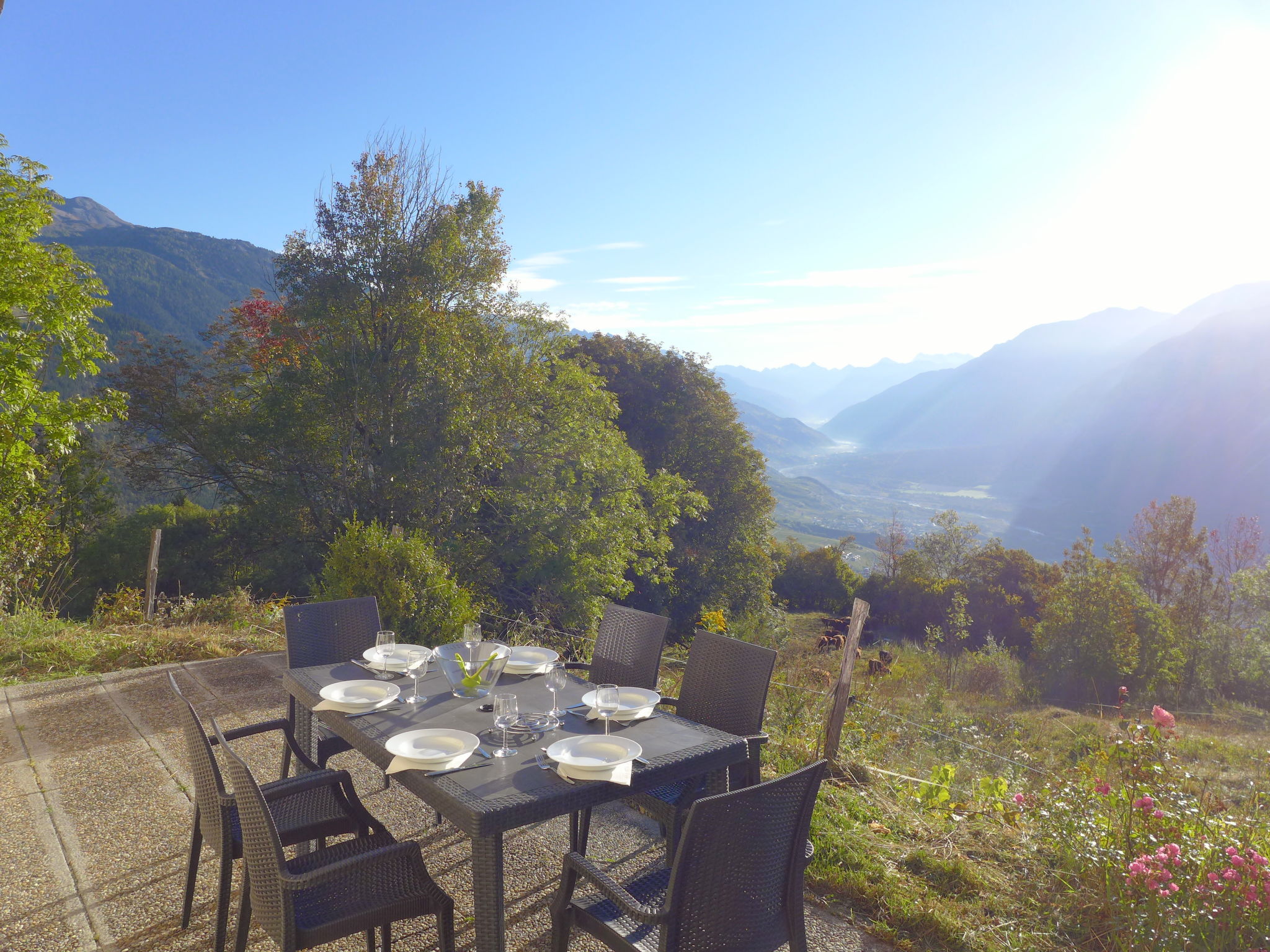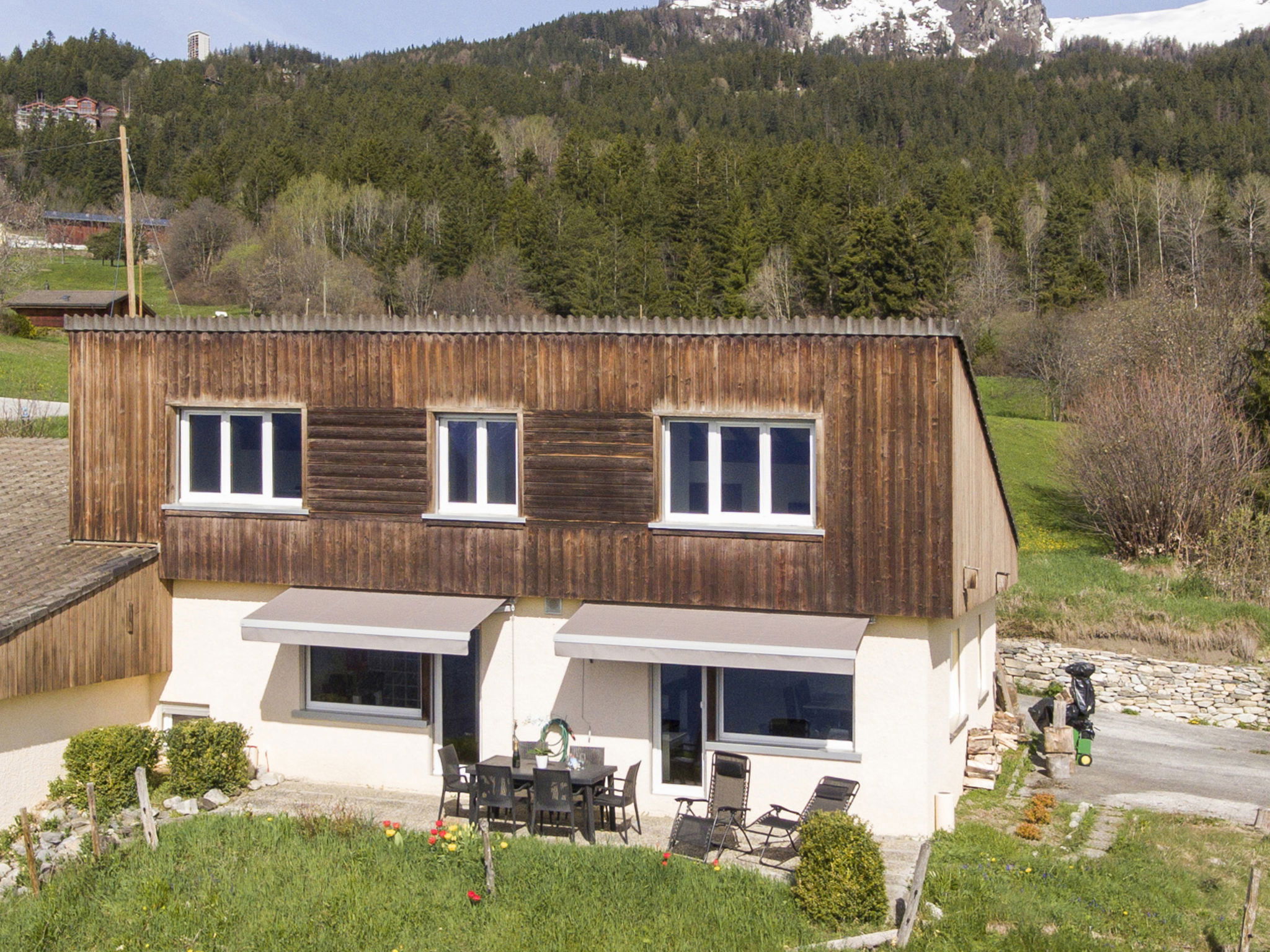 "Maison Le Fontany", 4-room chalet 110 m2 on 2 levels, south facing position. Spacious and bright, partly renovated in 2023, beautiful and modern furnishings: living/dining room with open-hearth fireplace and cable TV. Exit to the terrace, south facing position. 1 double bedroom, east facing position with 1 double bed (160 cm, length 200 cm). Kitchen-/living room (dishwasher, 4 ceramic glass hob hotplates, toaster, kettle, microwave, freezer, electric coffee machine, Capsules for coffee machine (Delizio (Migros)) extra, raclette grill, fondue Set (cheese)) with dining table. Exit to the terrace, south facing position. Bath/WC. Heating. Upper floor: (open staircase), 1 room, south facing position with 1 double bed (160 cm, length 200 cm), hand-basin and shower. 1 room, south facing position with 1 double bed (160 cm, length 200 cm), hand-basin. Sep. WC. Parquet floors. Terrace 30 m2. Terrace furniture, barbecue (portable), deck chairs (2). Very beautiful panoramic view of the mountains, the valley and the countryside. Facilities: washing machine, dryer, hair dryer. Internet (WiFi, free). Parking (2 cars) at the house, in winter at 30 m. Please note: non-smoking house. Maximum 2 pets/ dogs allowed. Cows may be present in the fenced yard just in front of the House.