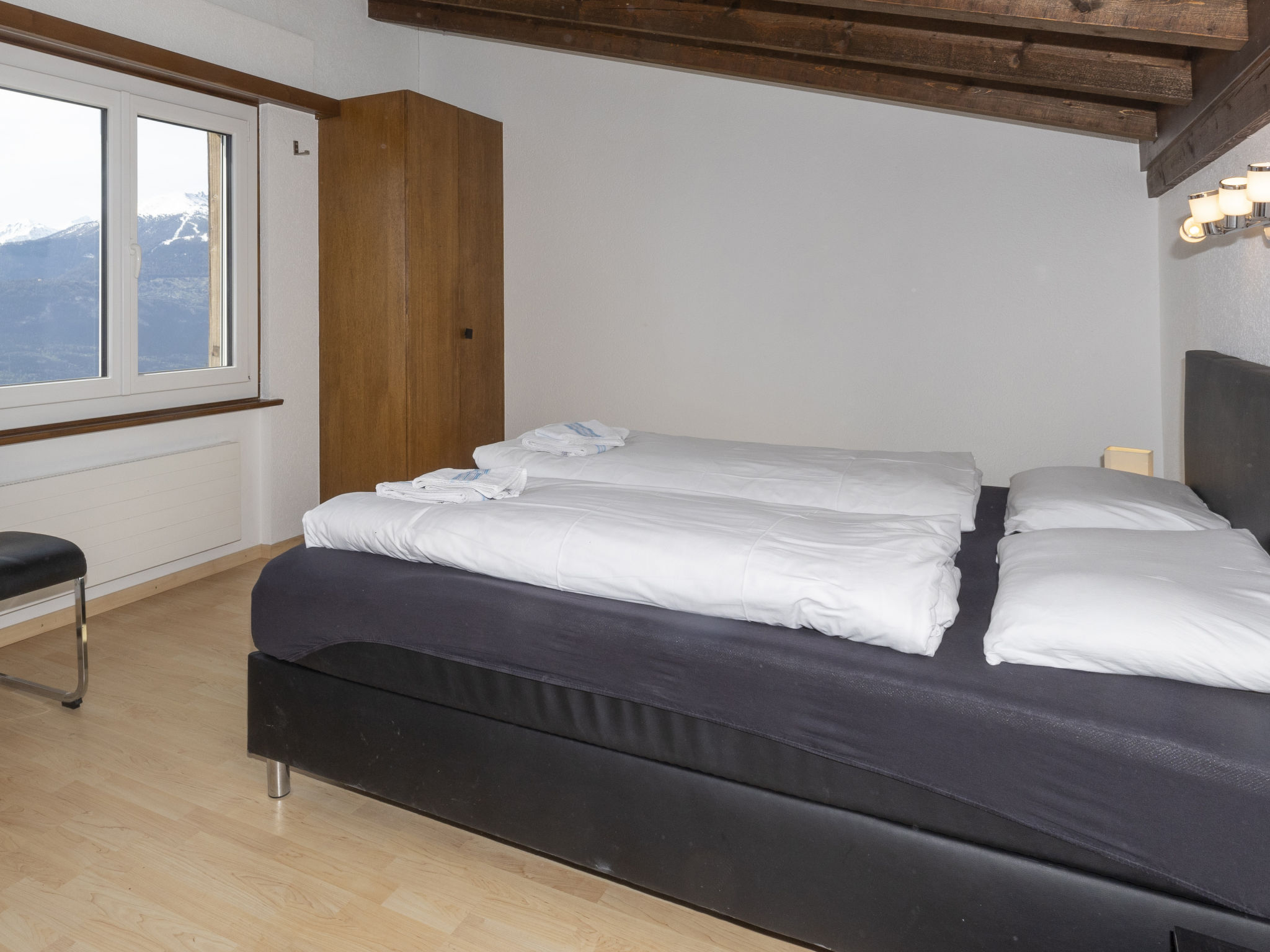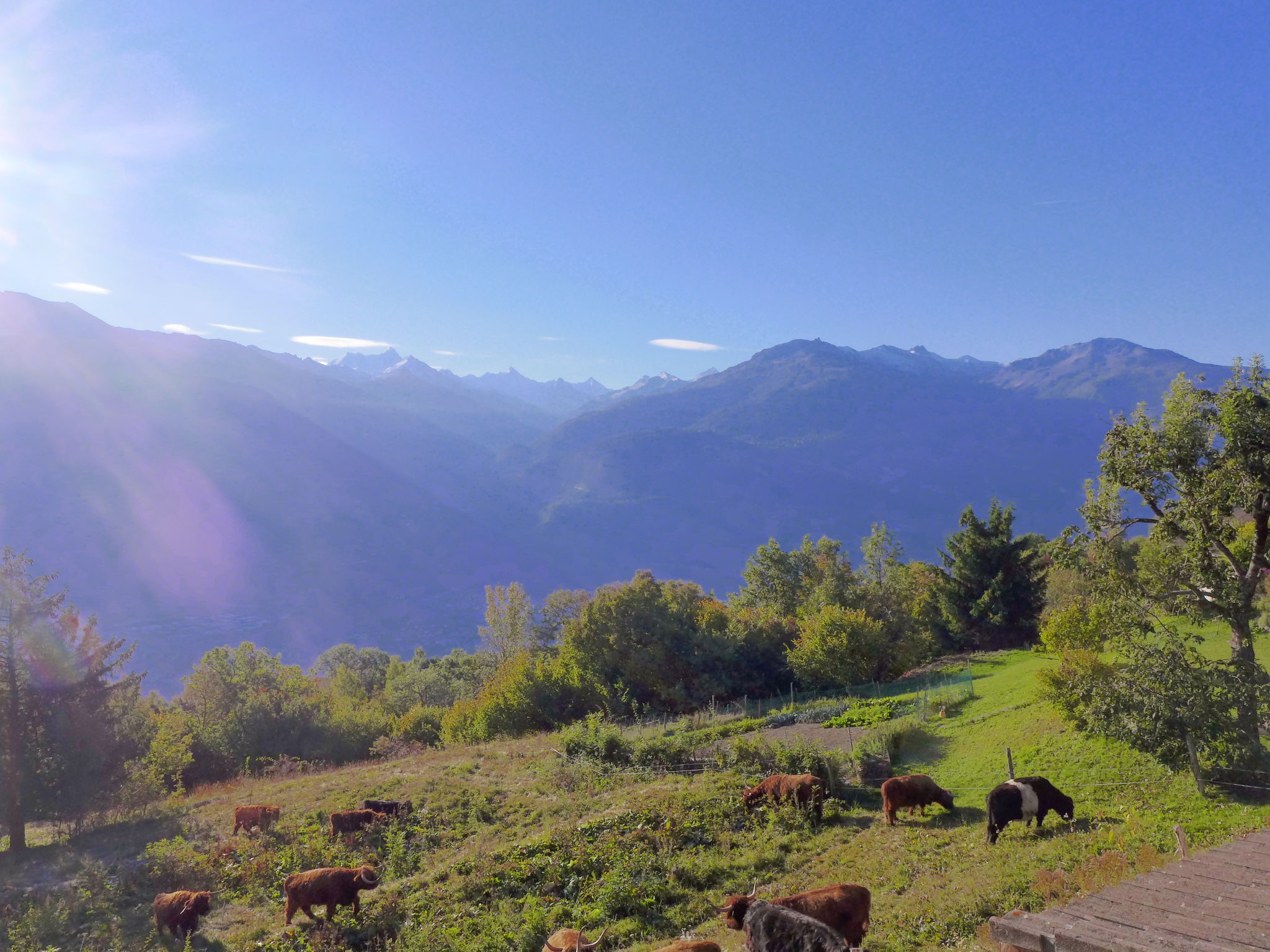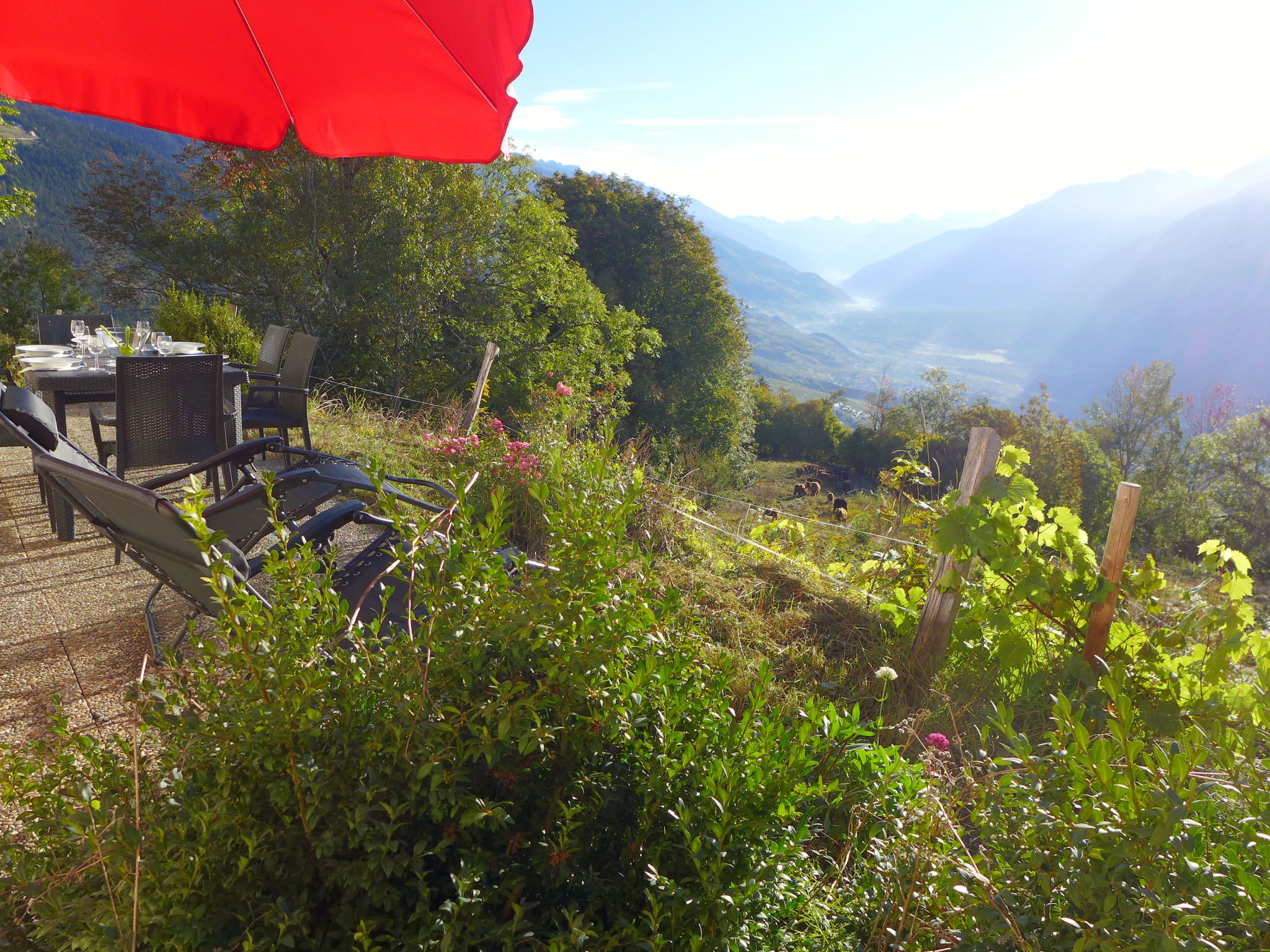 "Maison Le Fontany", 4-room chalet 110 m2 on 2 levels, south facing position. Spacious and bright, partly renovated in 2023, beautiful and modern furnishings: living/dining room with open-hearth fireplace and cable TV. Exit to the terrace, south facing position. 1 double bedroom, east facing position with 1 double bed (160 cm, length 200 cm). Kitchen-/living room (dishwasher, 4 ceramic glass hob hotplates, toaster, kettle, microwave, freezer, electric coffee machine, Capsules for coffee machine (Delizio (Migros)) extra, raclette grill, fondue Set (cheese)) with dining table. Exit to the terrace, south facing position. Bath/WC. Heating. Upper floor: (open staircase), 1 room, south facing position with 1 double bed (160 cm, length 200 cm), hand-basin and shower. 1 room, south facing position with 1 double bed (160 cm, length 200 cm), hand-basin. Sep. WC. Parquet floors. Terrace 30 m2. Terrace furniture, barbecue (portable), deck chairs (2). Very beautiful panoramic view of the mountains, the valley and the countryside. Facilities: washing machine, dryer, hair dryer. Internet (WiFi, free). Parking (2 cars) at the house, in winter at 30 m. Please note: non-smoking house. Maximum 2 pets/ dogs allowed. Cows may be present in the fenced yard just in front of the House.
