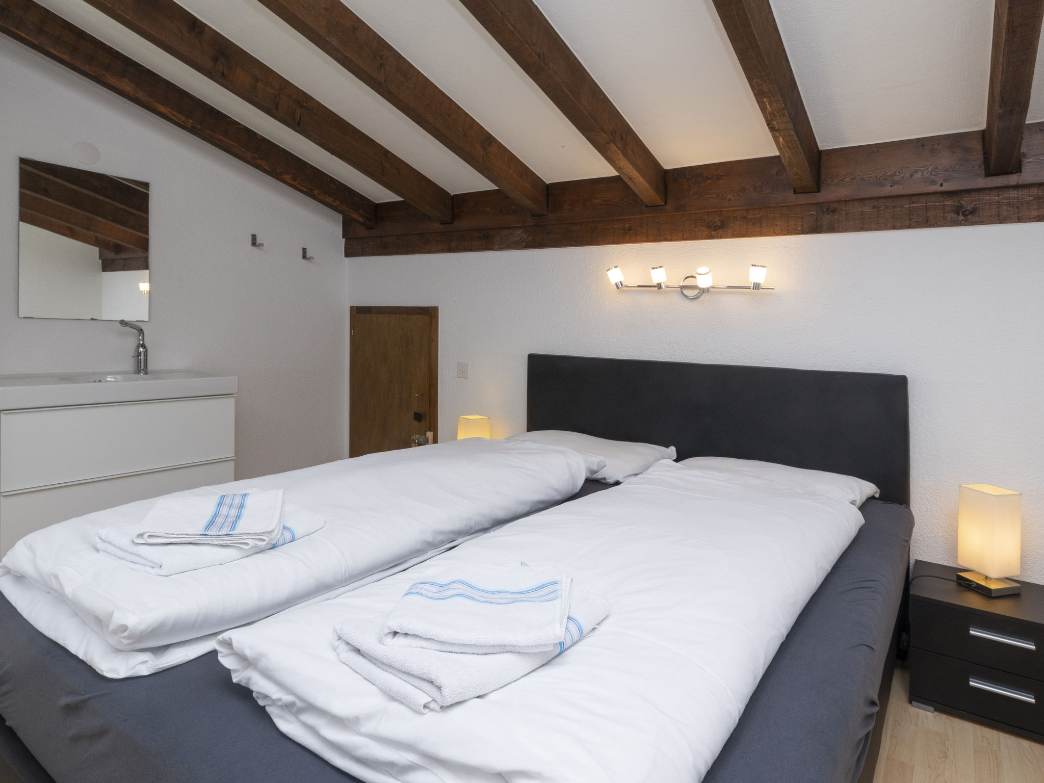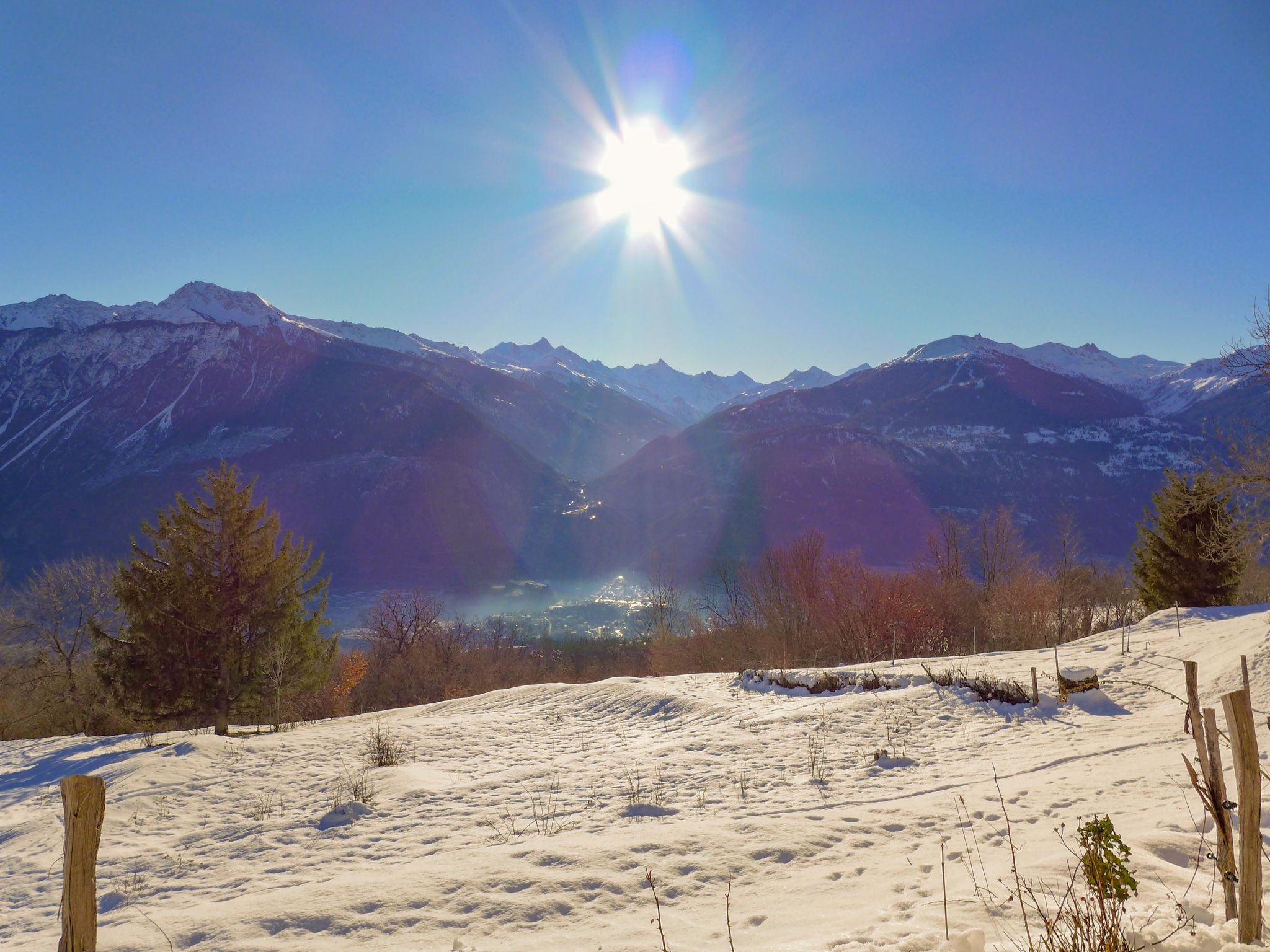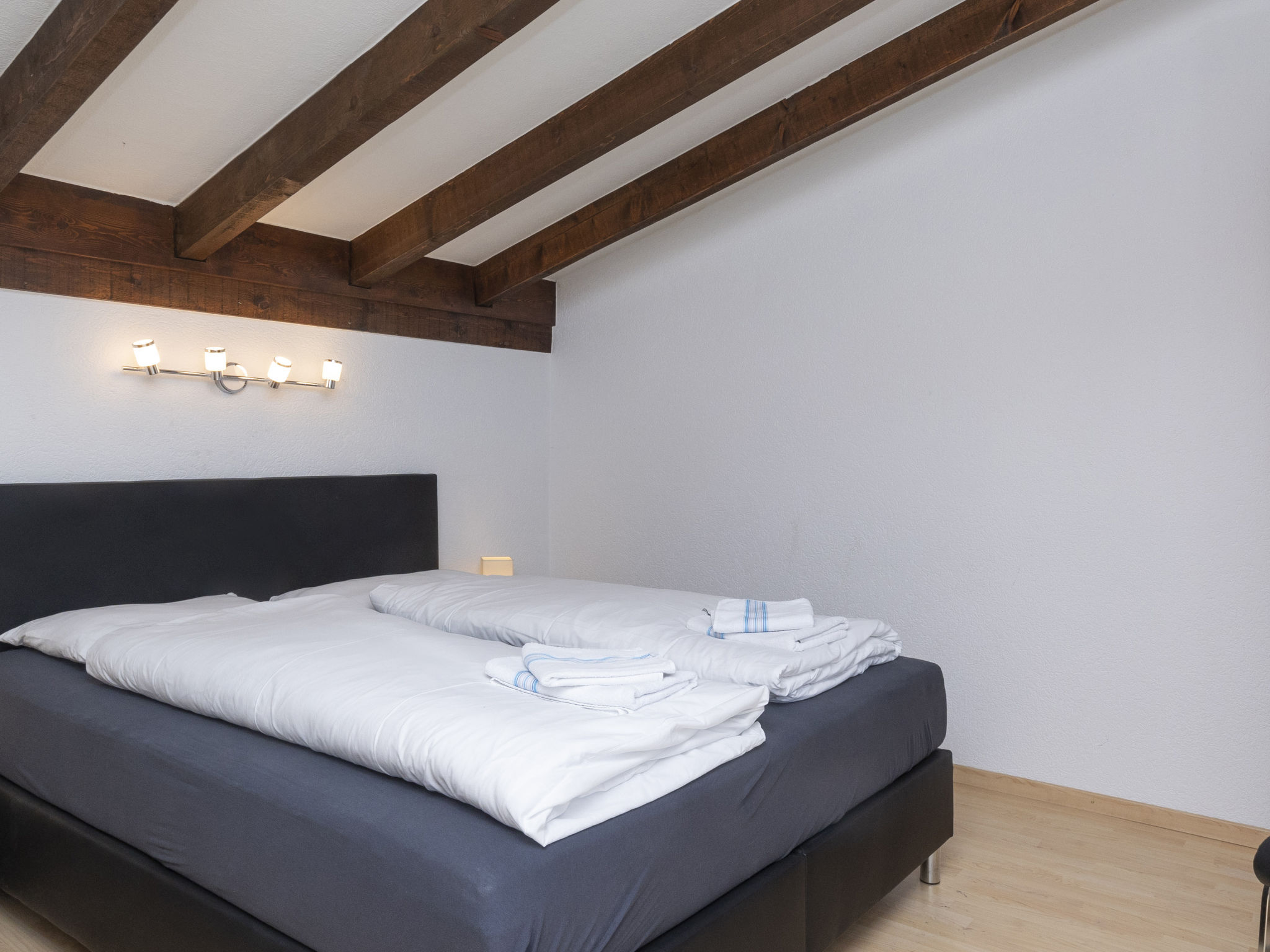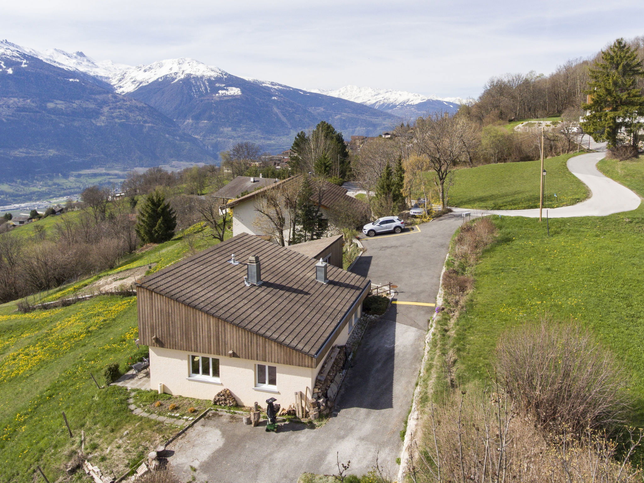 "Maison Le Fontany", 4-room chalet 110 m2 on 2 levels, south facing position. Spacious and bright, partly renovated in 2023, beautiful and modern furnishings: living/dining room with open-hearth fireplace and cable TV. Exit to the terrace, south facing position. 1 double bedroom, east facing position with 1 double bed (160 cm, length 200 cm). Kitchen-/living room (dishwasher, 4 ceramic glass hob hotplates, toaster, kettle, microwave, freezer, electric coffee machine, Capsules for coffee machine (Delizio (Migros)) extra, raclette grill, fondue Set (cheese)) with dining table. Exit to the terrace, south facing position. Bath/WC. Heating. Upper floor: (open staircase), 1 room, south facing position with 1 double bed (160 cm, length 200 cm), hand-basin and shower. 1 room, south facing position with 1 double bed (160 cm, length 200 cm), hand-basin. Sep. WC. Parquet floors. Terrace 30 m2. Terrace furniture, barbecue (portable), deck chairs (2). Very beautiful panoramic view of the mountains, the valley and the countryside. Facilities: washing machine, dryer, hair dryer. Internet (WiFi, free). Parking (2 cars) at the house, in winter at 30 m. Please note: non-smoking house. Maximum 2 pets/ dogs allowed. Cows may be present in the fenced yard just in front of the House.