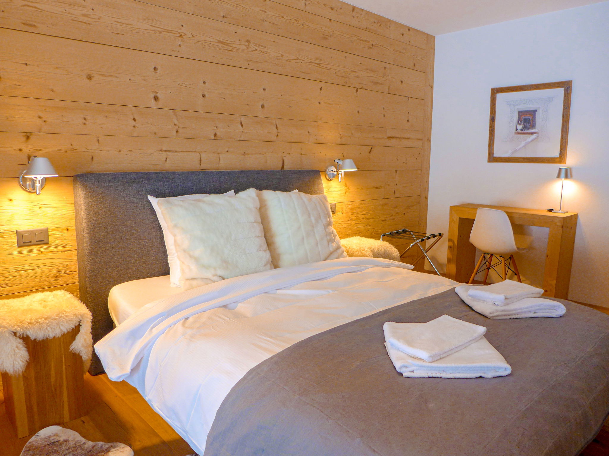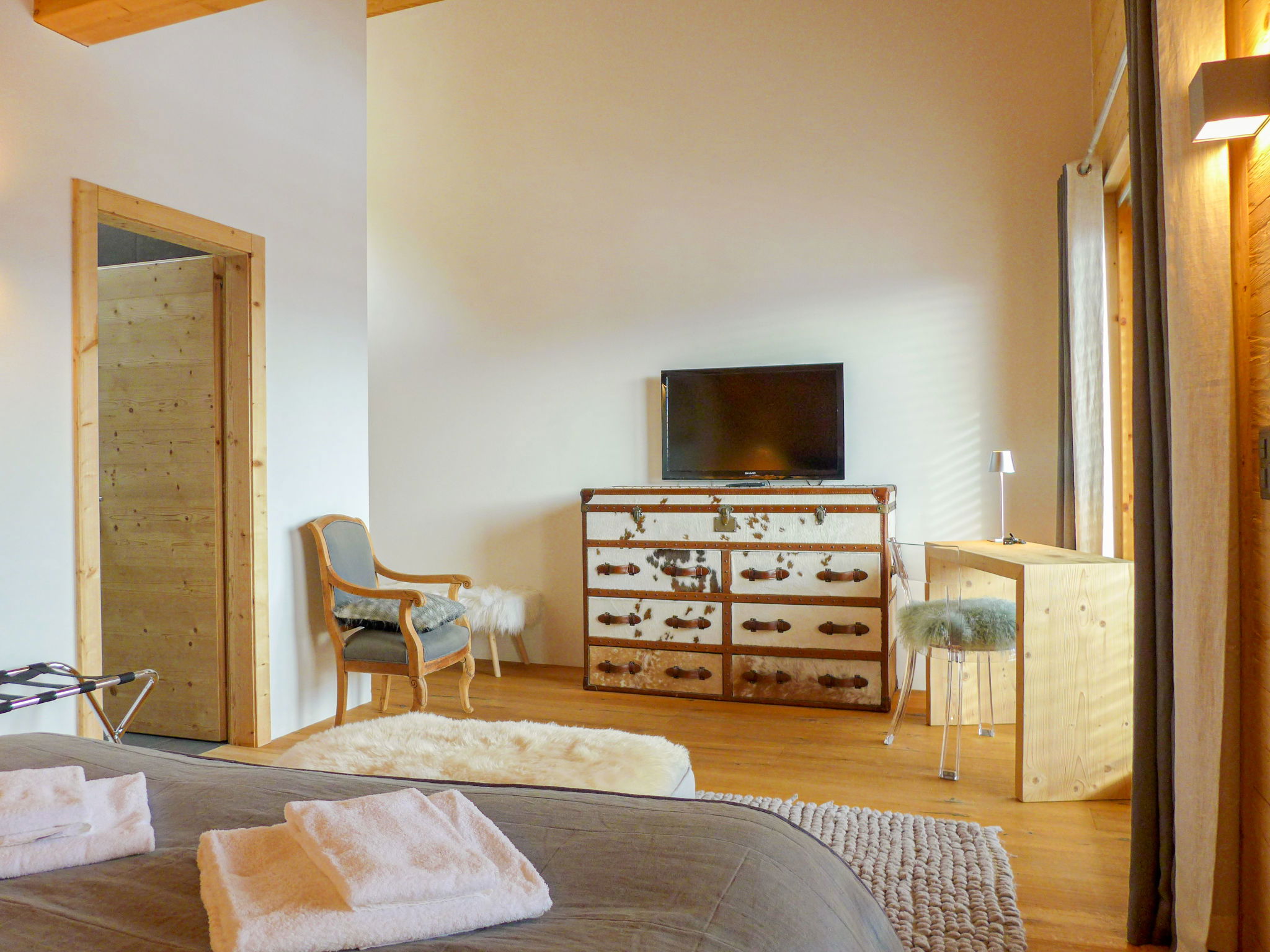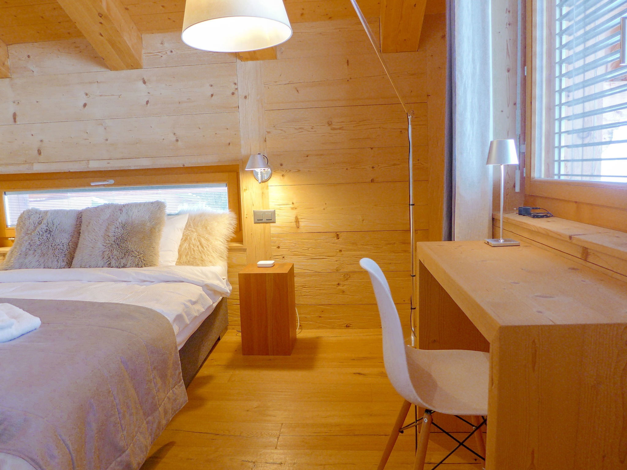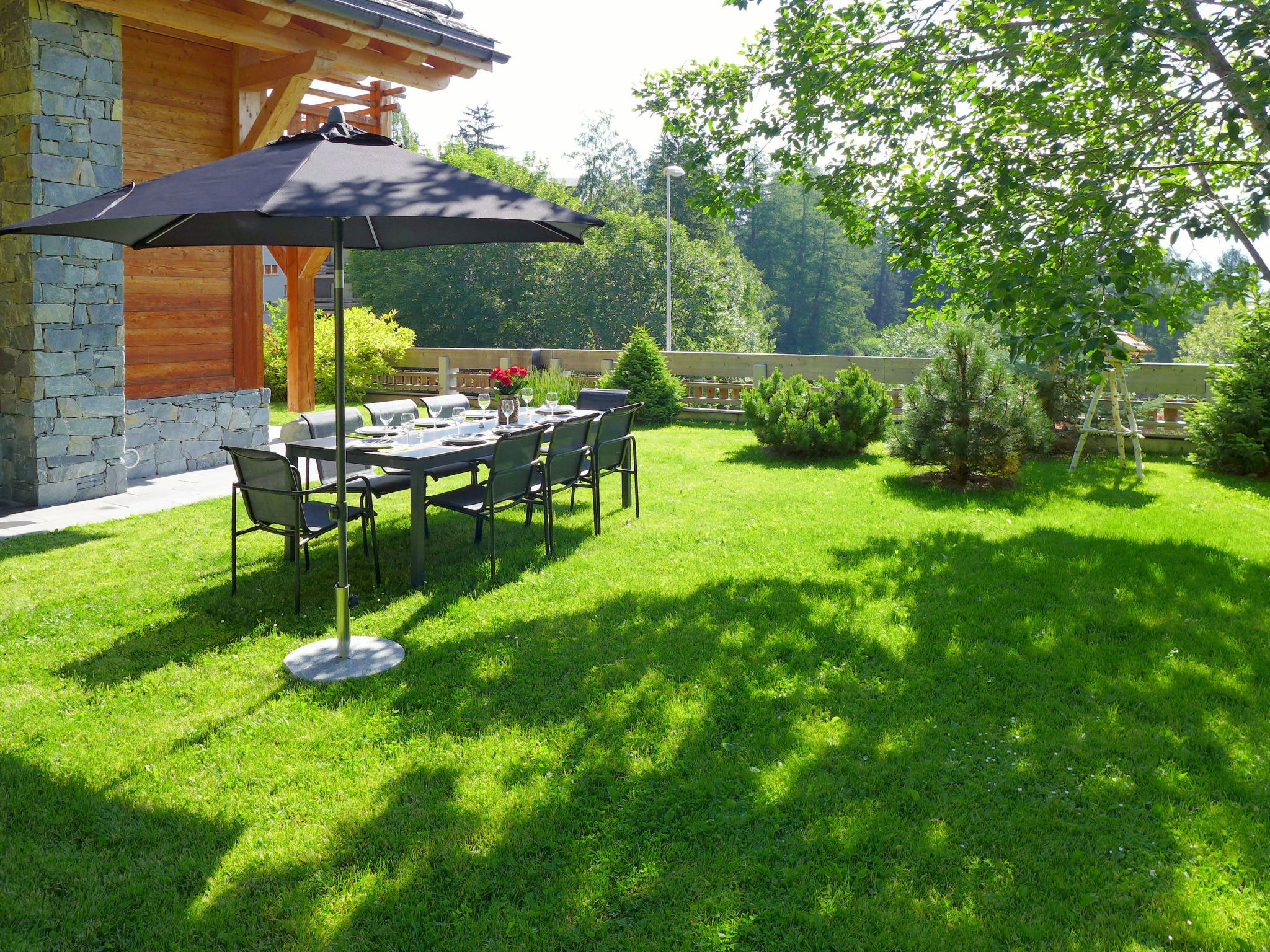 "Chalet Astoria", 6-room chalet 230 m2. Spacious, very comfortable and wooden furniture furnishings: living/dining room with open-hearth fireplace, separate WC, cable TV and electric shutters. Exit to the garden, south facing position. 1 room with Dressing room with 1 french bed (160 cm, length 200 cm), bath/WC and cable TV. Exit to the garden, west facing position. Large, open kitchen (oven, dishwasher, 4 induction hot plates, toaster, kettle, electric coffee machine, raclette grill, combination microwave, fondue Set (chinoise, cheese)). Gas heating, floor heating. Upper floor: 1 room with 1 french bed (160 cm, length 200 cm), shower/WC and cable TV. 2 rooms, each room with 1 double bed (180 cm, length 200 cm), bath/WC and cable TV. Exit to the balcony, south facing position. 1 room with 2 beds (80 cm, length 200 cm), shower/WC and cable TV. Terrace furniture, barbecue, deck chairs (2), box-room. Partial view of the mountains and the countryside. Facilities: iron, children's high chair, baby cot for up to 2 year olds, hair dryer. Internet (WiFi, free). Parking (1 car), garage (3 cars), height 210 cm, width 255 cm. Please note: non-smoking house. Delonghi automatic coffee machine: with coffee beans to grind. 2 baby cots and 2 high chairs. Travel cots without duvets, sheets and mattresses.
