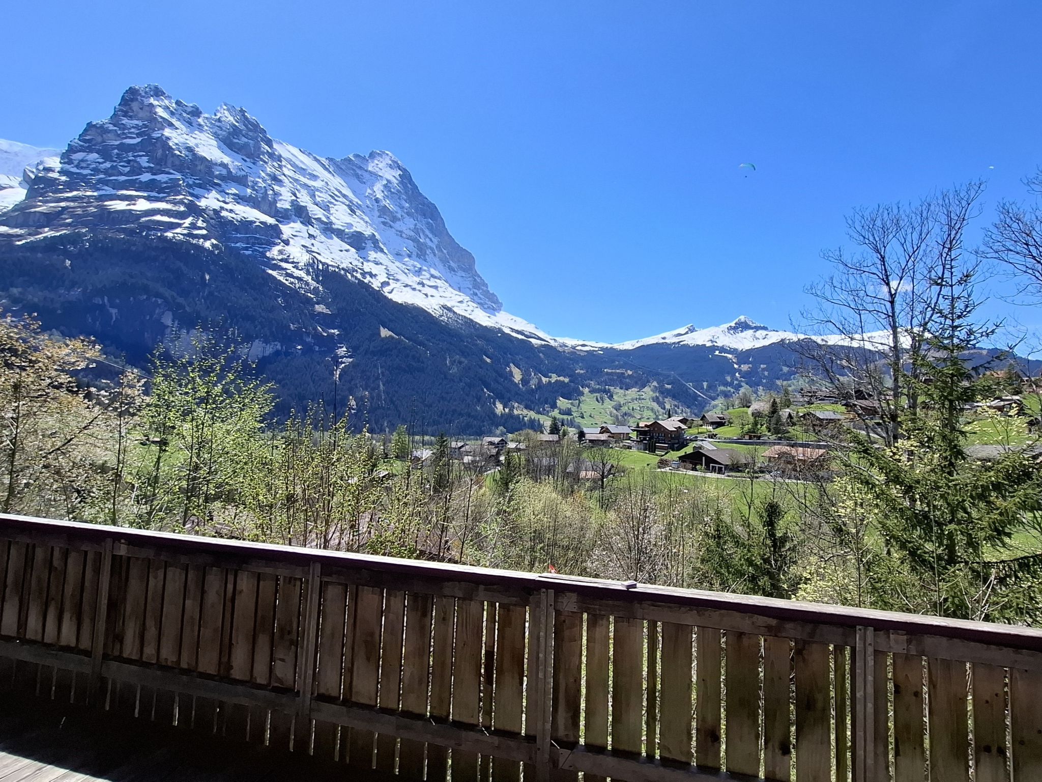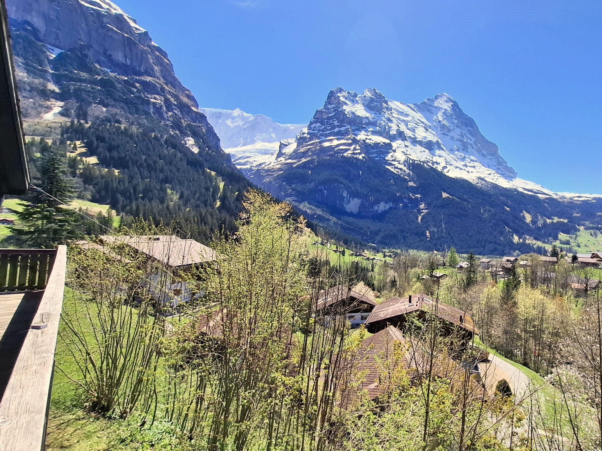 4-room chalet 70 m2, south facing position. Cosy and wooden furniture furnishings: living/dining room with open-hearth fireplace and TV. Exit to the terrace, south facing position and west facing position. 2 rooms, each room with 2 beds (90 cm, length 200 cm). 1 room with 1 french bed (1 x 160 cm, length 200 cm). Open kitchen (oven, dishwasher, 4 ceramic glass hob hotplates, microwave, electric coffee machine). Shower/WC. Parquet floors. Large terrace, south facing position. Terrace furniture. Marvellous view of the mountains, the valley, the countryside and Eiger. Facilities: Internet (WiFi, free). Parking at the house. Please note: 1 pet/ dog allowed. Fire extinguisher.