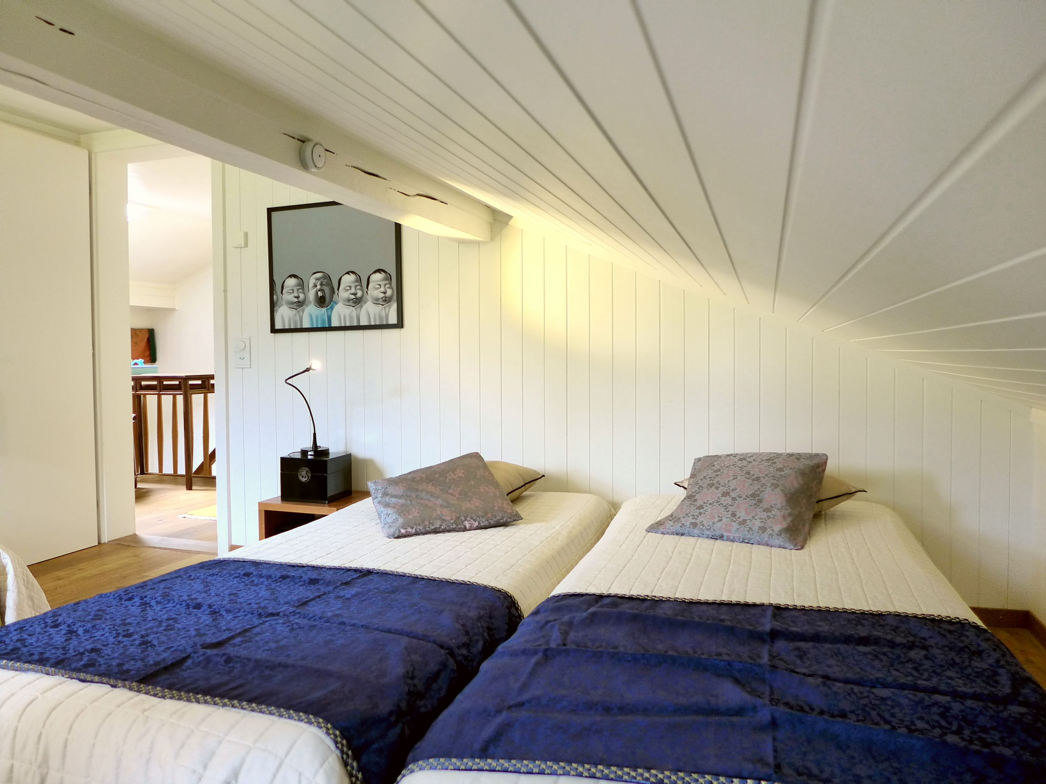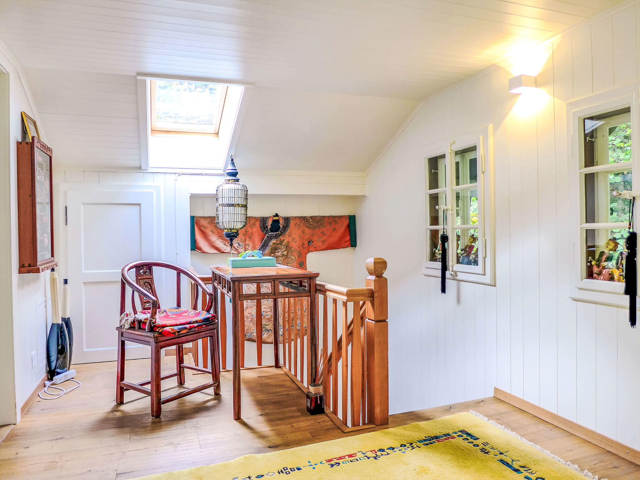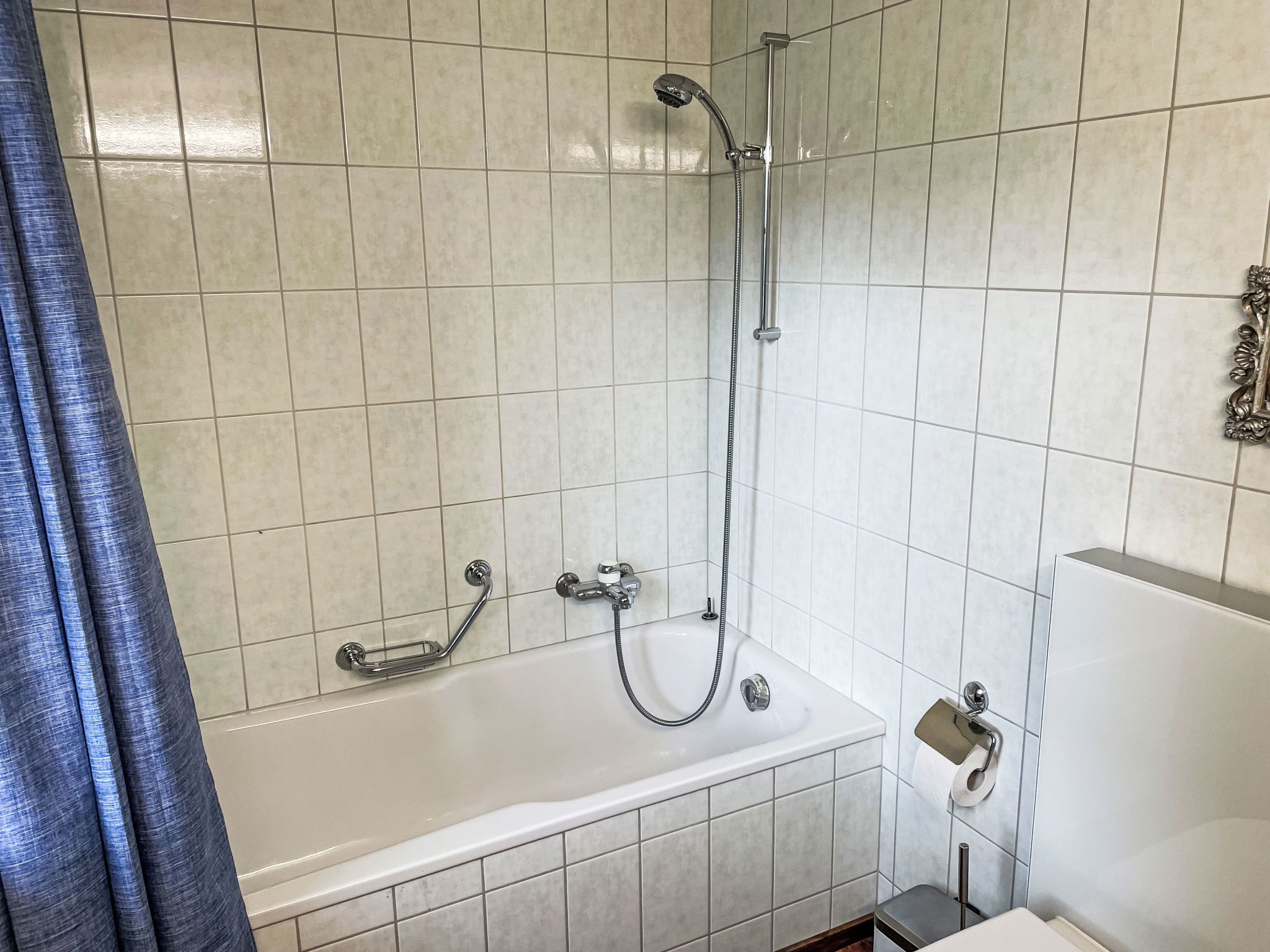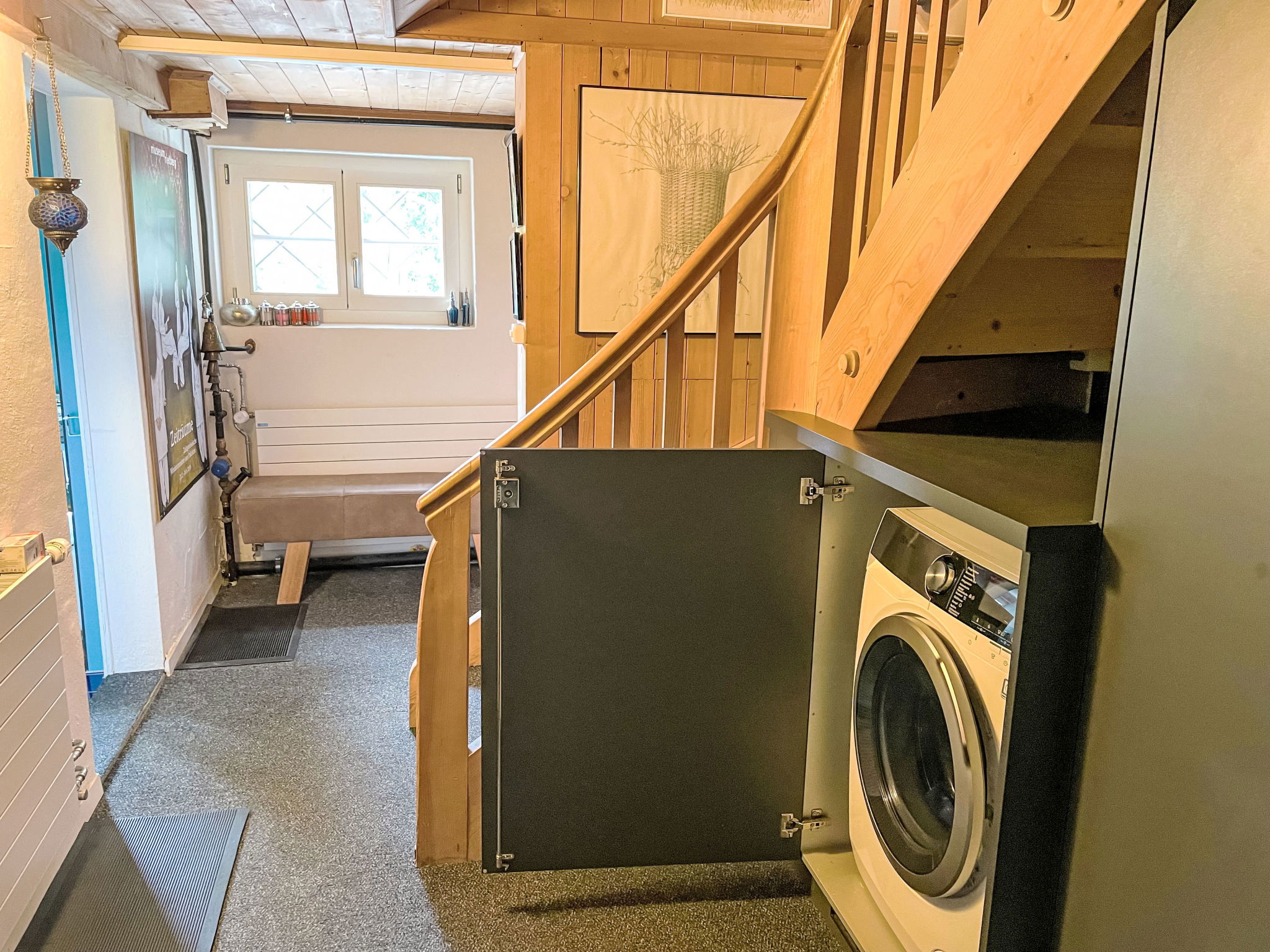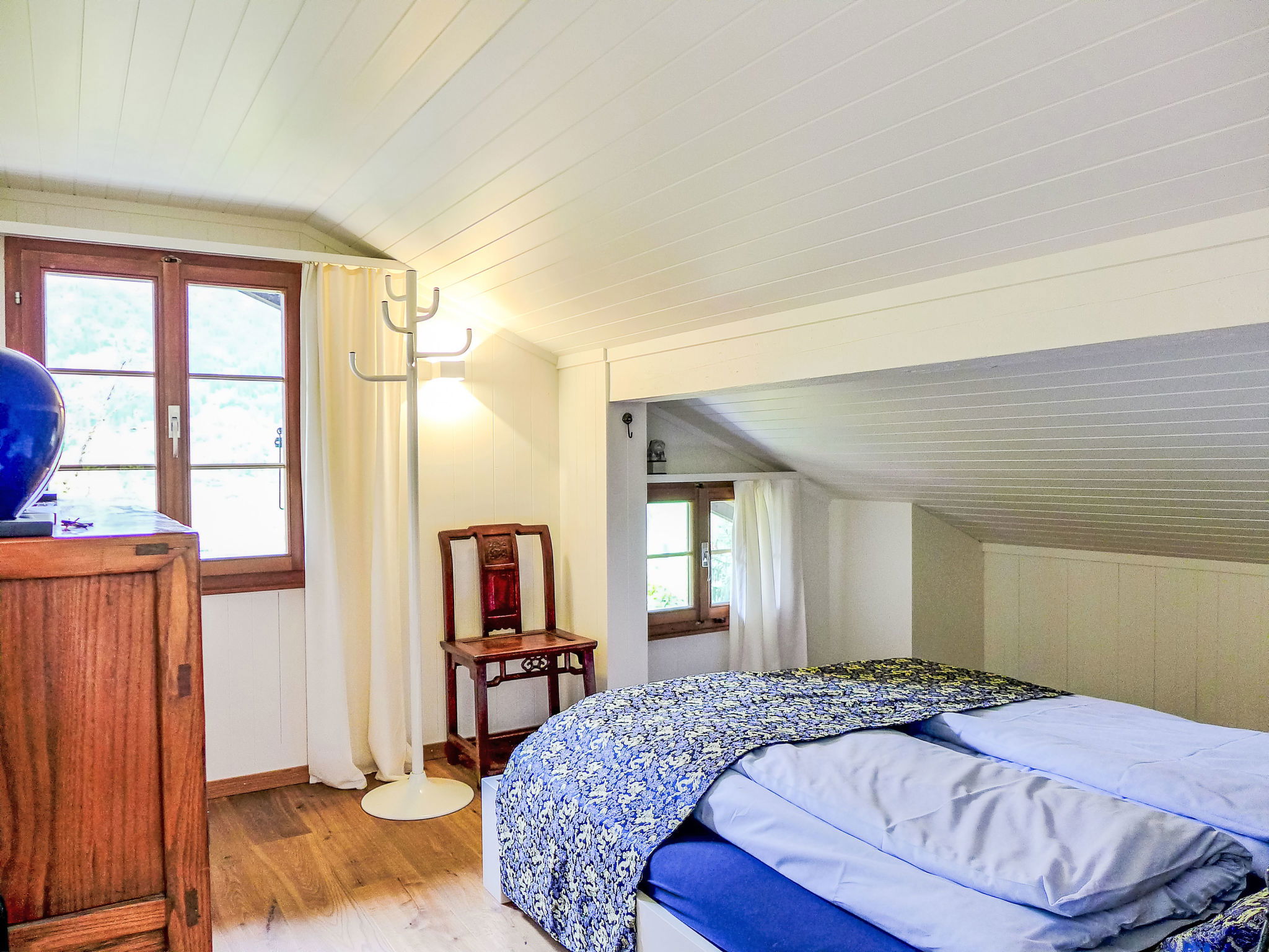 3-room chalet 130 m2 on 3 levels. Bright, partly with sloping ceilings, very comfortable and tasteful furnishings: open large living/dining room with panoramic window south facing position with Scandinavian wood stove, dining table and digital TV. Exit to the balcony. Kitchen-/living room (oven, dishwasher, 4 ceramic glass hob hotplates, toaster, kettle, microwave, electric coffee machine, Capsules for coffee machine (Nespresso) extra, raclette grill, fondue Set (cheese)) with dining nook. Bath/WC. On the lower ground floor: shower/WC. Top floor: 1 room with sloping ceilings with 1 french bed (160 cm, length 200 cm). 1 room with sloping ceilings with 3 beds (90 cm, length 200 cm). Open gallery. Open small playroom. Large balcony, south facing position, large terrace. Terrace furniture, barbecue. Marvellous panoramic view of the mountains and the countryside. Facilities: washing machine, dryer, iron, baby cot for up to 2 year olds, hair dryer, logs (free). Internet (WiFi, free). Parking, garage at the house. Please note: non-smoking house. Maximum 2 pets/ dogs allowed. Smoke alarm, fire extinguisher.