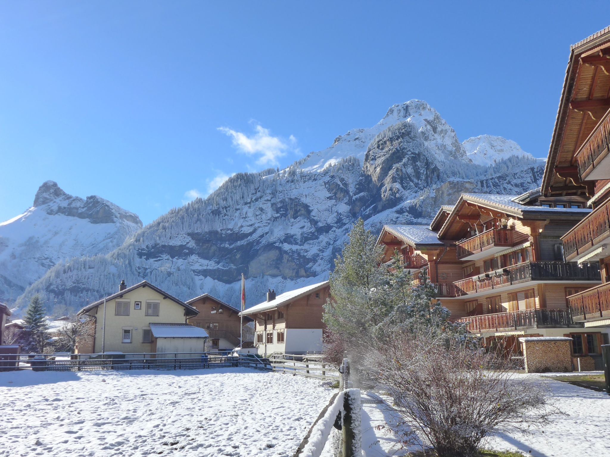 Comfortable apartment block "Schweizerhof", surrounded by meadows. In the resort, in a quiet, sunny position in the residential district, 20 m from the river. In the house: storage room for bicycles, storage room for skis, central heating system, washing machine, tumble dryer (for shared use, extra). Communal covered parking. Shop, supermarket 200 m, restaurant 100 m, bus stop "Kirche" 100 m, railway station "Kandersteg" 300 m, outdoor swimming pool 500 m. Cable car 1.2 km, gondola lift 1.3 km, skisport facilities 1.3 km, ski school 200 m, cross country ski track, ice rink 300 m. Nearby attractions: Oeschinensee, Blausee. Well-known ski regions can easily be reached: Adelboden - Lenk, Lauchernalp. Hiking paths: Sunnbüel-Gemmi, Lötschental.