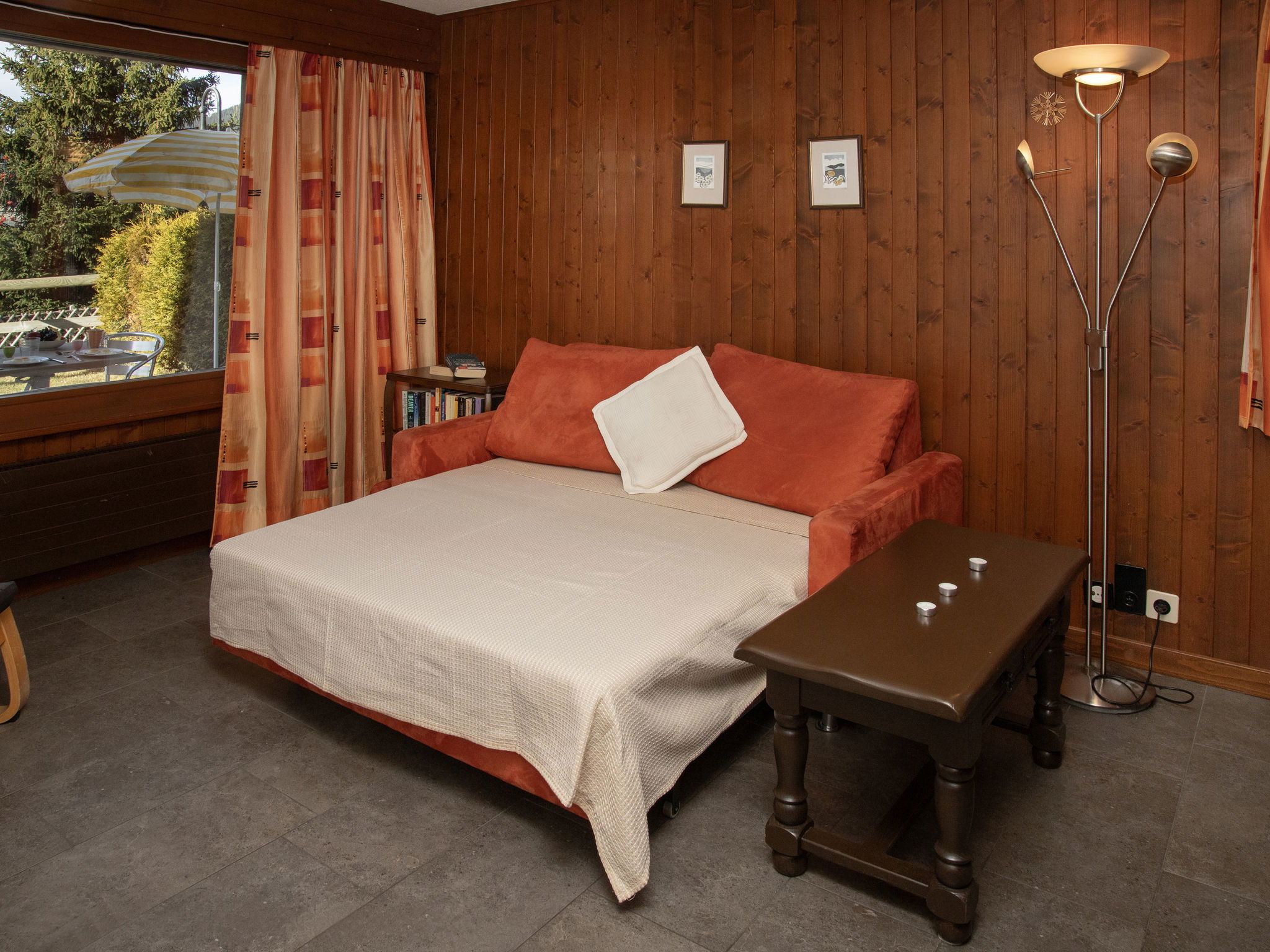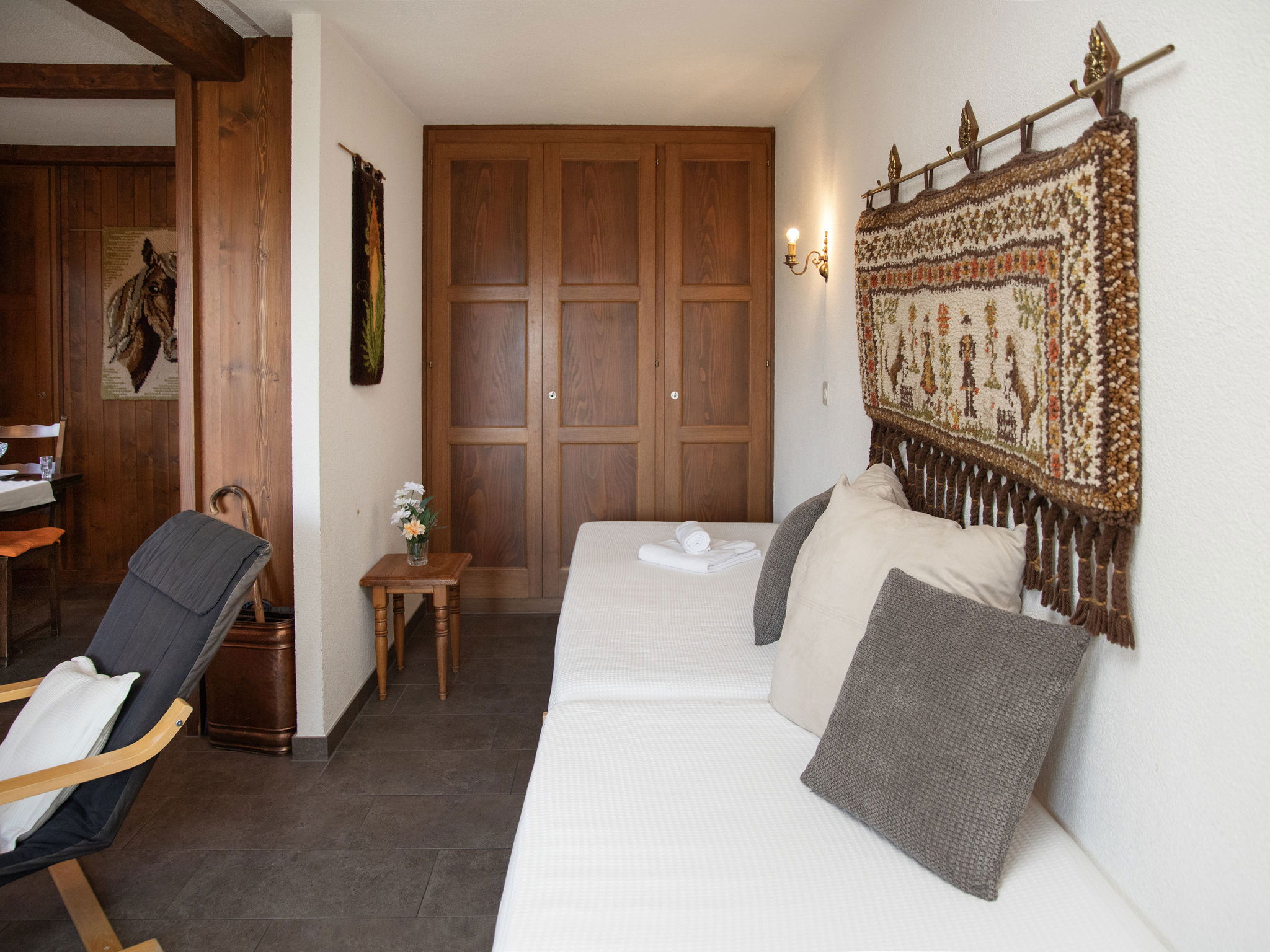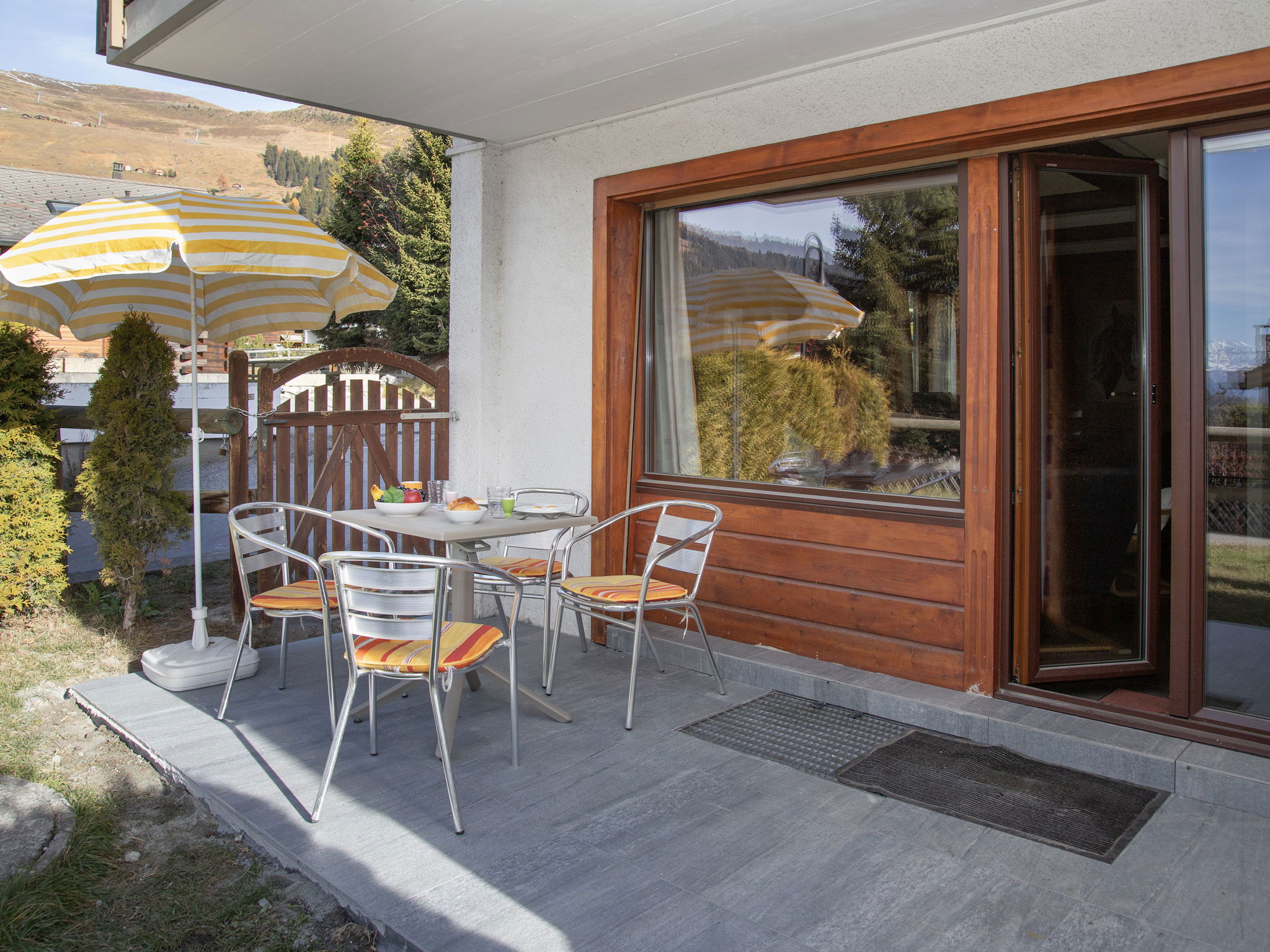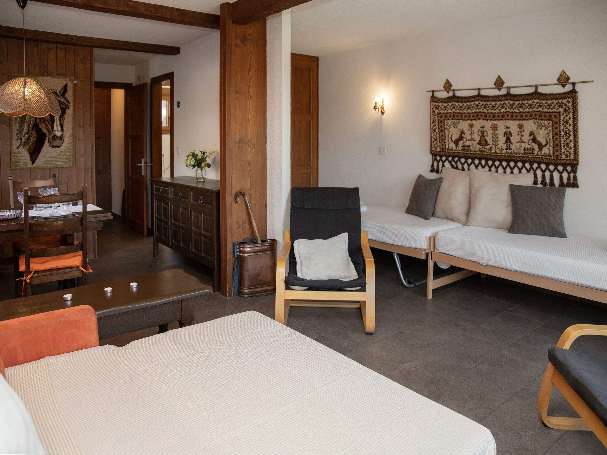 "Pigne 1", 1-room apartment 36 m2, on the ground floor. Simple furnishings: living/dining room with 2 beds (90 cm, length 200 cm), 1 double sofabed (140 cm, length 180 cm). Kitchen (3 hot plates, oven, toaster, kettle). Bath/WC. Small terrace, south facing position, lawn. Terrace furniture. Partial view of the mountains. Facilities: hair dryer. Parking space n 1 at the house. Please note: non-smokers only. Maximum 1 pet/ dog allowed.