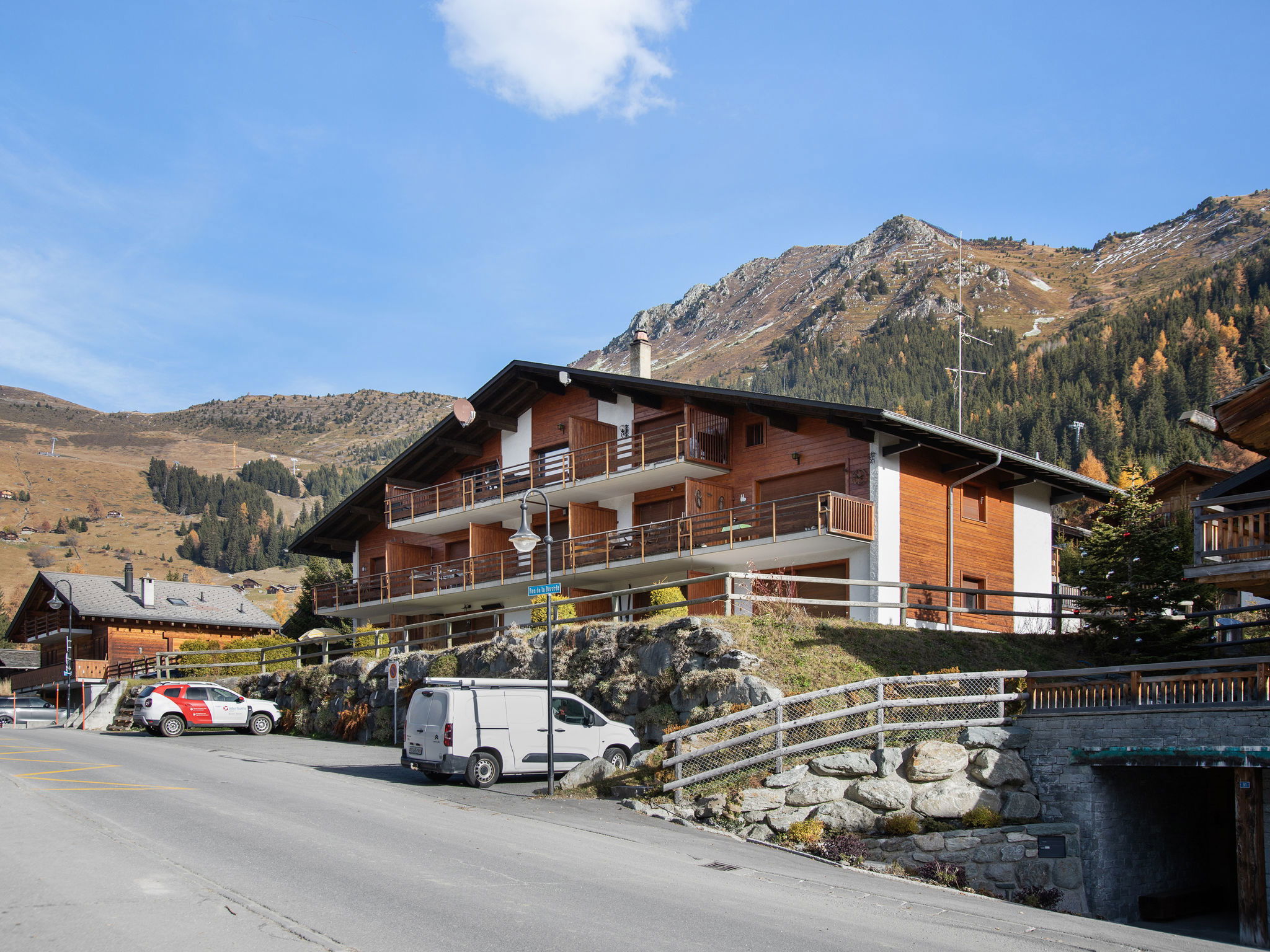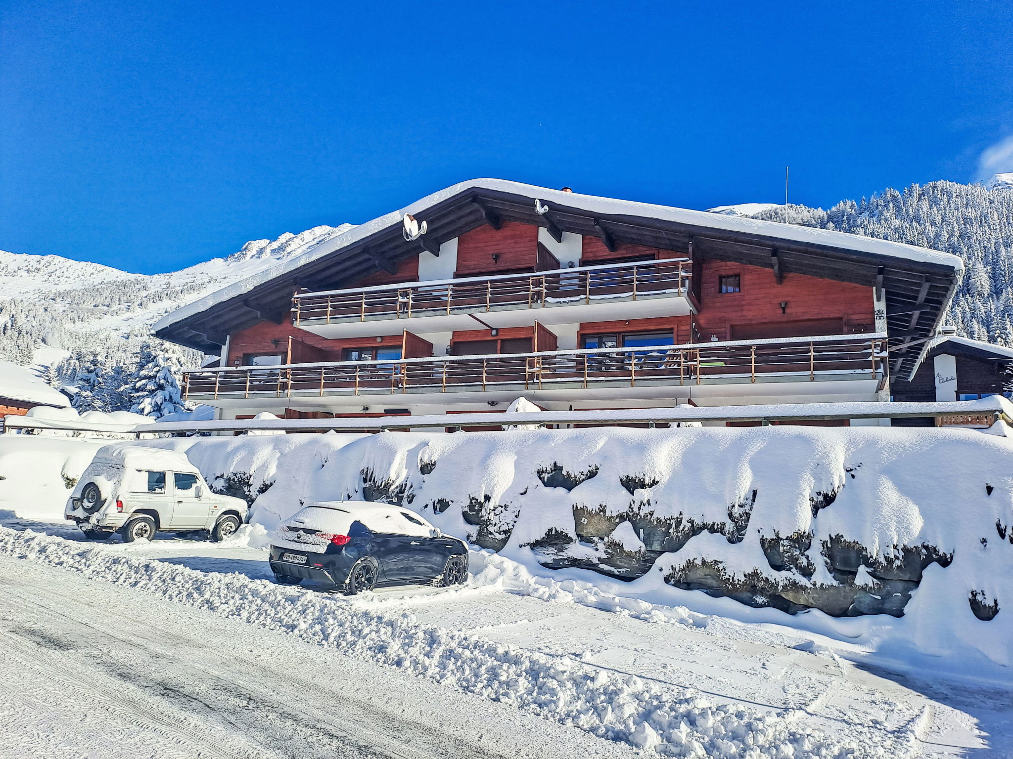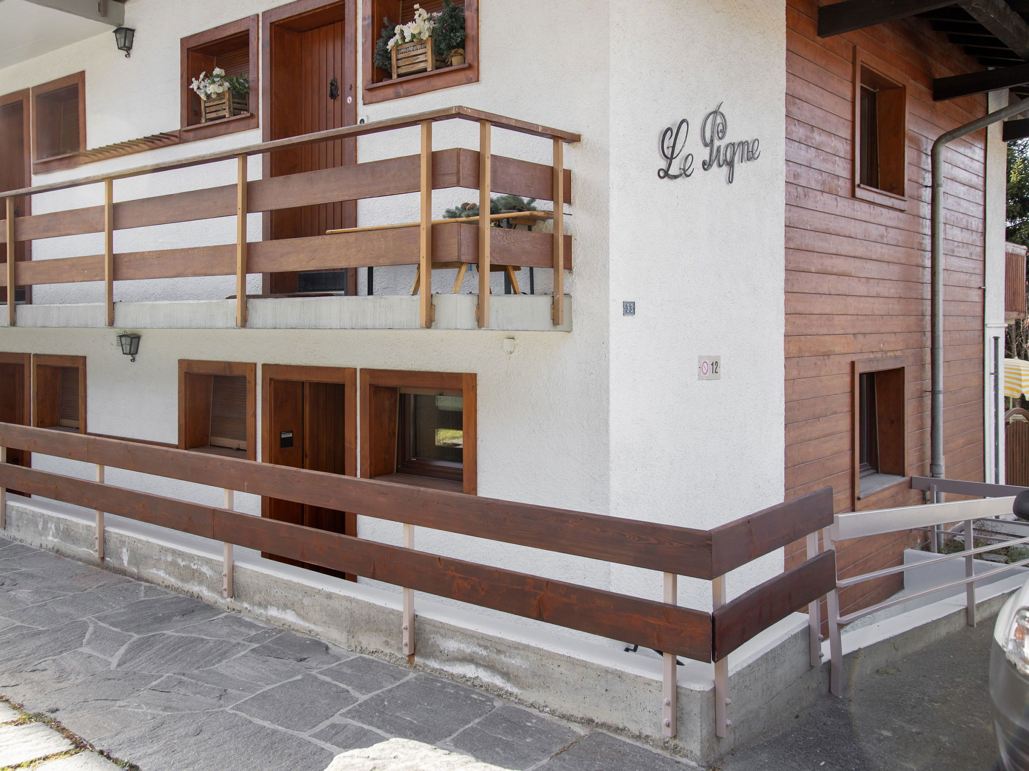 Small apartment house "Le Pigne". In the district of des Esserts, 1.9 km from the centre of de la Station, in a quiet, sunny position, 30 m from the skiing area, south facing position. In the house: central heating system. Motor access to the house. Shop 1.9 km, grocery 1.4 km, supermarket 1.9 km, restaurant 400 m, bar 1.9 km, bakery 1 km, café 400 m, bus stop 20 m, indoor swimming pool 2.8 km. Golf course (18 hole) 150 m, tennis 2.8 km, riding stable 2.8 km, sports centre 2.8 km, chair lift 2.7 km, gondola lift 1 km, skisport facilities 2.4 km, ski bus stop 20 m, ski school 2.5 km, ski-kindergarten 2.5 km, ice rink 2.8 km, children's playground 1.9 km. Please note: In case of good snow conditions, the house is accessible on skis. Rouge drag lift 80 m.