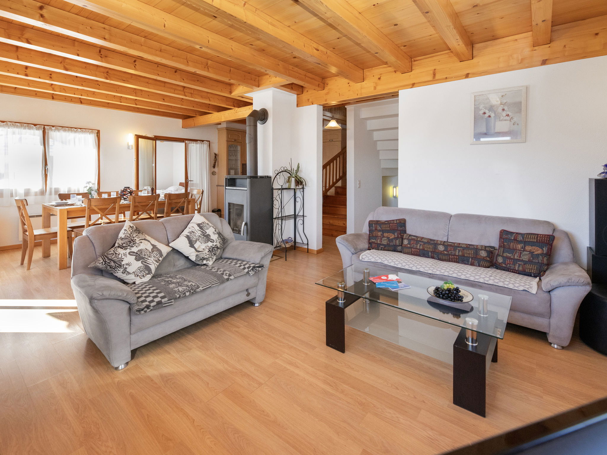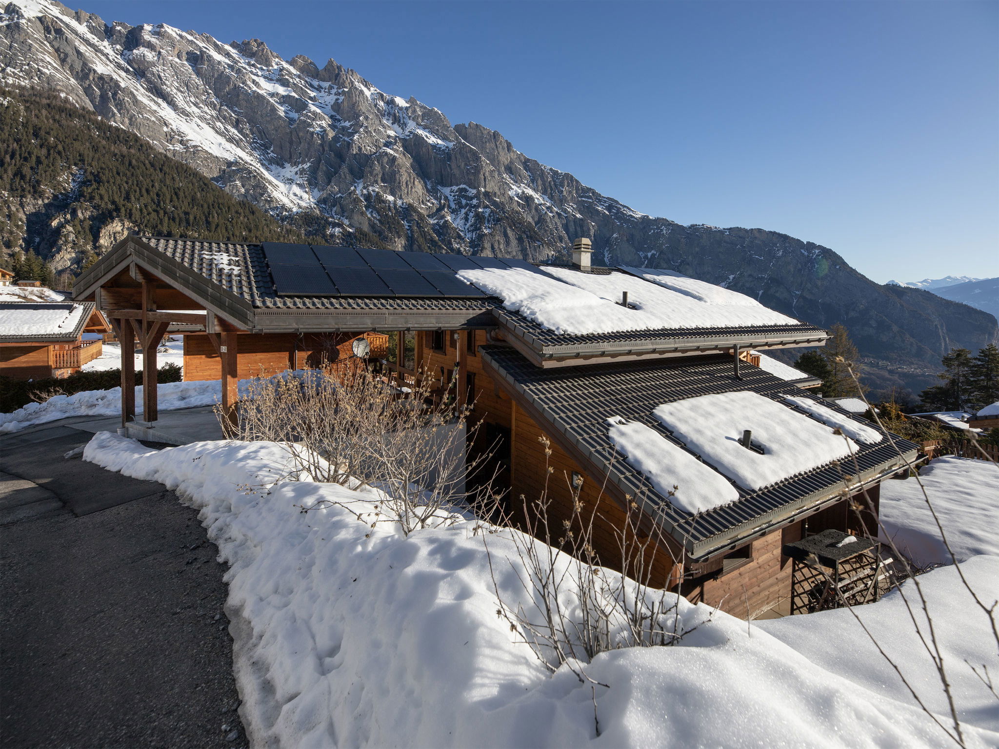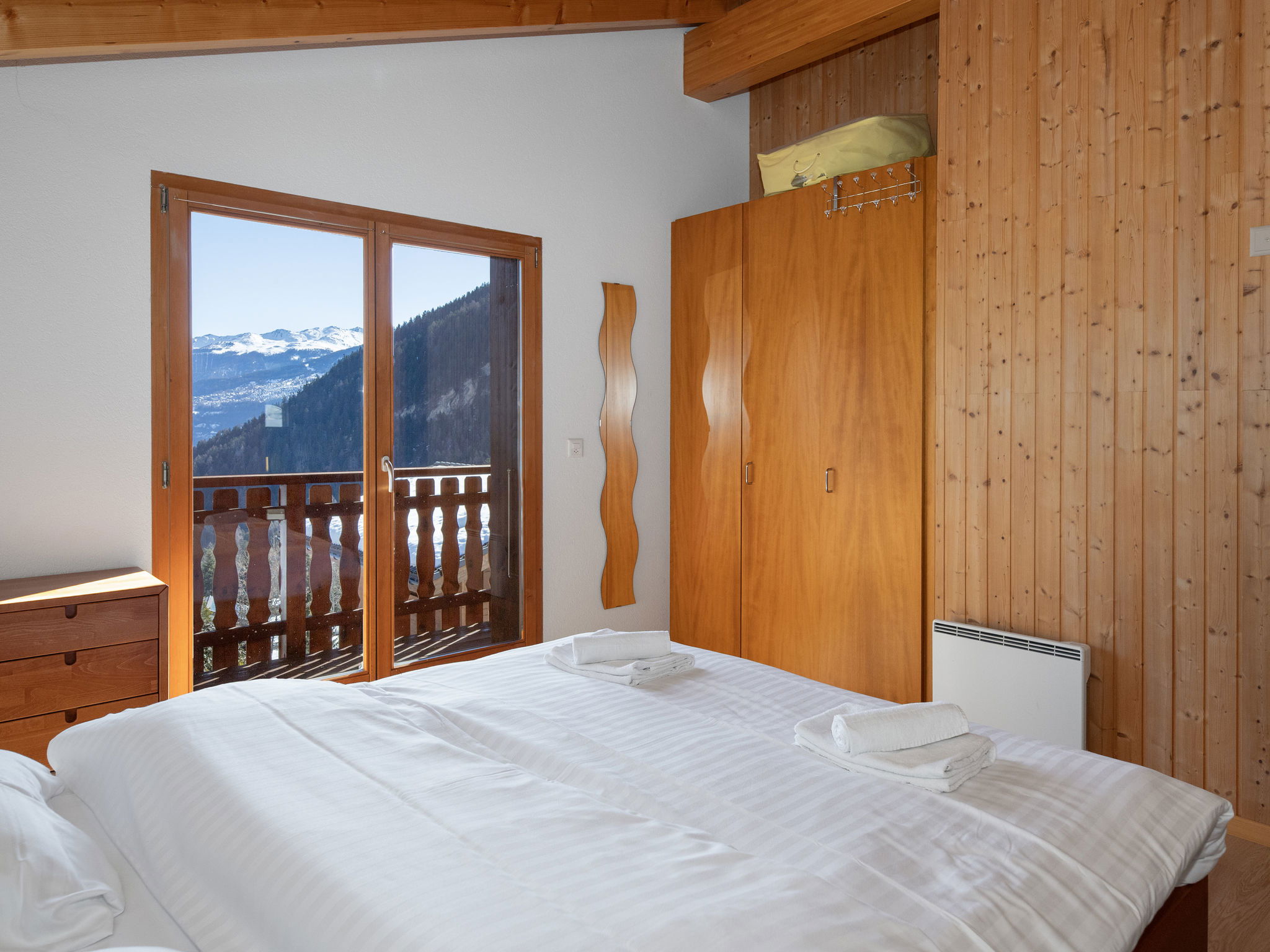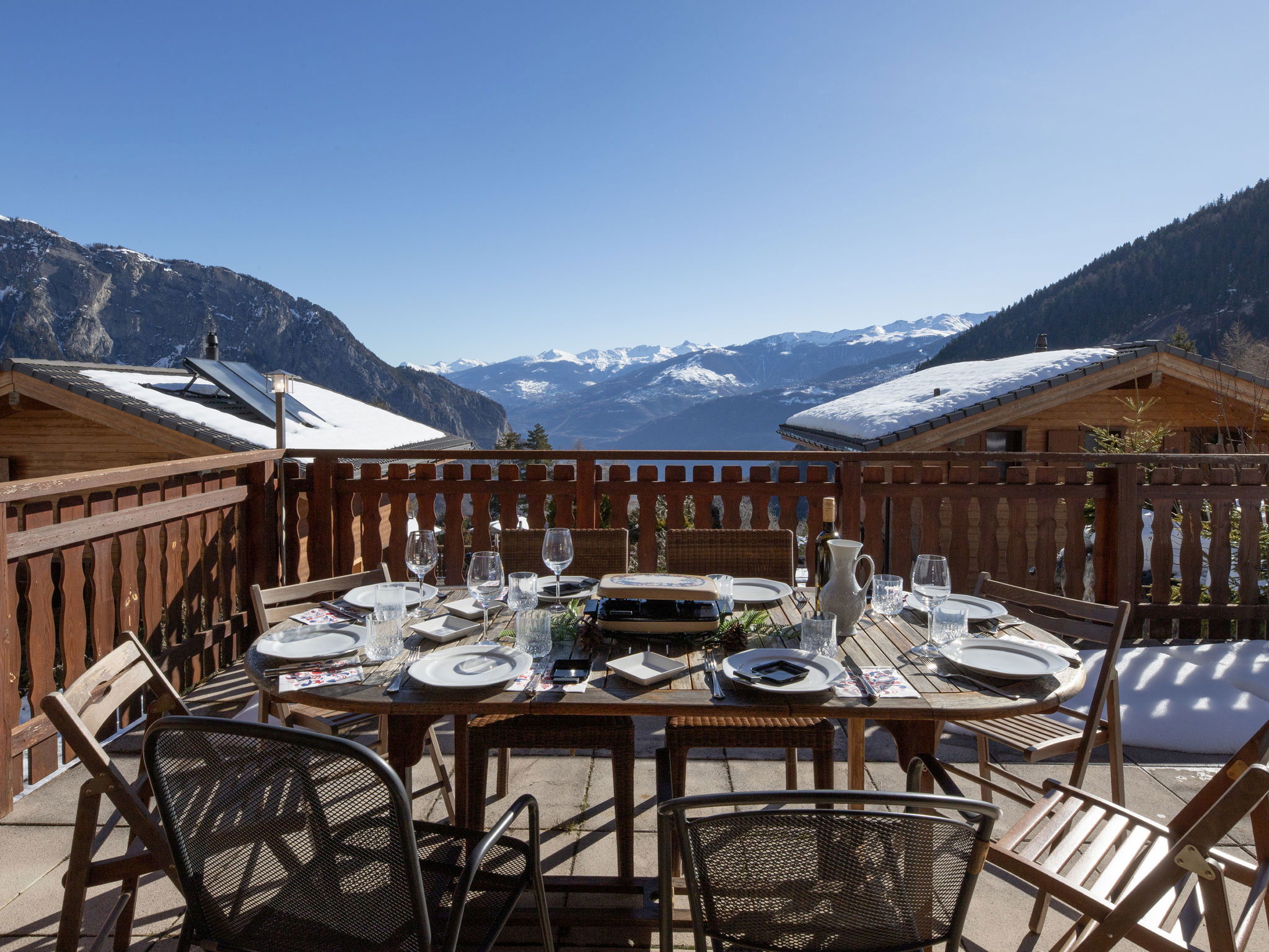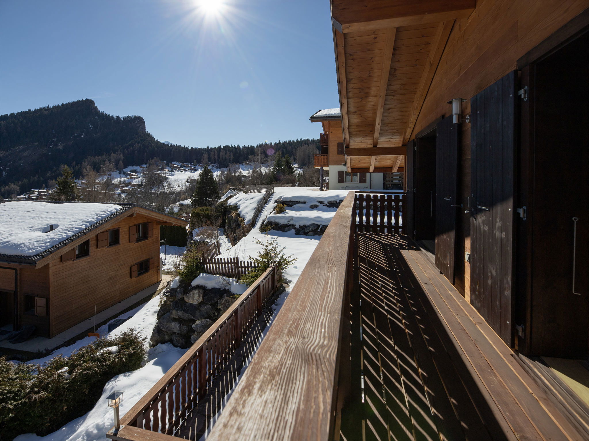 "Orchidée", 5-room chalet 138 m2 on 2 levels, east facing position. Spacious, comfortable and tasteful furnishings: living/dining room with cable TV and wood-burning stove. Exit to the terrace. 1 room with 1 french bed (1 x 160 cm, length 200 cm), shower/WC. Exit to the terrace. Open kitchen (oven, dishwasher, 4 ceramic glass hob hotplates, electric coffee machine, Capsules for coffee machine (Nespresso) extra, raclette grill, fondue Set (chinoise)). Exit to the terrace. Sep. WC. Upper floor: 1 room with 1 double bed (1 x 160 cm, length 200 cm). Exit to the balcony, east facing position. 1 room with 1 double bed (1 x 160 cm, length 200 cm). Exit to the balcony, east facing position. 1 room with 2 beds (90 cm, length 200 cm). Bath/shower/WC. Large terrace, east facing position, lawn. Terrace furniture, deck chairs. Very beautiful panoramic view of the mountains and the valley. Facilities: washing machine, hair dryer. Internet (WiFi, free). Parking (roofed, 2 cars) at the house. Please note: non-smokers only. Maximum 1 pet/ dog allowed.