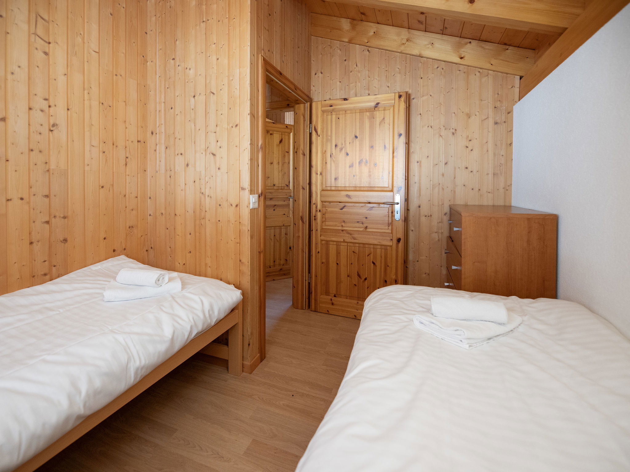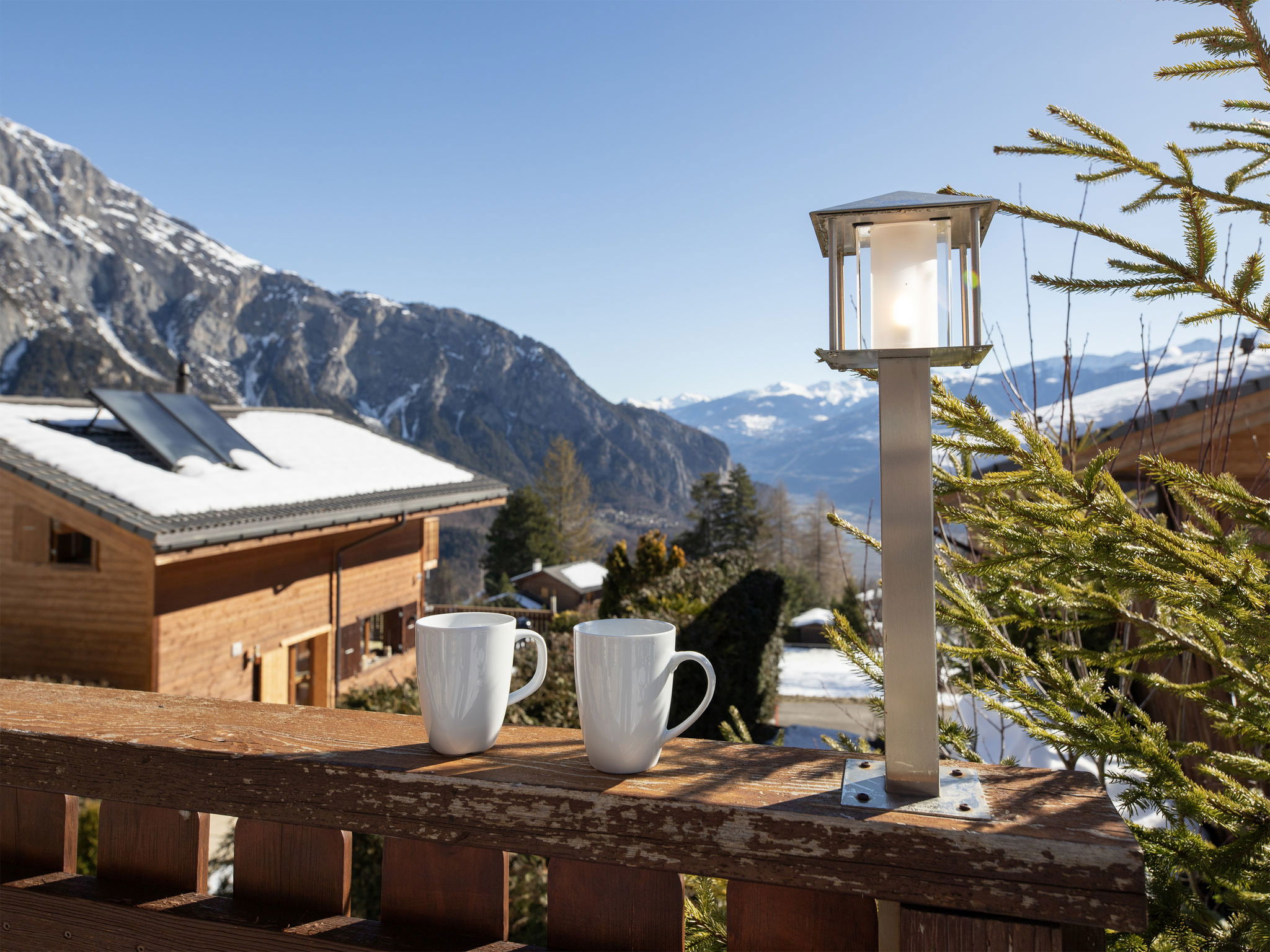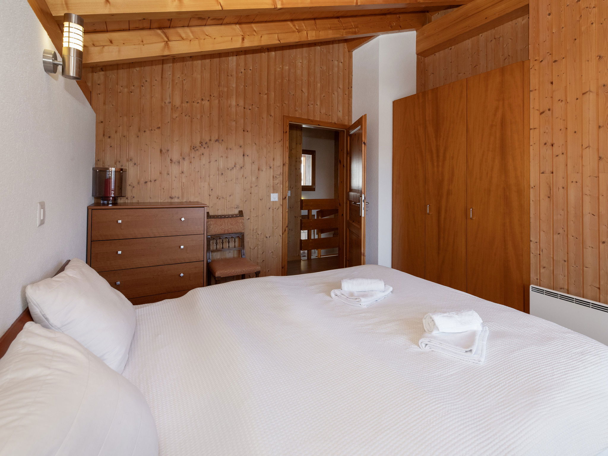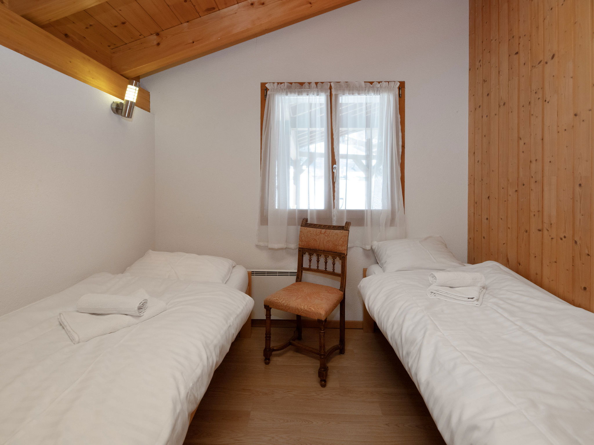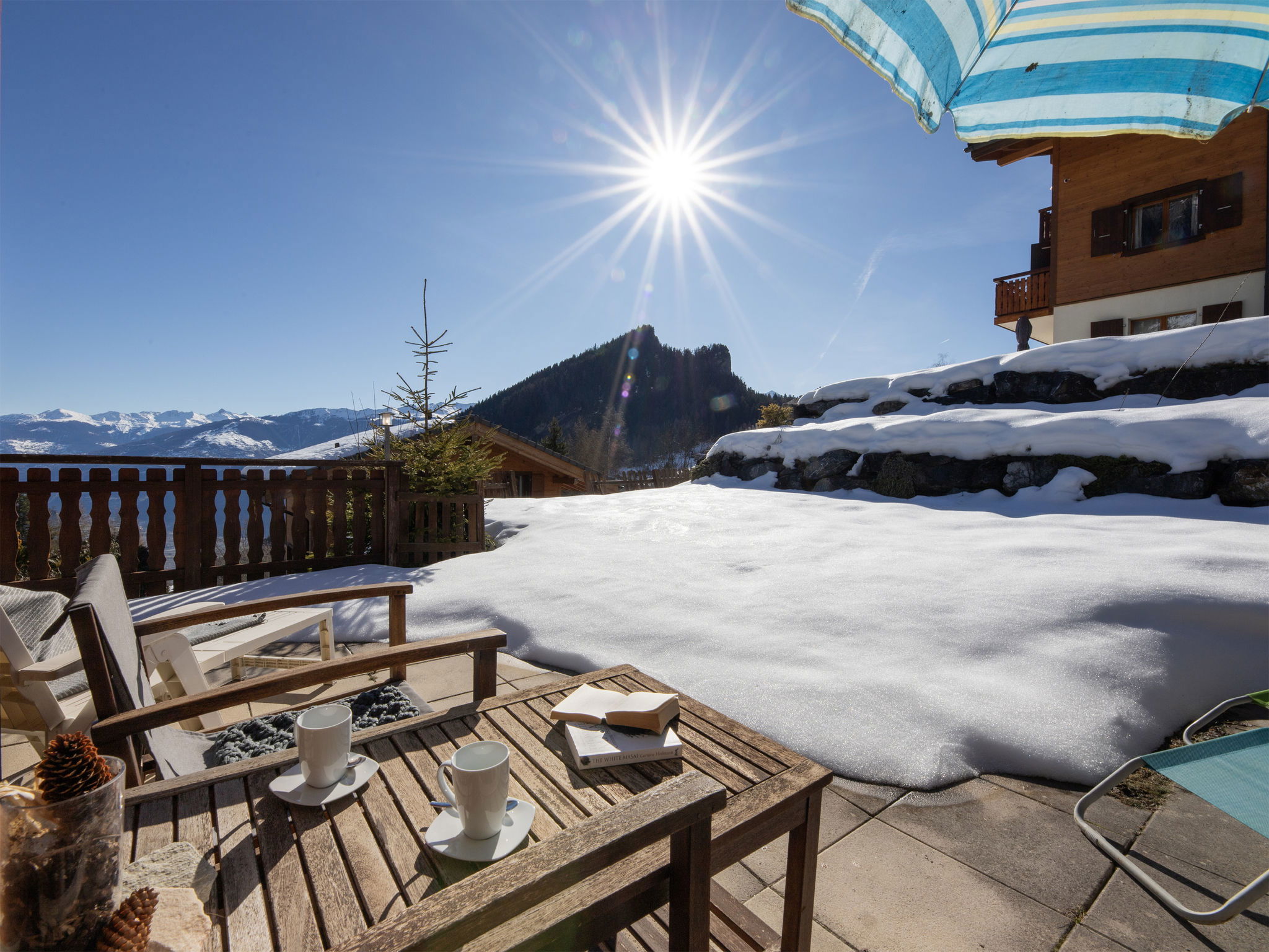 "Orchidée", 5-room chalet 138 m2 on 2 levels, east facing position. Spacious, comfortable and tasteful furnishings: living/dining room with cable TV and wood-burning stove. Exit to the terrace. 1 room with 1 french bed (1 x 160 cm, length 200 cm), shower/WC. Exit to the terrace. Open kitchen (oven, dishwasher, 4 ceramic glass hob hotplates, electric coffee machine, Capsules for coffee machine (Nespresso) extra, raclette grill, fondue Set (chinoise)). Exit to the terrace. Sep. WC. Upper floor: 1 room with 1 double bed (1 x 160 cm, length 200 cm). Exit to the balcony, east facing position. 1 room with 1 double bed (1 x 160 cm, length 200 cm). Exit to the balcony, east facing position. 1 room with 2 beds (90 cm, length 200 cm). Bath/shower/WC. Large terrace, east facing position, lawn. Terrace furniture, deck chairs. Very beautiful panoramic view of the mountains and the valley. Facilities: washing machine, hair dryer. Internet (WiFi, free). Parking (roofed, 2 cars) at the house. Please note: non-smokers only. Maximum 1 pet/ dog allowed.