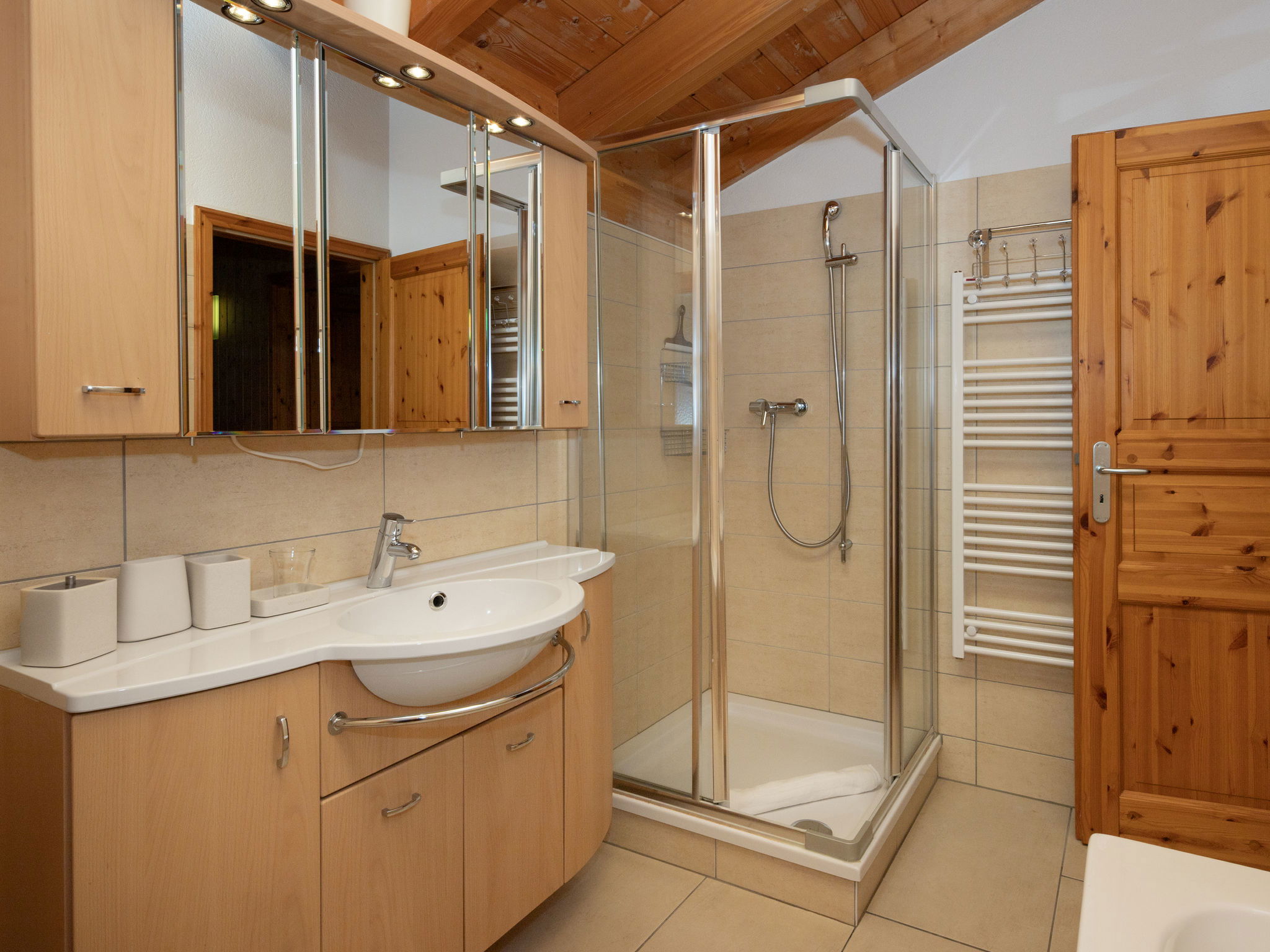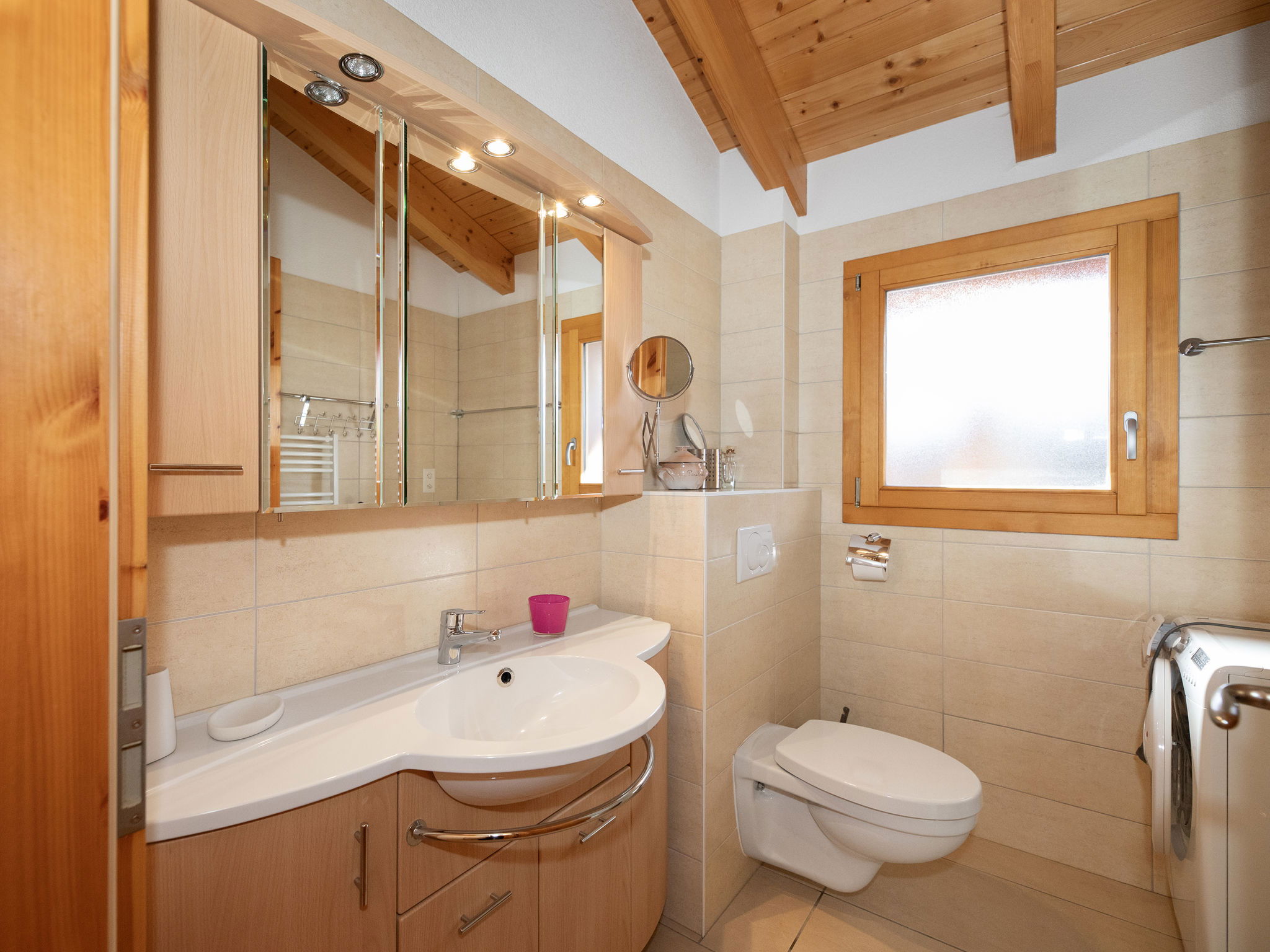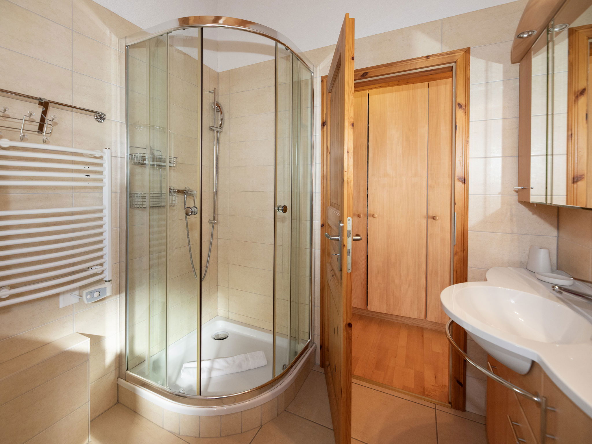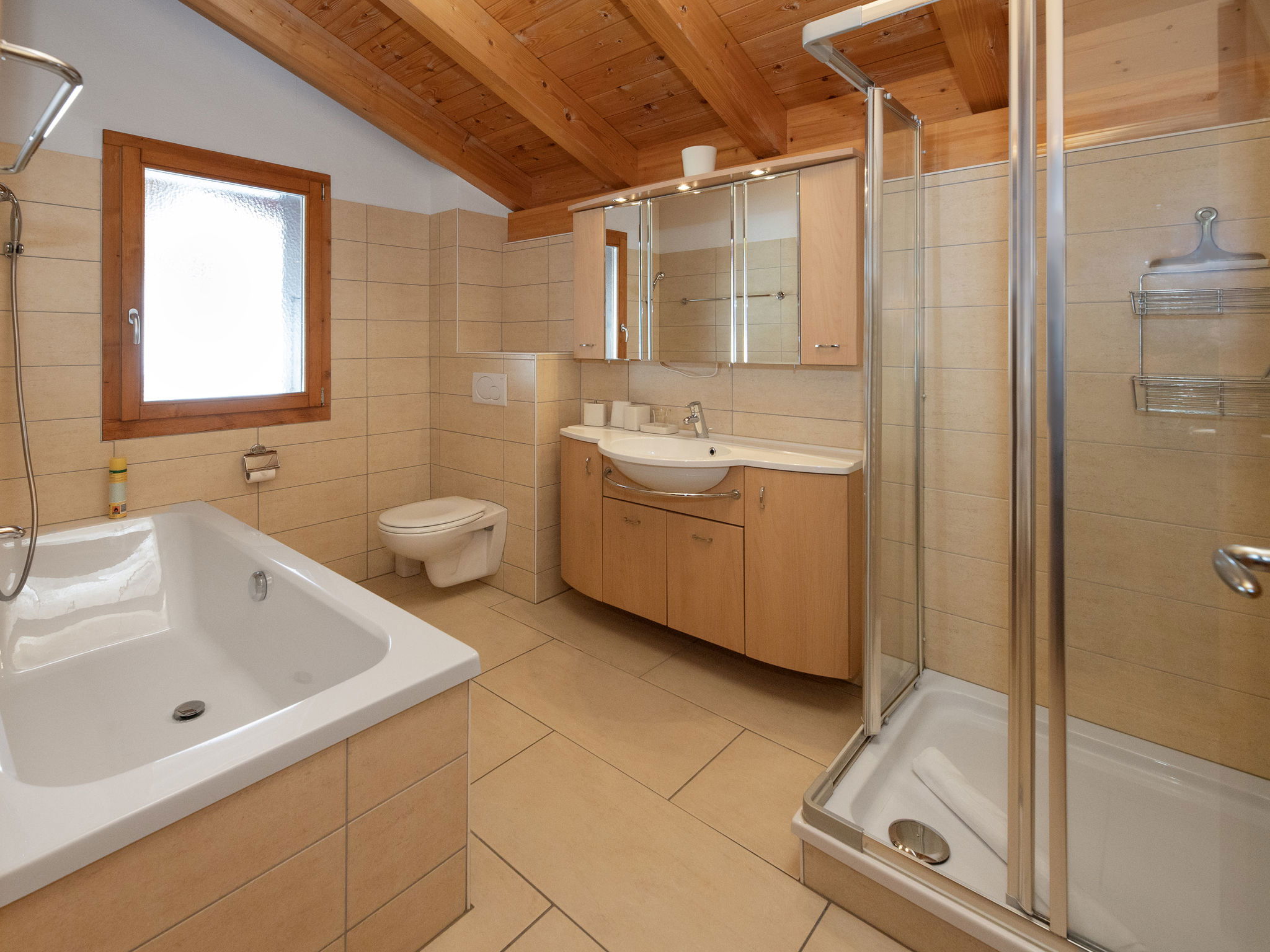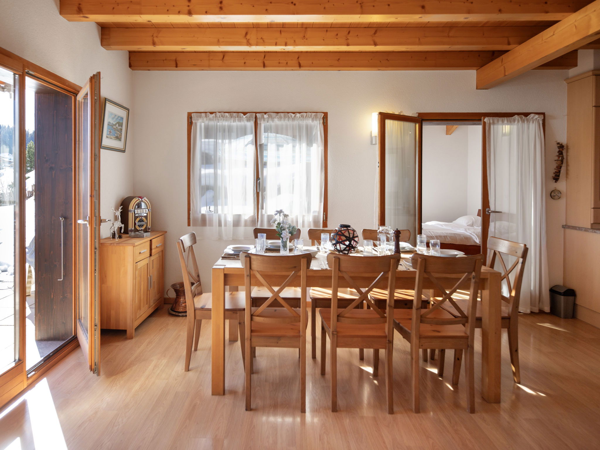 "Orchidée", 5-room chalet 138 m2 on 2 levels, east facing position. Spacious, comfortable and tasteful furnishings: living/dining room with cable TV and wood-burning stove. Exit to the terrace. 1 room with 1 french bed (1 x 160 cm, length 200 cm), shower/WC. Exit to the terrace. Open kitchen (oven, dishwasher, 4 ceramic glass hob hotplates, electric coffee machine, Capsules for coffee machine (Nespresso) extra, raclette grill, fondue Set (chinoise)). Exit to the terrace. Sep. WC. Upper floor: 1 room with 1 double bed (1 x 160 cm, length 200 cm). Exit to the balcony, east facing position. 1 room with 1 double bed (1 x 160 cm, length 200 cm). Exit to the balcony, east facing position. 1 room with 2 beds (90 cm, length 200 cm). Bath/shower/WC. Large terrace, east facing position, lawn. Terrace furniture, deck chairs. Very beautiful panoramic view of the mountains and the valley. Facilities: washing machine, hair dryer. Internet (WiFi, free). Parking (roofed, 2 cars) at the house. Please note: non-smokers only. Maximum 1 pet/ dog allowed.