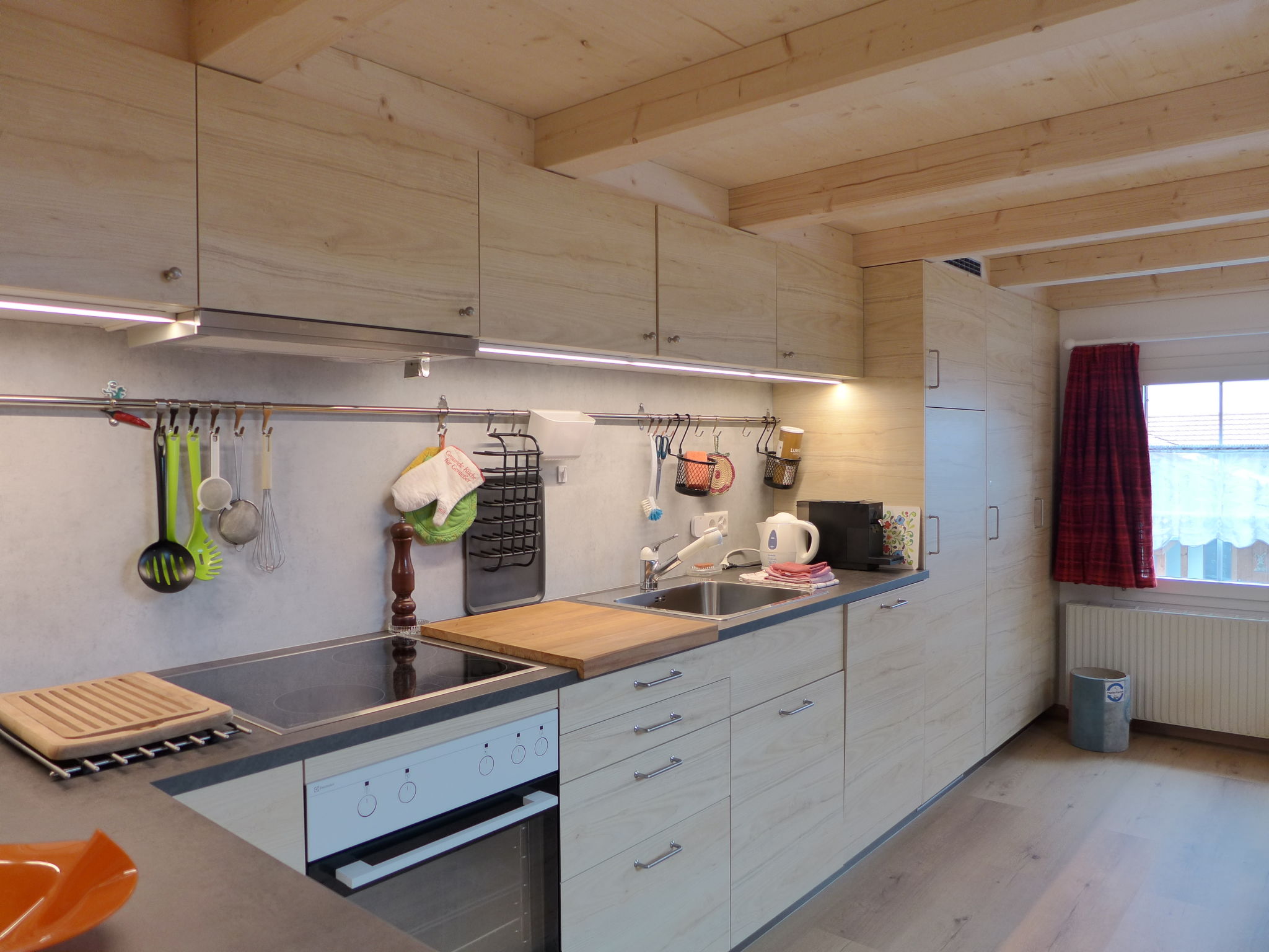 "Beim Thor Klein", 2-room apartment 40 m2, on the upper floor. Spacious and bright, simple and cosy furnishings: open large living/sleeping room with 2 beds (90 cm, length 200 cm), dining table, flat screen, radio, hi-fi system and DVD. 1 room with 1 x 2 bunk beds (90 cm, length 200 cm). Open kitchen (oven, dishwasher, 3 ceramic glass hob hotplates, toaster, kettle, microwave, electric coffee machine, Capsules for coffee machine (Delizio) extra, raclette grill, fondue Set (cheese)). Shower/WC. Small terrace. Balcony furniture. Beautiful view of the mountains and the countryside. Facilities: baby cot for up to 2 year olds (extra), hair dryer. Internet (WiFi, free). Parking (1 car). Please note: non-smokers only. Maximum 1 pet/ dog allowed.