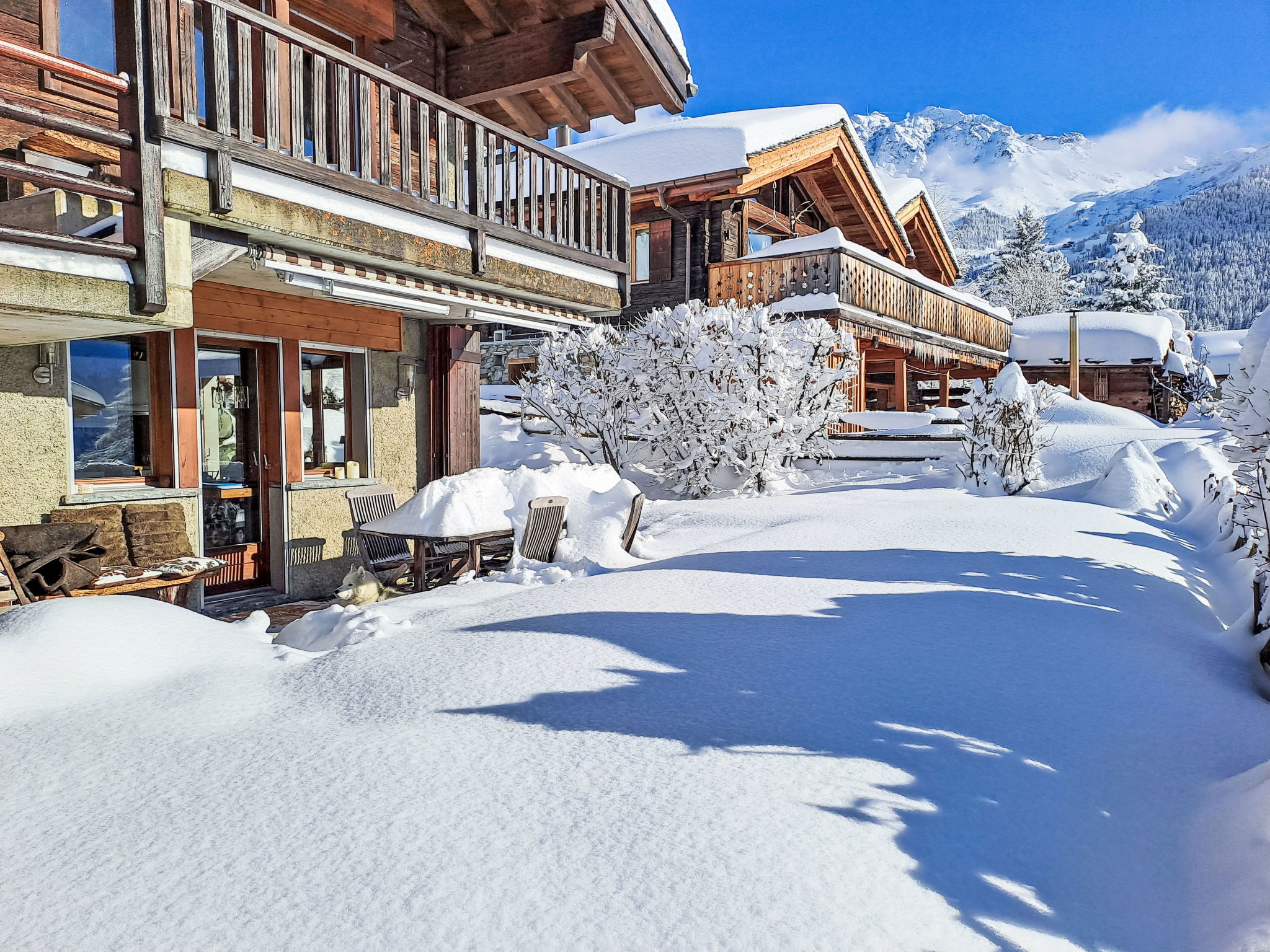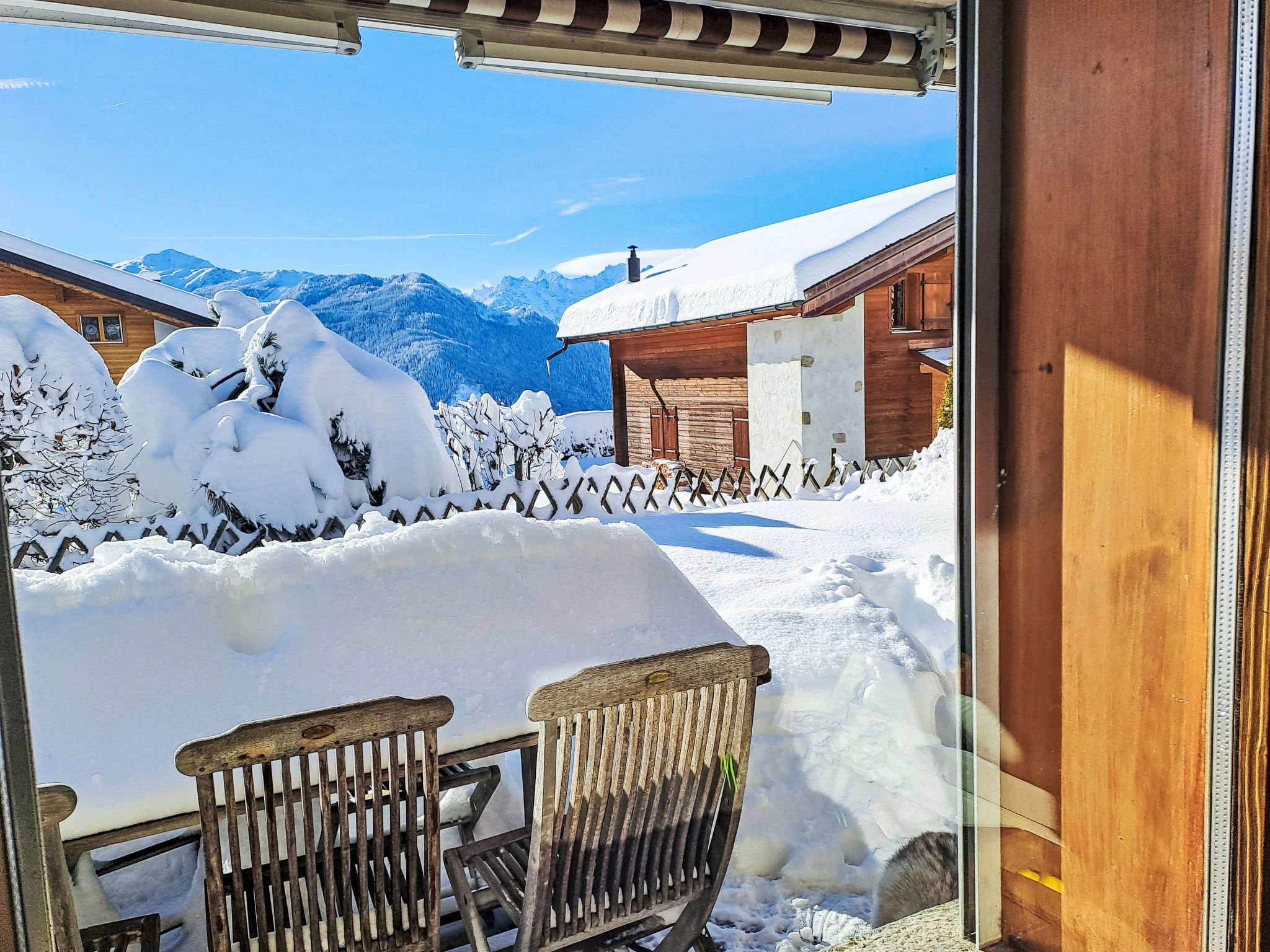 "Praz 11", 4-room apartment 90 m2 on 2 levels. Fully renovated in 2013, comfortable and modern furnishings: large living/dining room with open-hearth fireplace, cable TV, DVD and electric heating. Exit to the garden, to the terrace. Open kitchen (2 hot plates, oven, dishwasher, 2 induction hot plates, electric coffee machine, Capsules for coffee machine (Nespresso) extra, raclette grill, fondue Set (cheese)). Exit to the garden. Sep. WC. Upper floor: 1 large room with 1 french bed (1 x 160 cm, length 200 cm), cable TV. Exit to the balcony. 1 room with 1 french bed (1 x 160 cm, length 200 cm). Exit to the balcony. 1 room with 1 french bed (1 x 140 cm, length 200 cm). Exit to the garden. Bath/WC, shower/WC. Terrace furniture, barbecue. Very beautiful view of the mountains. Facilities: Internet (WiFi, free). Parking (2 cars), garage space n pour petite voiture. Please note: non-smoking house. Maximum 1 pet/ dog allowed. The bedroom with the bunk beds also has an extra sleeping possibility 140 x 190 cm in size in the gallery with very sloping ceilings (height of 1m).