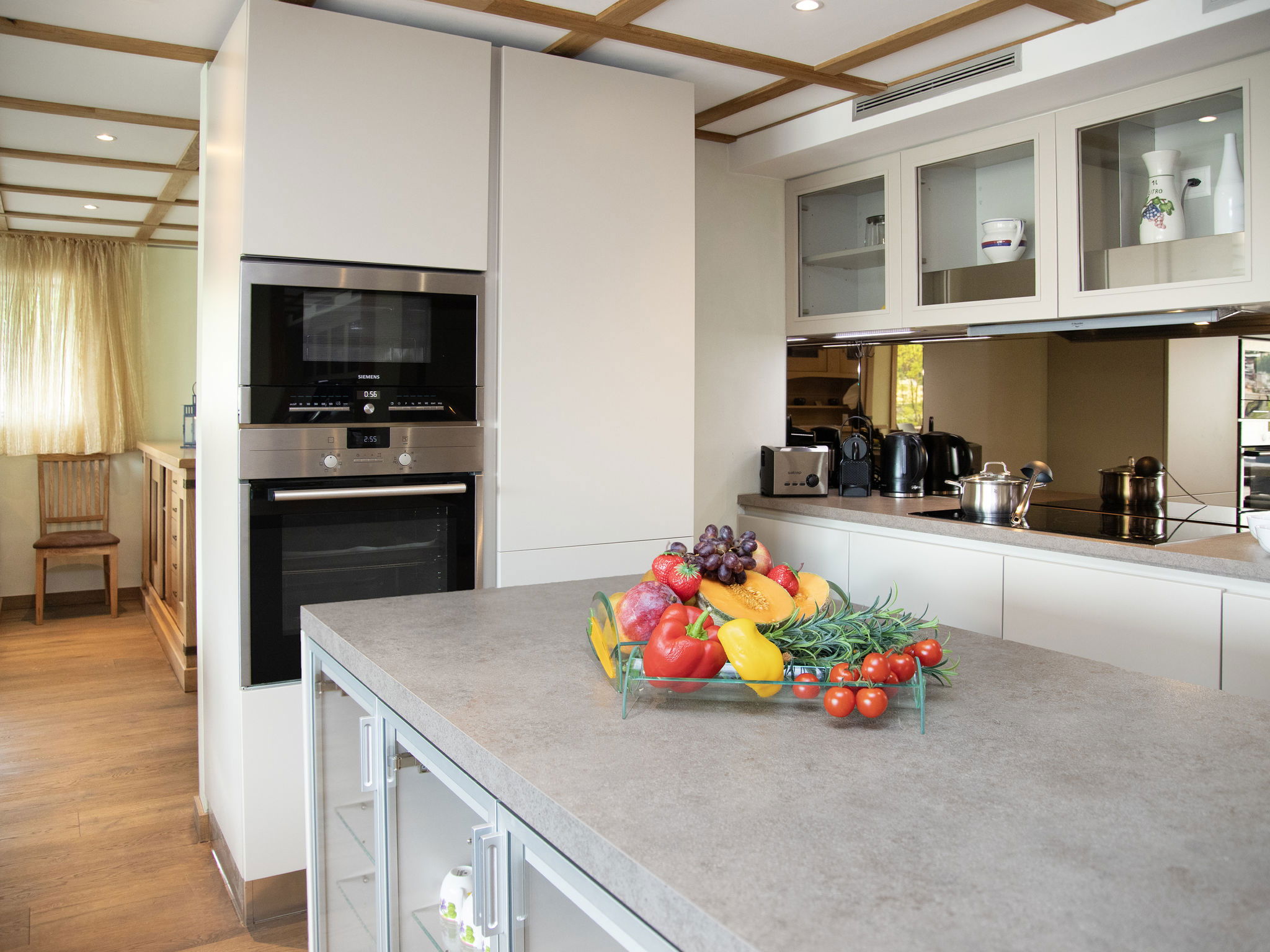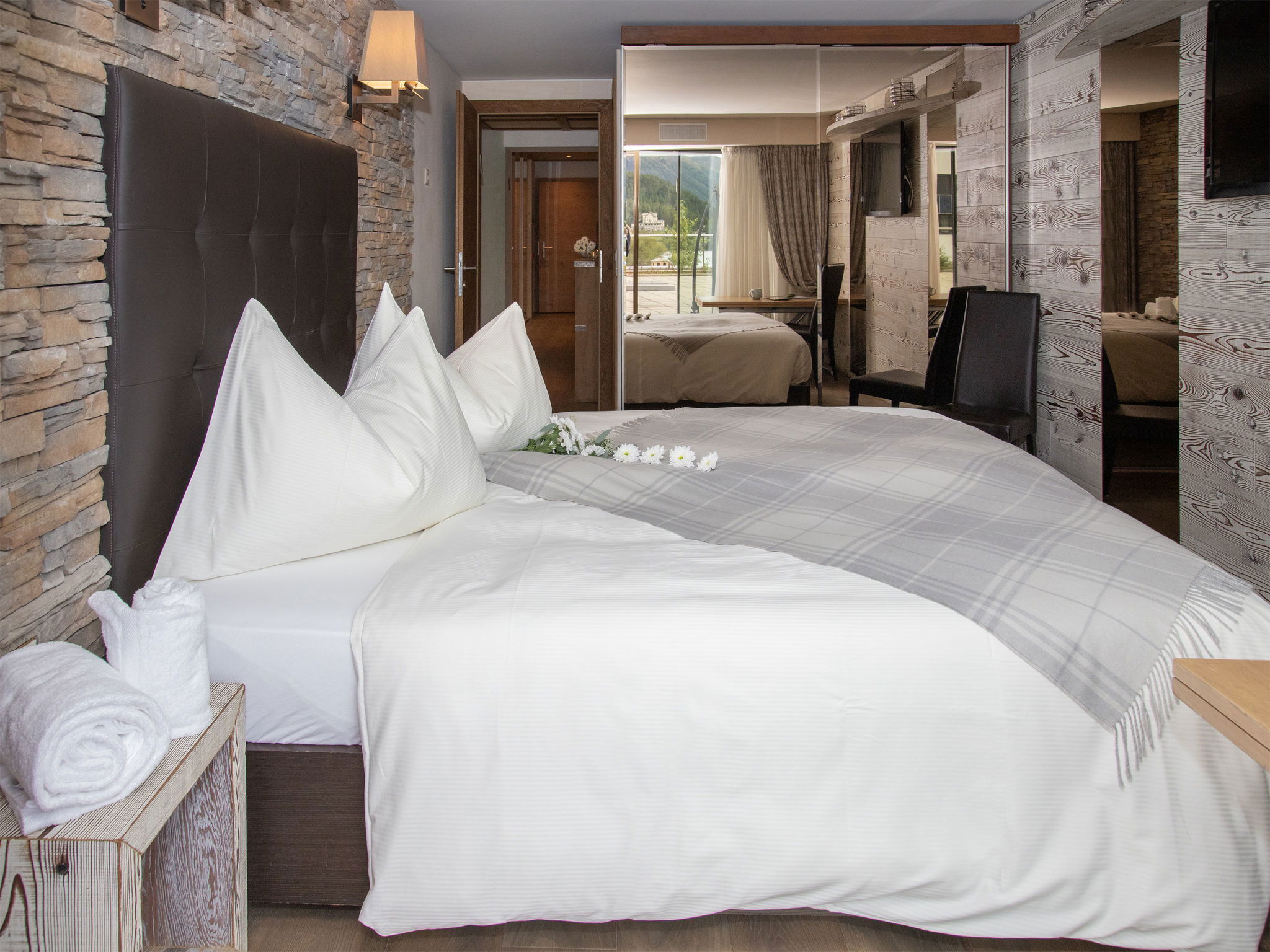 "Chesa Piz Mezdi - St. Moritz", 3-room apartment 120 m2 on 2nd floor. Spacious and bright, comfortable and stylish furnishings: open living/dining room with panoramic window with dining table, kitchen corner and TV (flat screen). Exit to the terrace, east facing position. 1 room with 1 french bed (1 x 170 cm, length 200 cm), shower/bidet/WC. 1 room with 1 double bed (1 x 180 cm, length 200 cm), bath/bidet/WC and TV (flat screen). Exit to the terrace. Large kitchen-/living room (oven, dishwasher, 4 induction hot plates, toaster, kettle, microwave, freezer, electric coffee machine, Capsules for coffee machine (Nespresso) extra, raclette grill, fondue Set (cheese)). Sep. WC, Sauna. Heating. Wooden floors. Terrace furniture, barbecue (portable). Beautiful view of the lake, the mountains and the countryside. Facilities: iron, hair dryer. Internet (WiFi, free). Garage space n 4 at 300 m, height 205 cm, width 240 cm. Please note: not suitable for children under 6 years. Non-smokers only, non-smoking house. -Terrace 170 mq (summer only) - is used by 2 apartments.