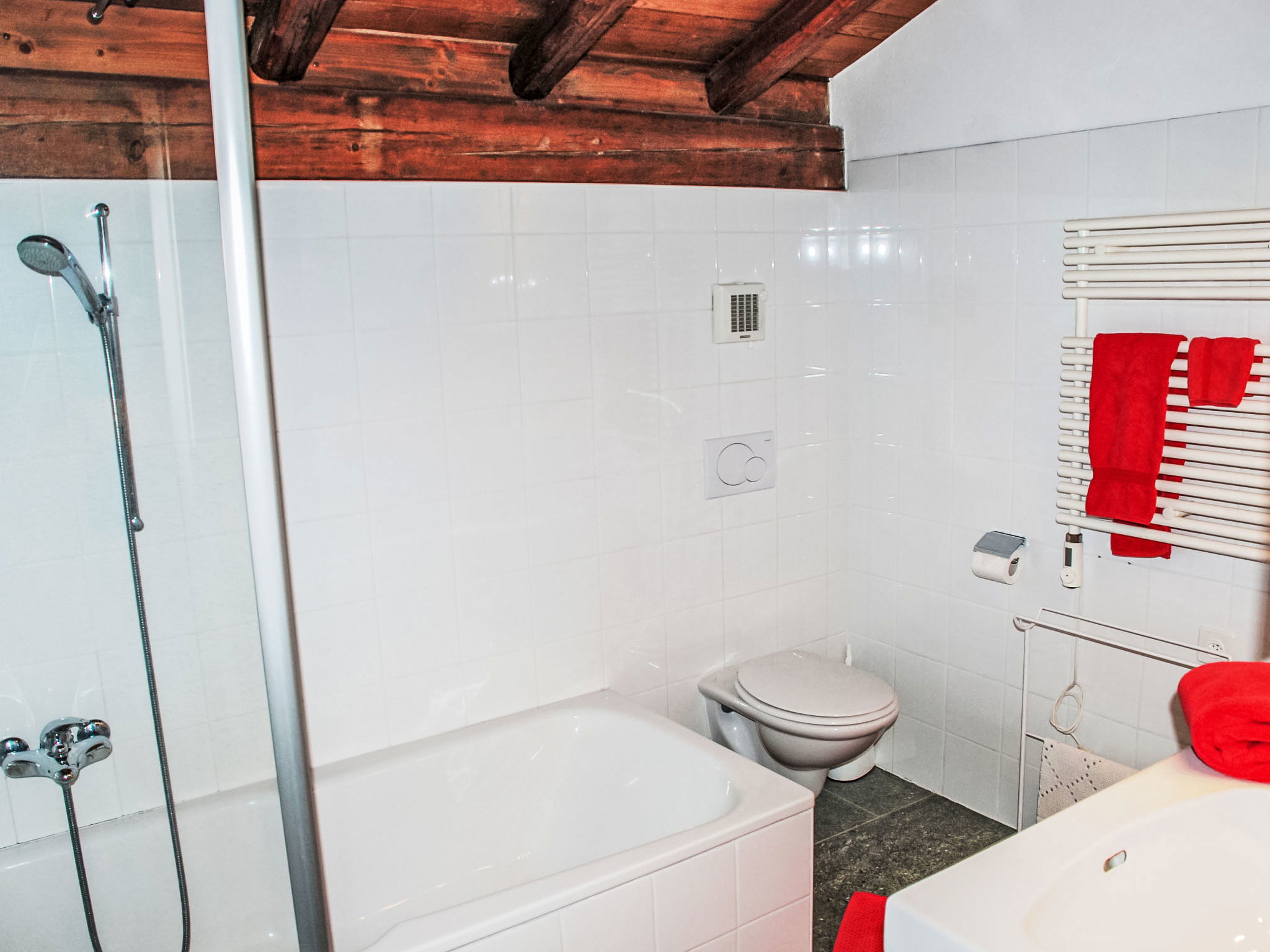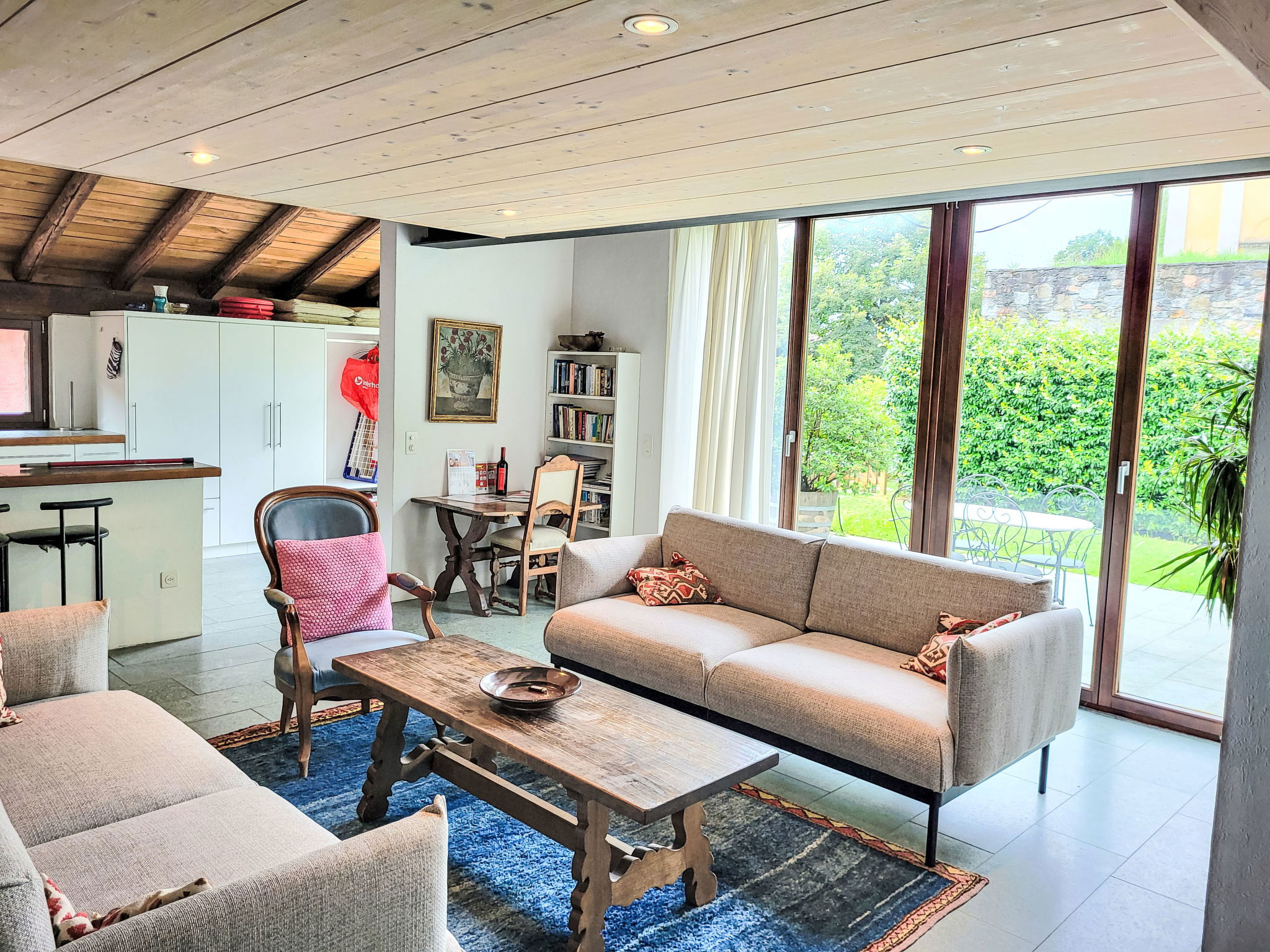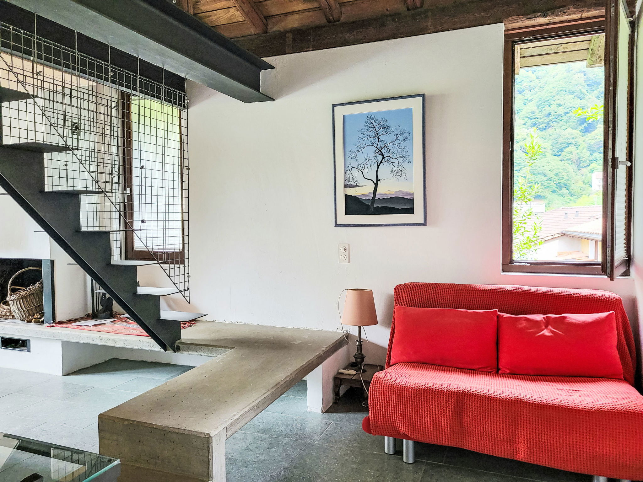 "Cantagallo", 1-room apartment 73 m2 on 2 levels, on the ground floor. Spacious and bright, tasteful and cosy furnishings: open large living/dining room with 1 sofabed (140 cm), open-hearth fireplace, dining table, cable TV and radio. Exit to the patio. Open gallery with 1 double bed (160 cm, length 200 cm). Large, open kitchen (oven, 4 ceramic glass hob hotplates, toaster, kettle, microwave, freezer, electric coffee machine, Capsules for coffee machine (Delizio (Migros)) extra). Bath/WC. Floor heating. Large patio. Terrace furniture, barbecue, deck chairs (2). View of the countryside and the resort. Facilities: Internet (WiFi, free). Please note: non-smokers only. Maximum 1 small pet/ dog allowed. Instead of an enclosed bedroom, some sleeping areas are located in an open-plan area (gallery, alcove, etc.). NL-00004399