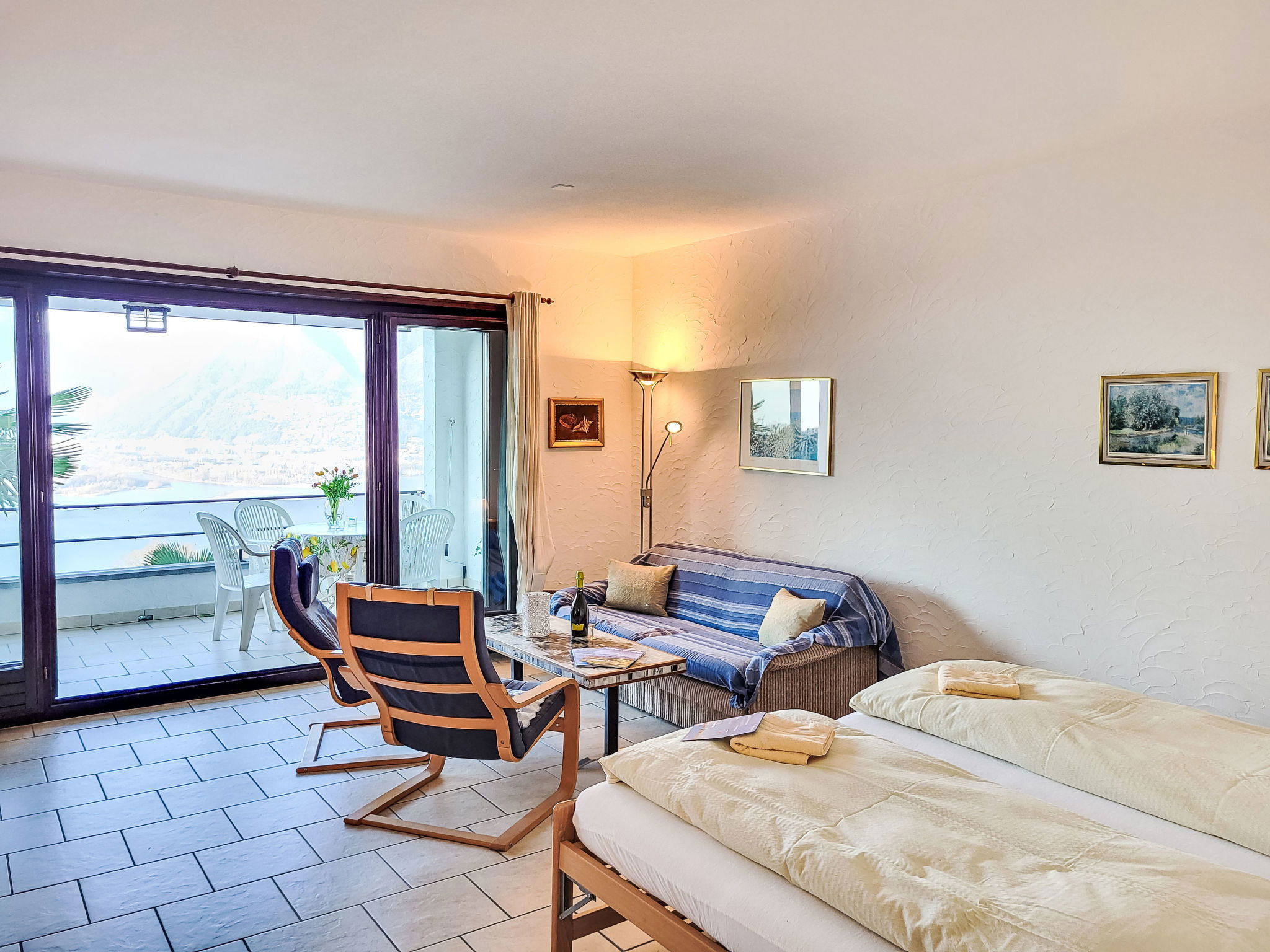 "Residenza Miralago Apt. A6", 2-room apartment 70 m2 on 1st floor. Living/dining room with 2 beds and TV. 1 room with 2 beds. Kitchenette in the entrance (oven, dishwasher). Bath/WC. Balcony. Terrace furniture. View of the lake. Maximum 1 pet/ dog allowed. NL-00003542