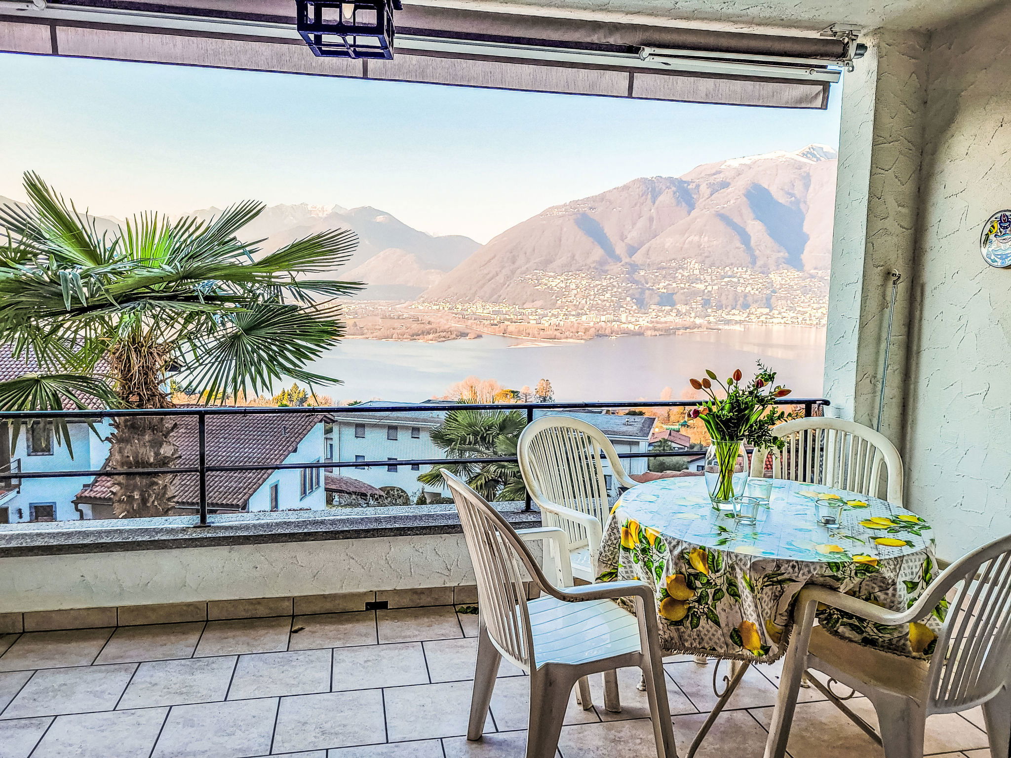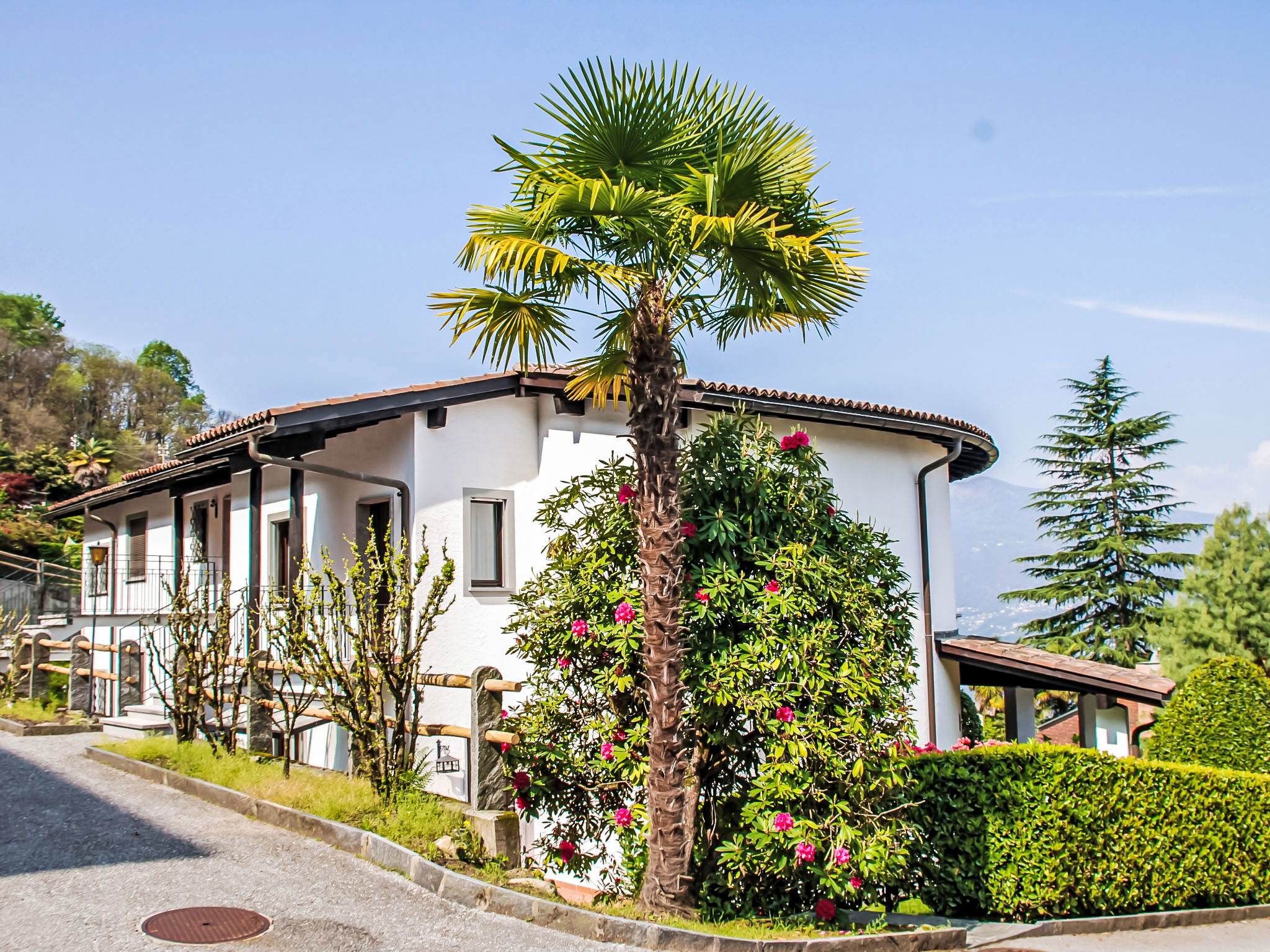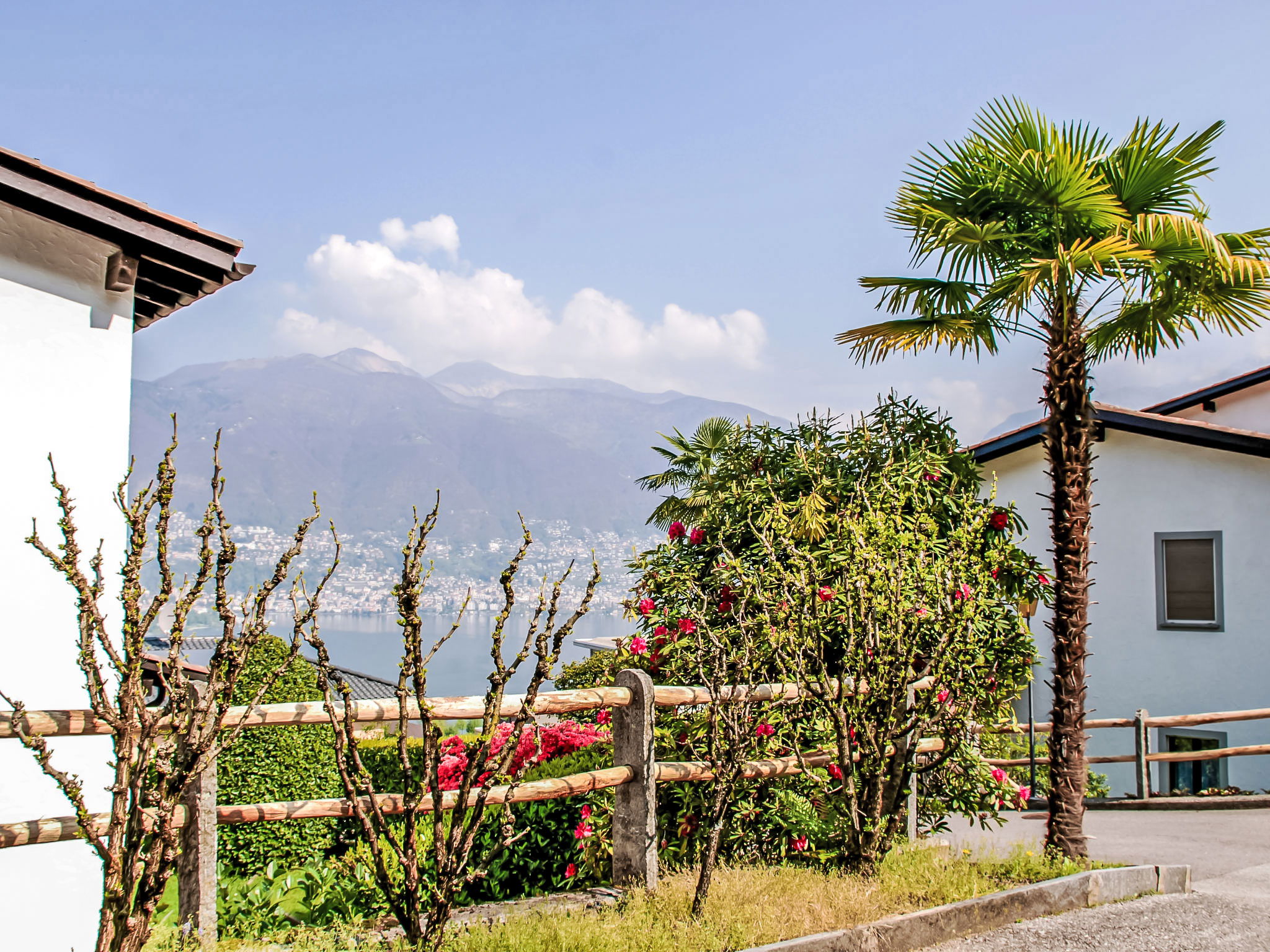 Piazzogna 19 km from Ascona: Modern, comfortable residence "Miralago", surrounded by trees and meadows. 4 houses in the residence. 39 apartments in the residence. Above Vira (3 km), in the district Gambarogno, in a quiet, sunny, elevated position on a slope, along the wooded area, 3 km from the lake, in a cul-de-sac, south-east facing position. For shared use: lawn for sunbathing, swimming pool angular heated (depth 170 - 170 cm, seasonal availability: 15.Apr. - 15.Oct.) with internal staircase and shutter cover. Outdoor shower, terrace, garden furniture. In the complex: reception, lounge, central heating system, washing machine (for shared use, extra). Motor access to the house the grounds. Parking. Grocery, restaurant 300 m, bus stop 50 m. Minigolf 4.5 km, walking paths from the house 100 m. Nearby attractions: Parco Botanico, Piazzogna 300 m, Mercato Luino IT, Mercato Ponte Tresa IT, Bellinzona Unesco-Mercato, Swissminiature, Melide, Schokomuseum, Caslano. Well-known lakes can easily be reached: Lago Maggiore, Lago di Lugano, Lago di Como, Lago Orta. Hiking paths: Gambarogno, Indemini, Monte Tamaro und Splash and SPA, Rivera, Locarno - Ascona Cardada. The 4 typical Ticino houses offer a magnificent panoramic view of the lake. 1 parking space per apartment is included in the price, each additional space is CHF 35/week.