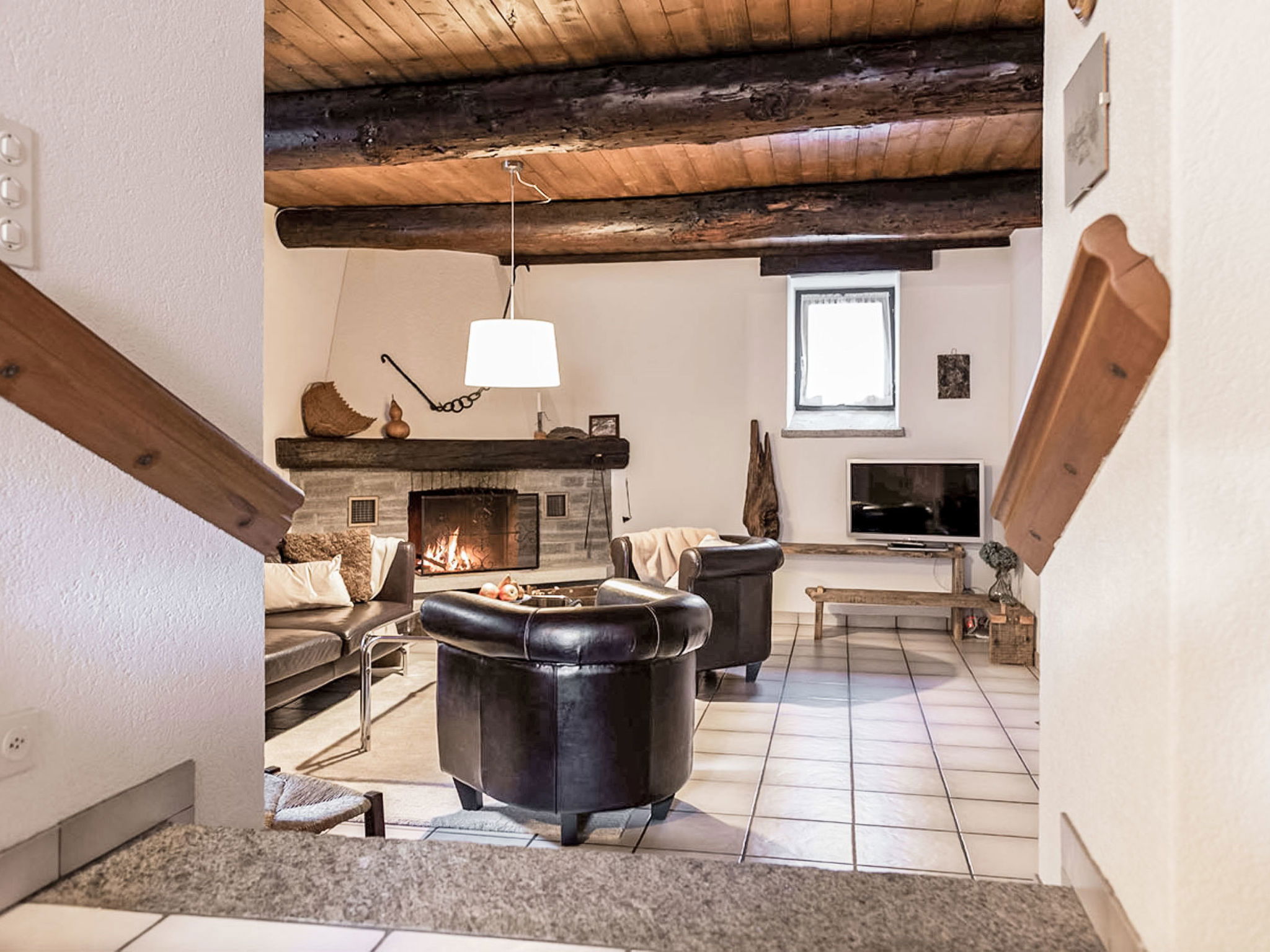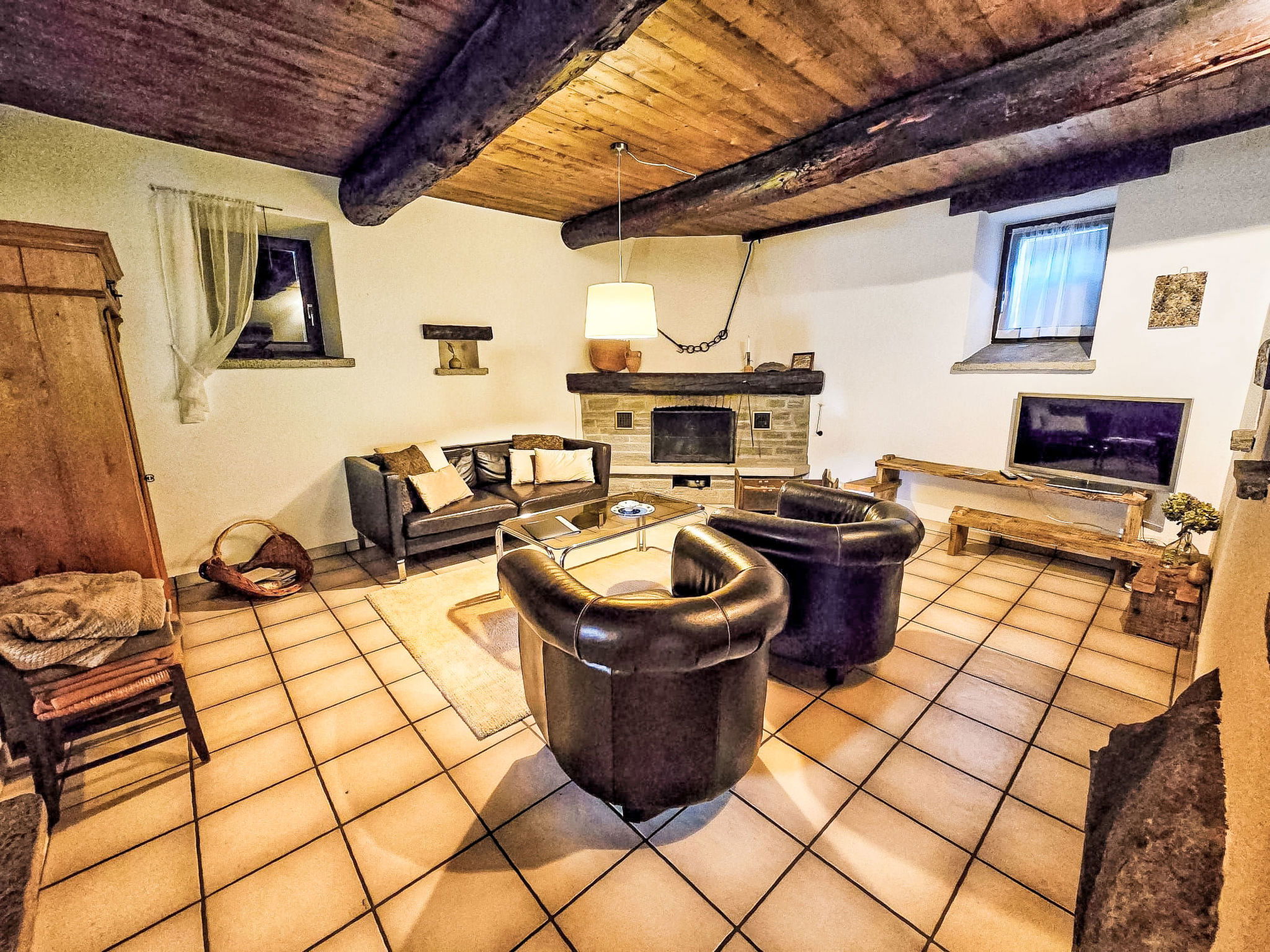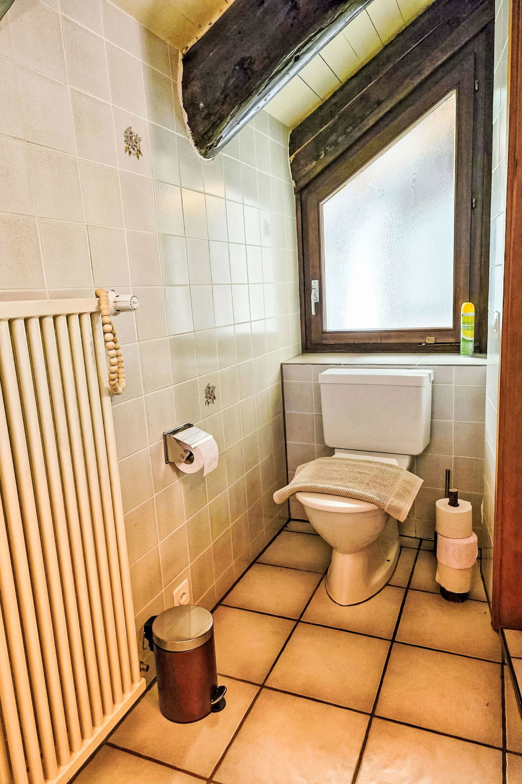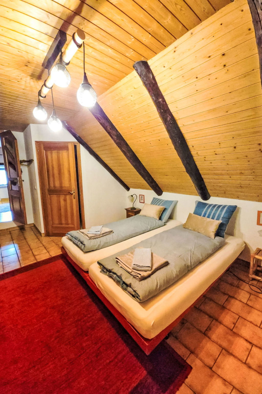 4-room house 100 m2. Spacious, partly with sloping ceilings, comfortable and rustic furnishings: open living/dining room with open-hearth fireplace, dining table and satellite TV (flat screen), radio. Exit to the garden, to the terrace. 1 double bedroom with 1 french bed (140 cm, length 200 cm). Exit to the garden. Open kitchen (4 hot plates, oven, kettle, freezer, raclette grill, fondue Set (cheese)) with dining table. Bath/WC, shower/WC. Oil heating, boiler (200 litres). Upper floor: 2 rooms, each room with 2 beds (90 cm, length 190 cm). (electric coffee machine, Capsules for coffee machine (nespresso) extra). Terrace 18 m2. Beautiful view of the mountains and the countryside. Facilities: washing machine, dryer, hair dryer. Please note: non-smokers only. Maximum 1 small pet/ dog allowed. NL-00007352