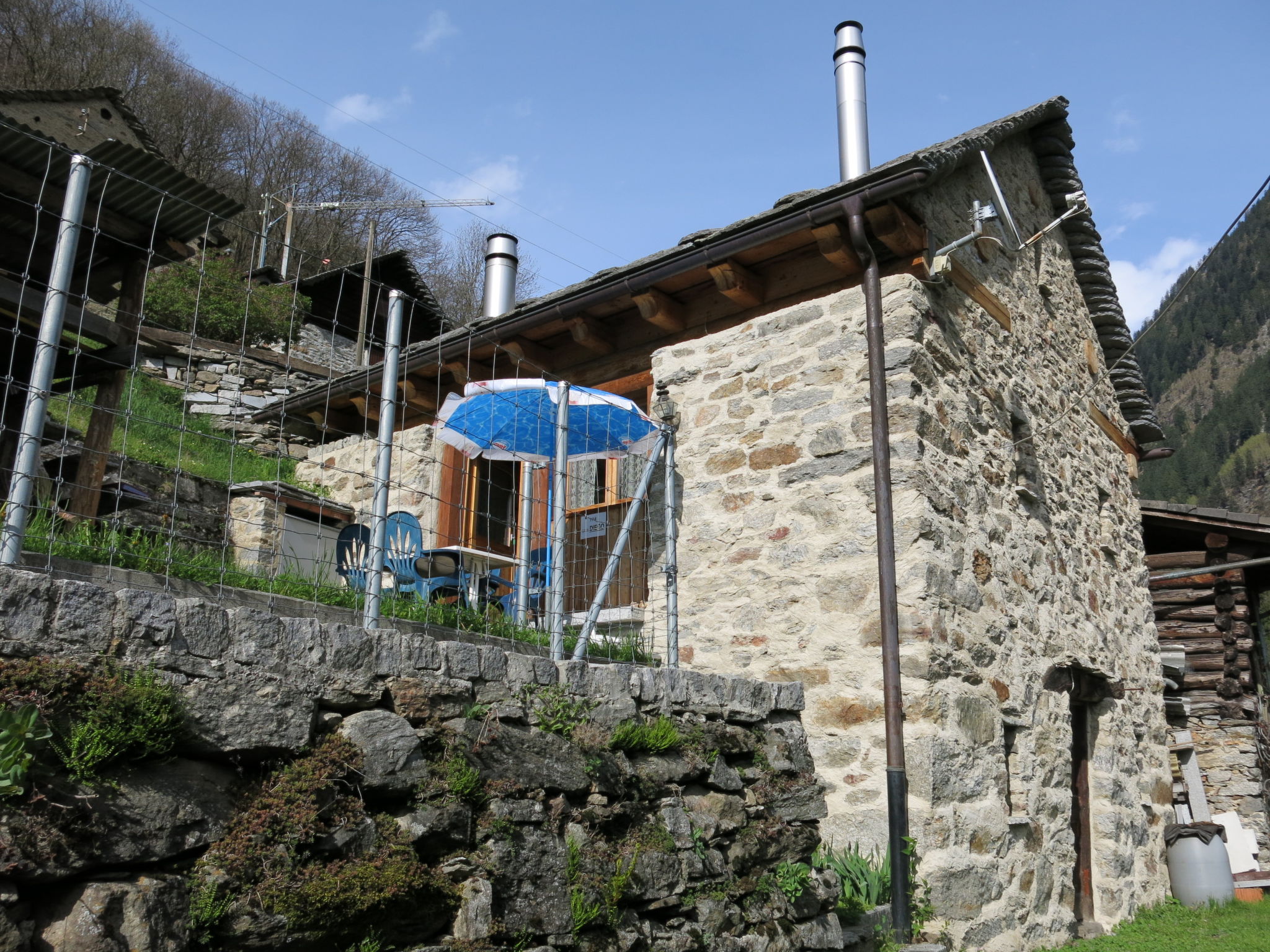 Pontei 8 km from Malvaglia: Rustic, simple single-family house "Rustico Diego", 787 m a.s.l., surrounded by trees and meadows. 8 km from the centre of Malvaglia, 14 km from the centre of Biasca, 33 km from the centre of Bellinzona, in the district Valle di Blenio, in a cul-de-sac. Private: property 50 m2, terraced garden lawn. Terrace, garden furniture. 8 km long narrow motor access (mountain road). (10 steps). Parking at the house. Supermarket 8 km, restaurant 8 km, bakery 8 km, bicycle rental 8 km, bus stop "Malvaglia Chiesa bus 131-140" 8 km, railway station "Biasca FFS - SBB" 13.5 km. Cable car 8 km. Nearby attractions: Molino di Dandrio, Castelli di Bellinzona UNESCO, Mercato di Bellinzona (sabato), Negrentino, Museo della Valle di Blenio, Archivio Donetta, Castello di Serravalle. Well-known lakes can easily be reached: Lago di Luzone, Lago Retico, Lago Ritom, Lago Maggiore, Lago di Lugano. Hiking paths: Montegreco, Capanna Quarnei, Capanna Prou, Val Malvaglia, Valle di Blenio, Lucomagno. Please note: car recommended.