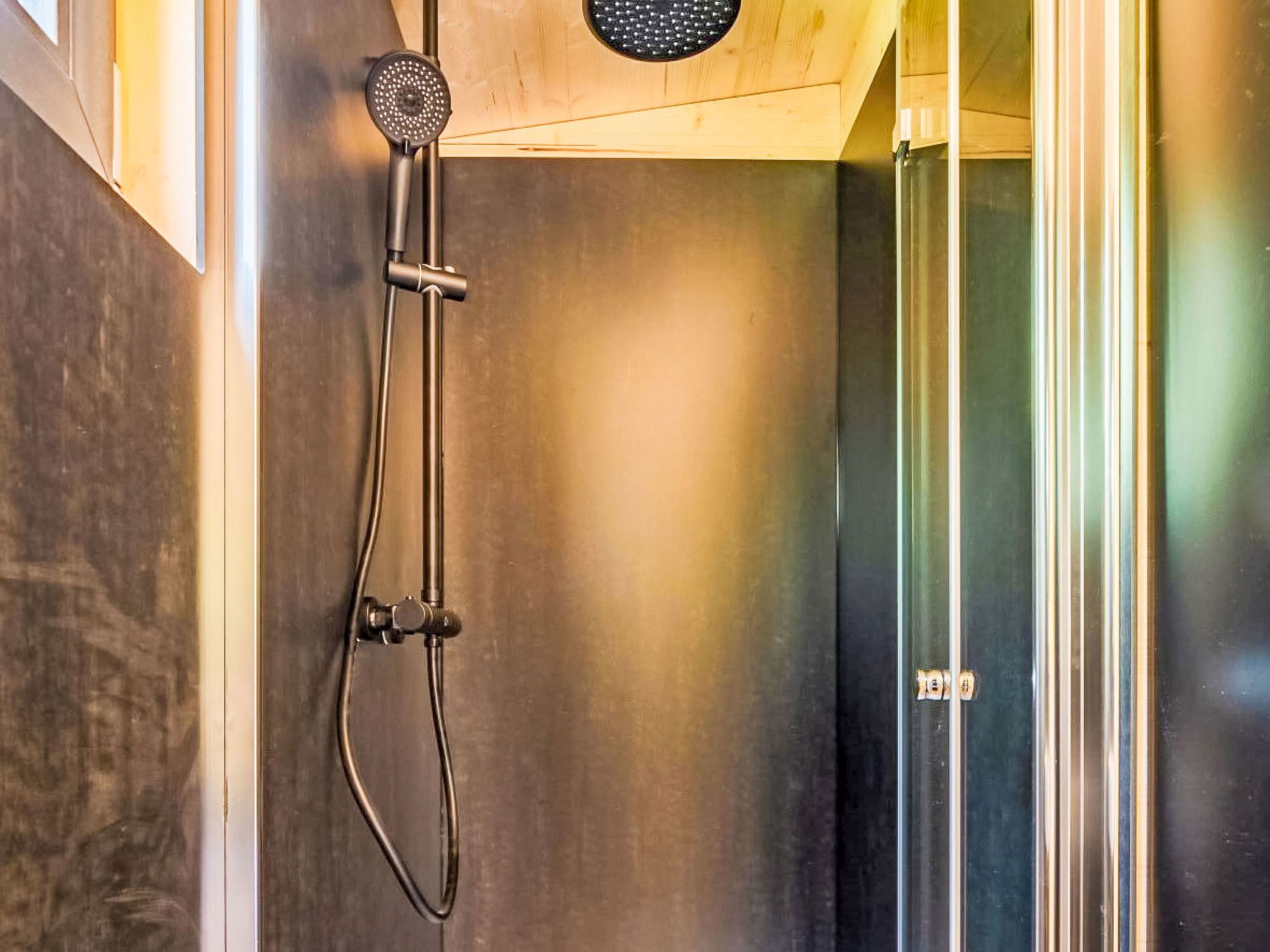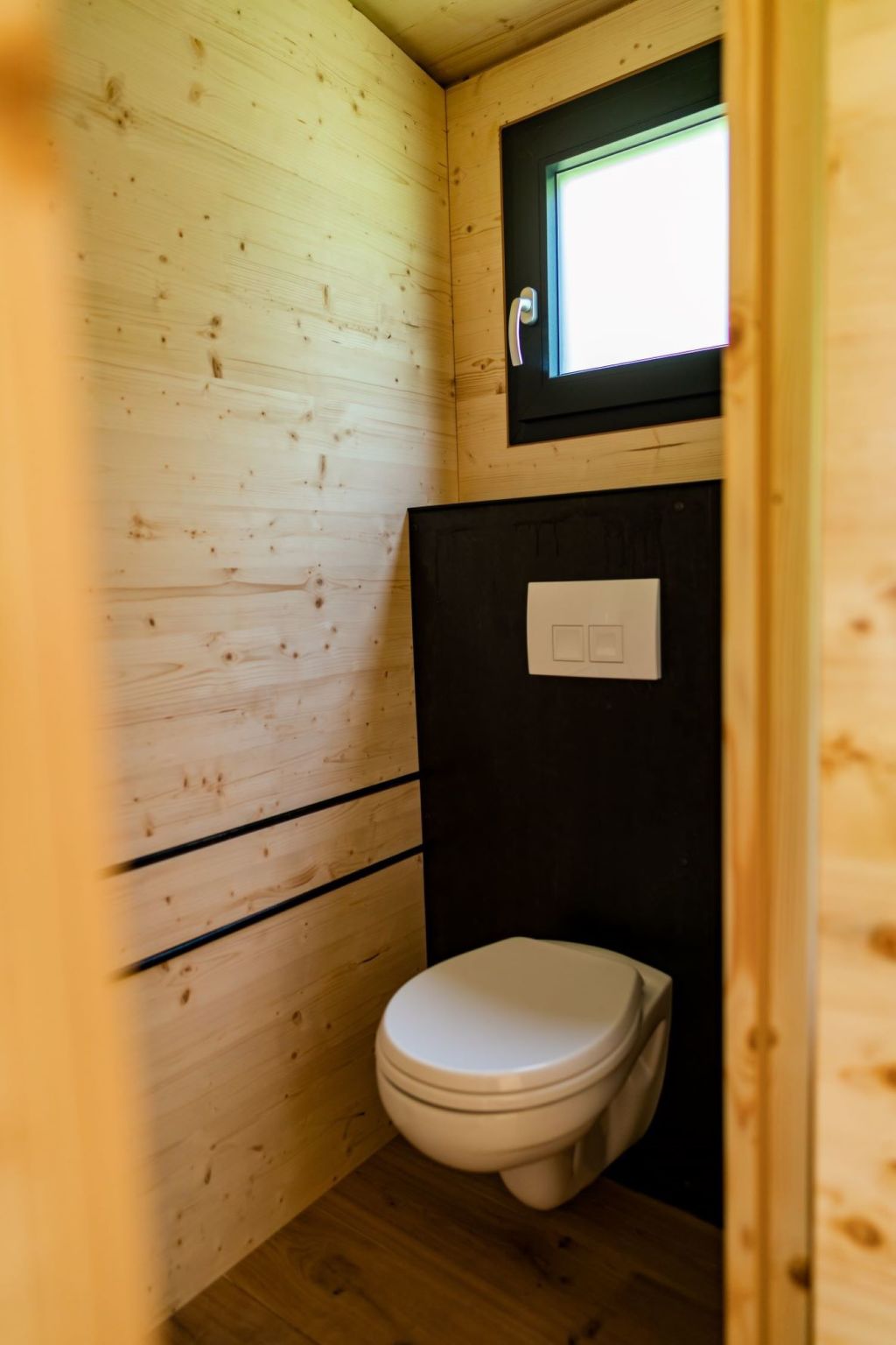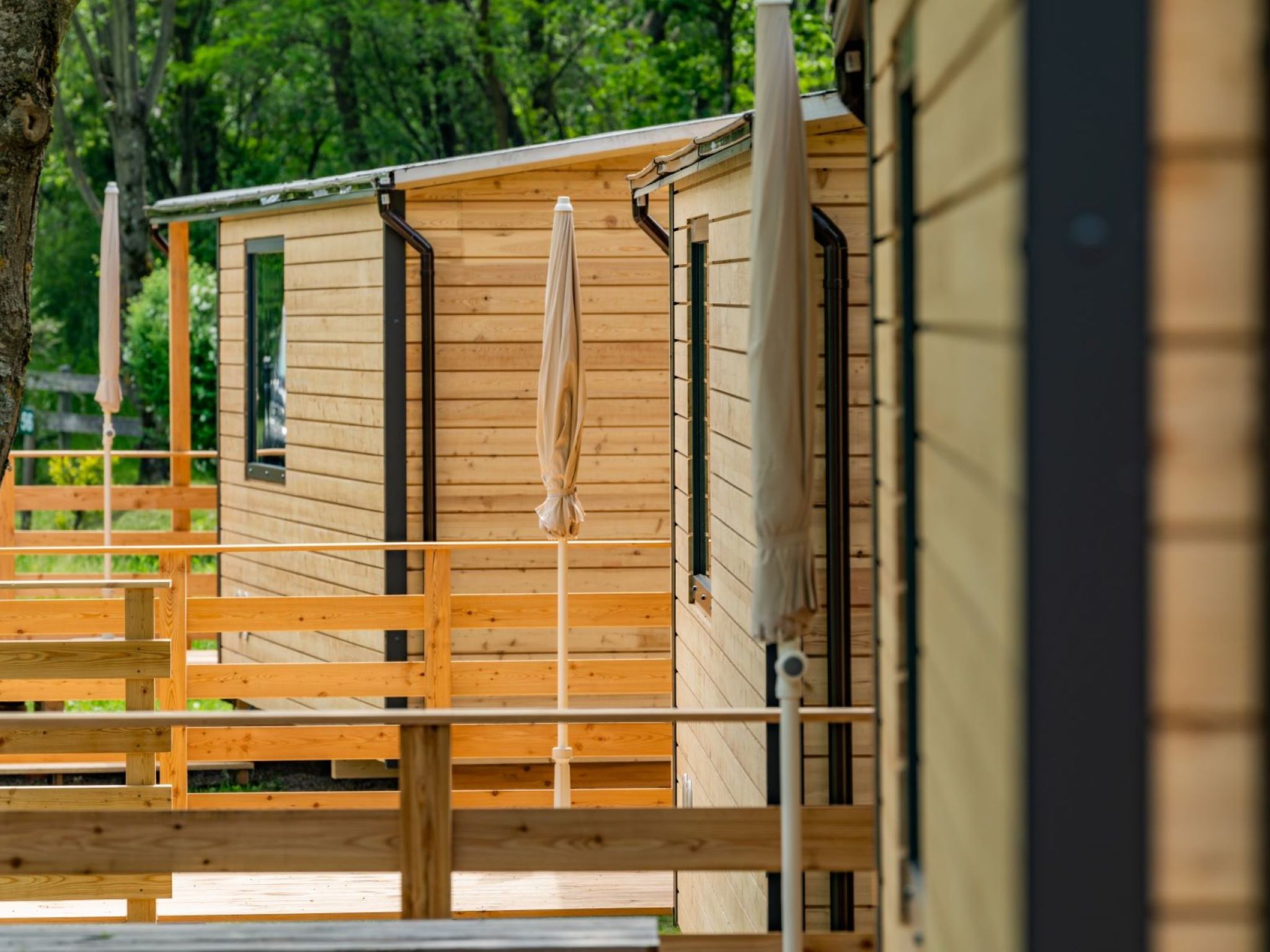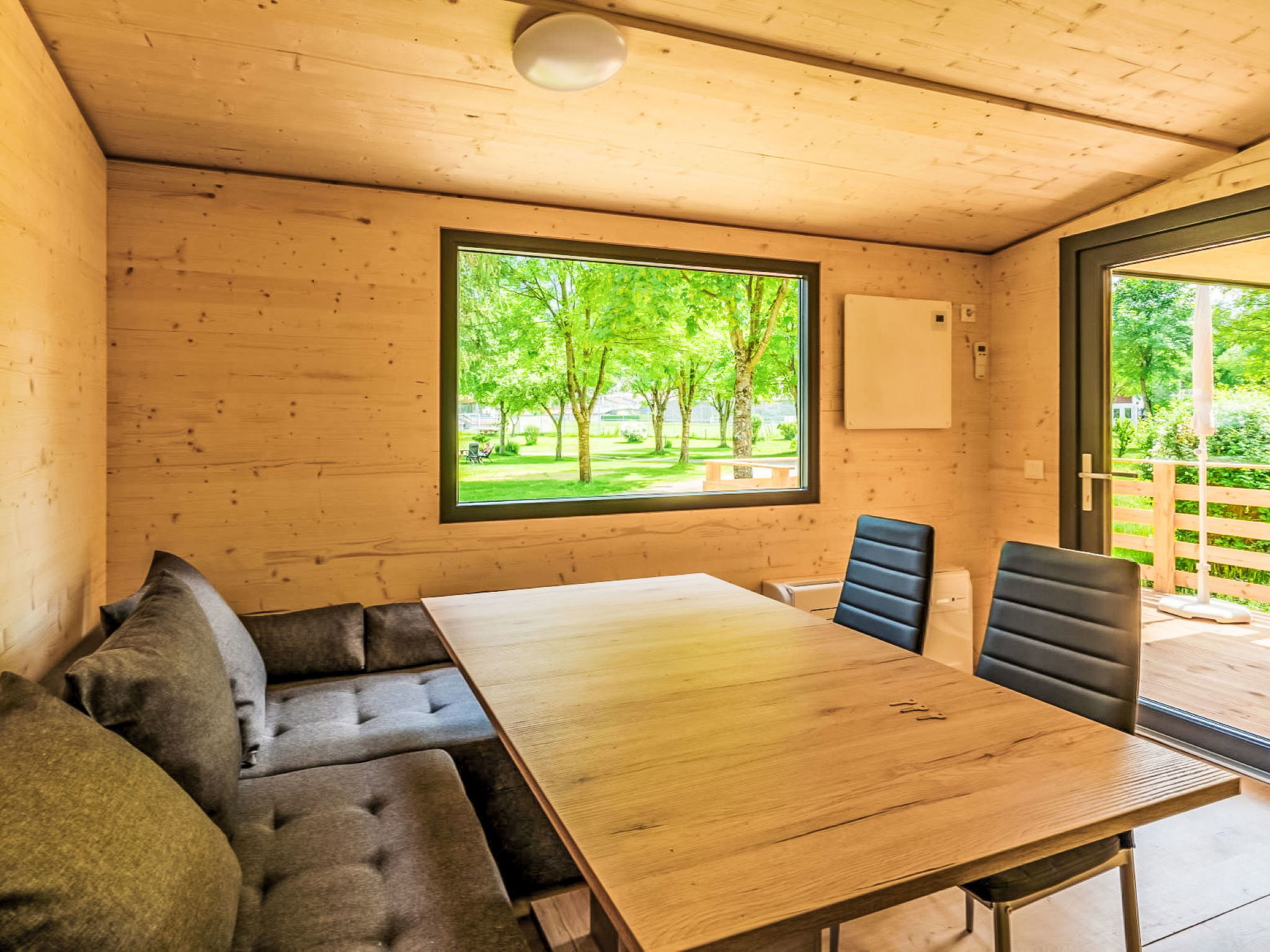 "Wood Cube", 3-room mobile home 24 m2. Object suitable for 4 adults. Comfortable and modern furnishings: 1 double bedroom with 1 french bed (160 cm, length 200 cm). 1 room with 2 beds (80 cm, length 200 cm). Kitchen-/living room (4 induction hot plates, microwave, electric coffee machine, raclette grill) with 1 sleeping facility (130 cm, length 190 cm), dining table, satellite TV and air conditioning. Exit to the terrace. Shower, sep. WC. Electric heating, air-conditioning. Terrace 9 m2, roofed. Terrace furniture, electric barbecue (portable), deck chairs. View of the mountains and the countryside. Facilities: Internet (WiFi, free). Please note: non-smokers only. Private mooring (extra). Maximum 1 pet/ dog allowed.