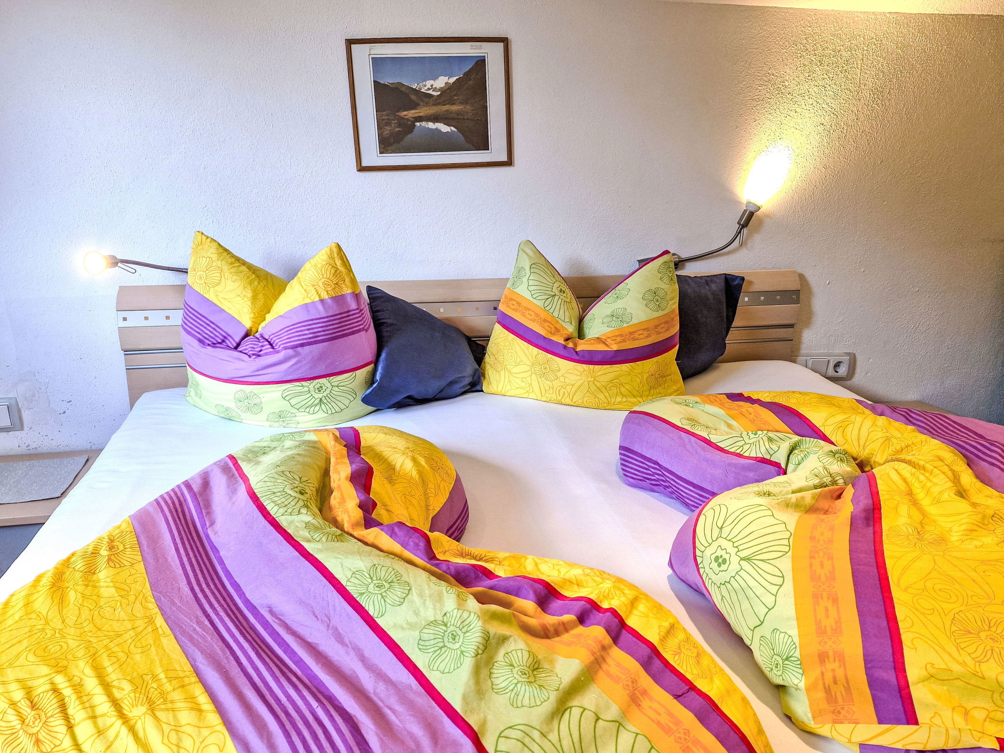 "Simone", 2-room apartment 35 m2 on 2nd floor. Practical furnishings: 1 room with 1 double bed, shower/WC and satellite TV. Kitchen-/living room (mini-oven, 2 ceramic glass hob hotplates, electric coffee machine) with dining table, 1 double sofabed and satellite TV. Oil heating. Facilities: children's high chair, baby cot for up to 2 year olds. Internet (WiFi, free). Please note: maximum 1 pet/ dog allowed. Private entrance. The door to the shower//WC is only medium-high. When there are less than the maximum number of guests staying at the property, not all of the housing units will be available for use.