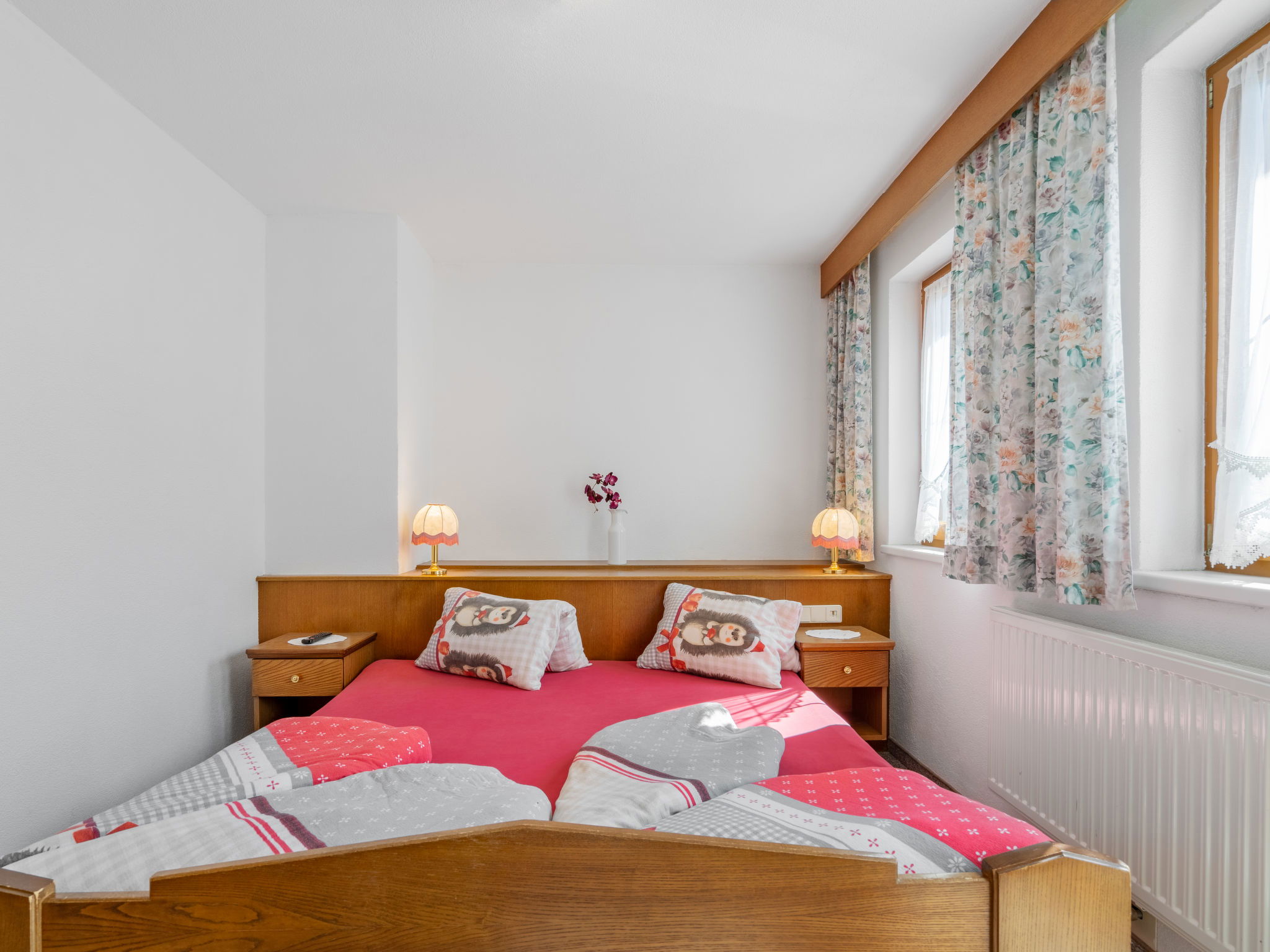 "Rosi", 4-room apartment 80 m2 on 2 levels. 1 room with 2 beds and satellite TV (flat screen). Exit to the terrace. Kitchen-/living room (3 ceramic glass hob hotplates, kettle, microwave, freezer, electric coffee machine) with dining nook. Sep. WC. Upper floor: 2 rooms, each room with 1 double bed and satellite TV. Exit to the balcony. Shower, sep. WC, double hand-basin. Oil heating. Carpet. Balcony, terrace. Facilities: Internet (WiFi, free). Please note: non-smokers only. Maximum 2 pets/ dogs allowed. The appartment is not closed off by a door to the staircase. When there are less than the maximum number of guests staying at the property, not all of the bedrooms will be available for use.