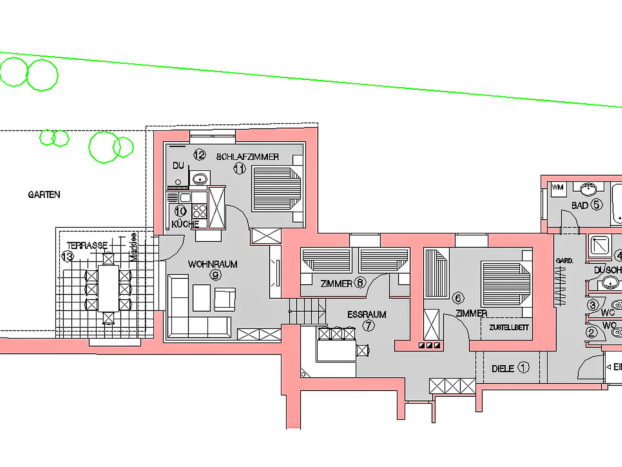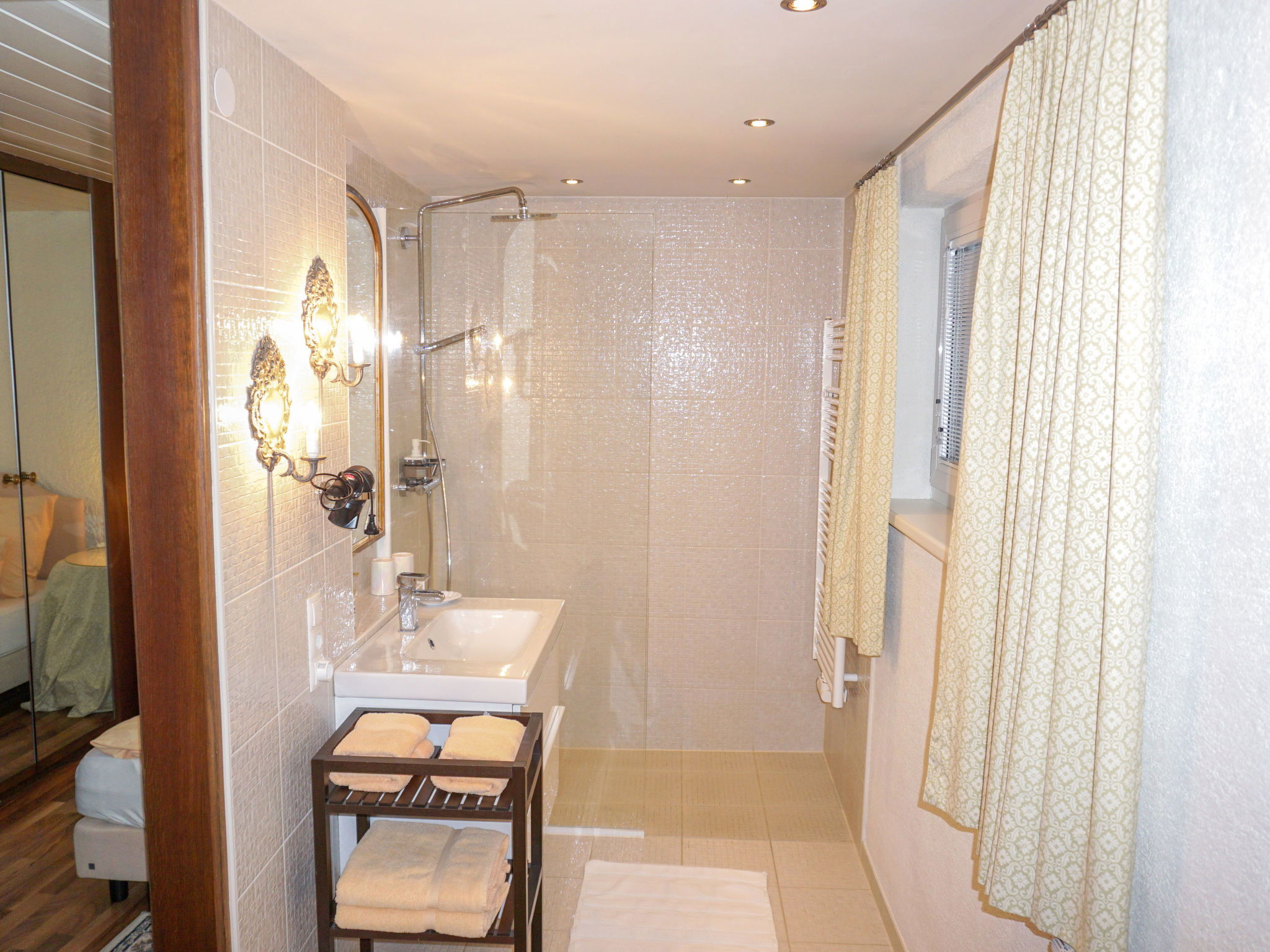 4-room apartment 110 m2, on the ground floor. Comfortable furnishings: living room with satellite TV (flat screen), hi-fi system. Exit to the garden, to the terrace. Open dining room. 1 double bedroom with shower. 1 room with 1 bed and 1 double bed. 1 room with 2 beds. Small kitchenette (4 hot plates, dishwasher, toaster, kettle, microwave, electric coffee machine). Bathroom, shower, 2 sep. WC's. Terrace. Terrace furniture. Facilities: iron, hair dryer. Internet (WiFi, free). Please note: maximum 1 pet/ dog allowed. Private entrance. The living room and the dining room are connected through some small stairs.