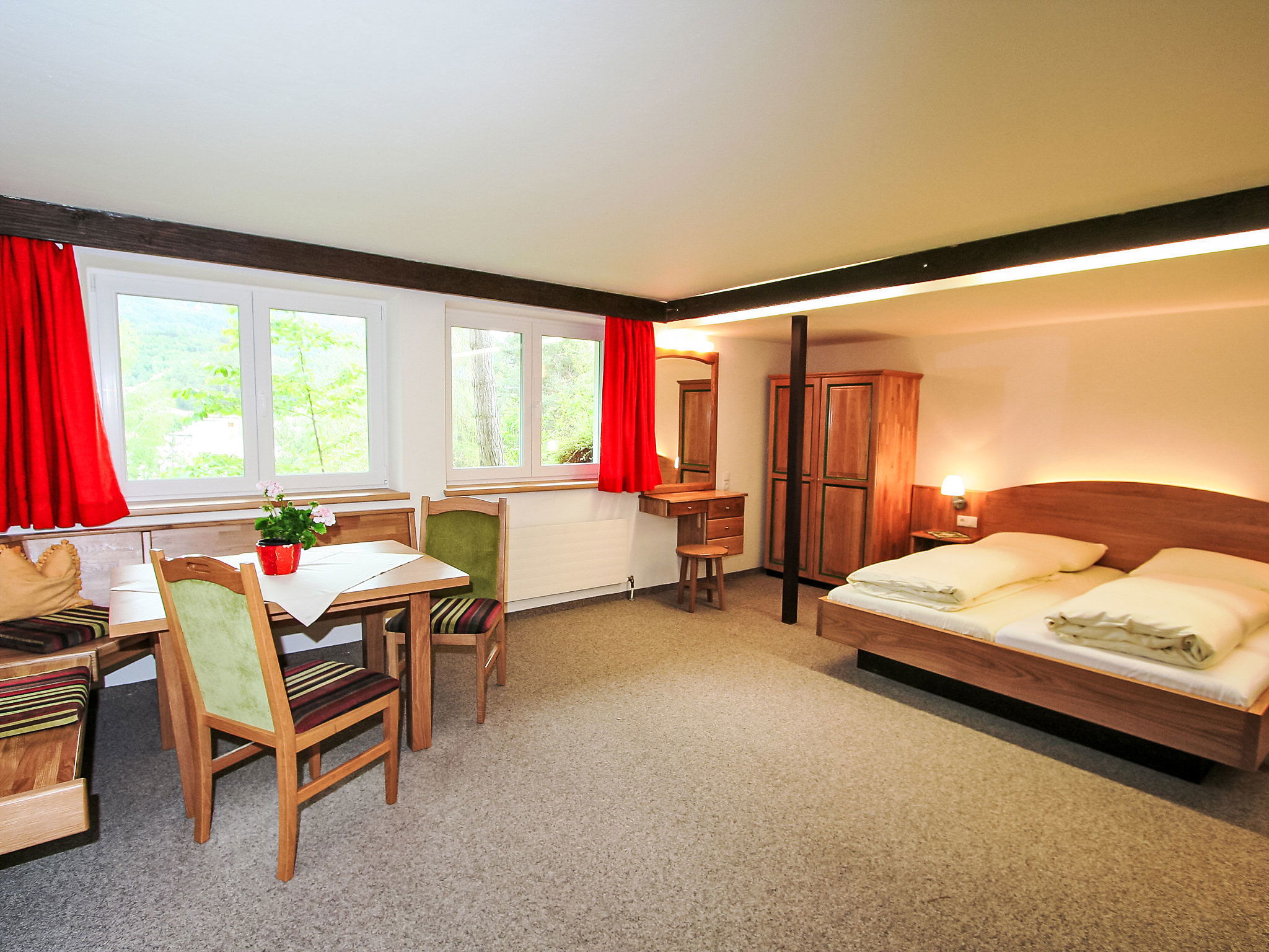 "Chalet St. Wendelin - Typ D", 4-room house 130 m2 on 3 levels. Living room with panoramic window with 1 double sofabed, dining nook and satellite TV (flat screen). Exit to the garden, to the terrace. Kitchen (oven, dishwasher, 4 ceramic glass hob hotplates, microwave, electric coffee machine). On the lower ground floor: 1 large room with 2 double beds. Exit to the garden. Shower/WC. Upper floor: 1 double bedroom. 1 room with 2 beds. Shower/bidet/WC, double hand-basin. Large terrace roofed, patio. Terrace furniture, barbecue (portable), deck chairs. Very beautiful panoramic view of the mountains and the countryside. Facilities: hair dryer. Internet (WiFi, free). Maximum 2 pets/ dogs allowed.