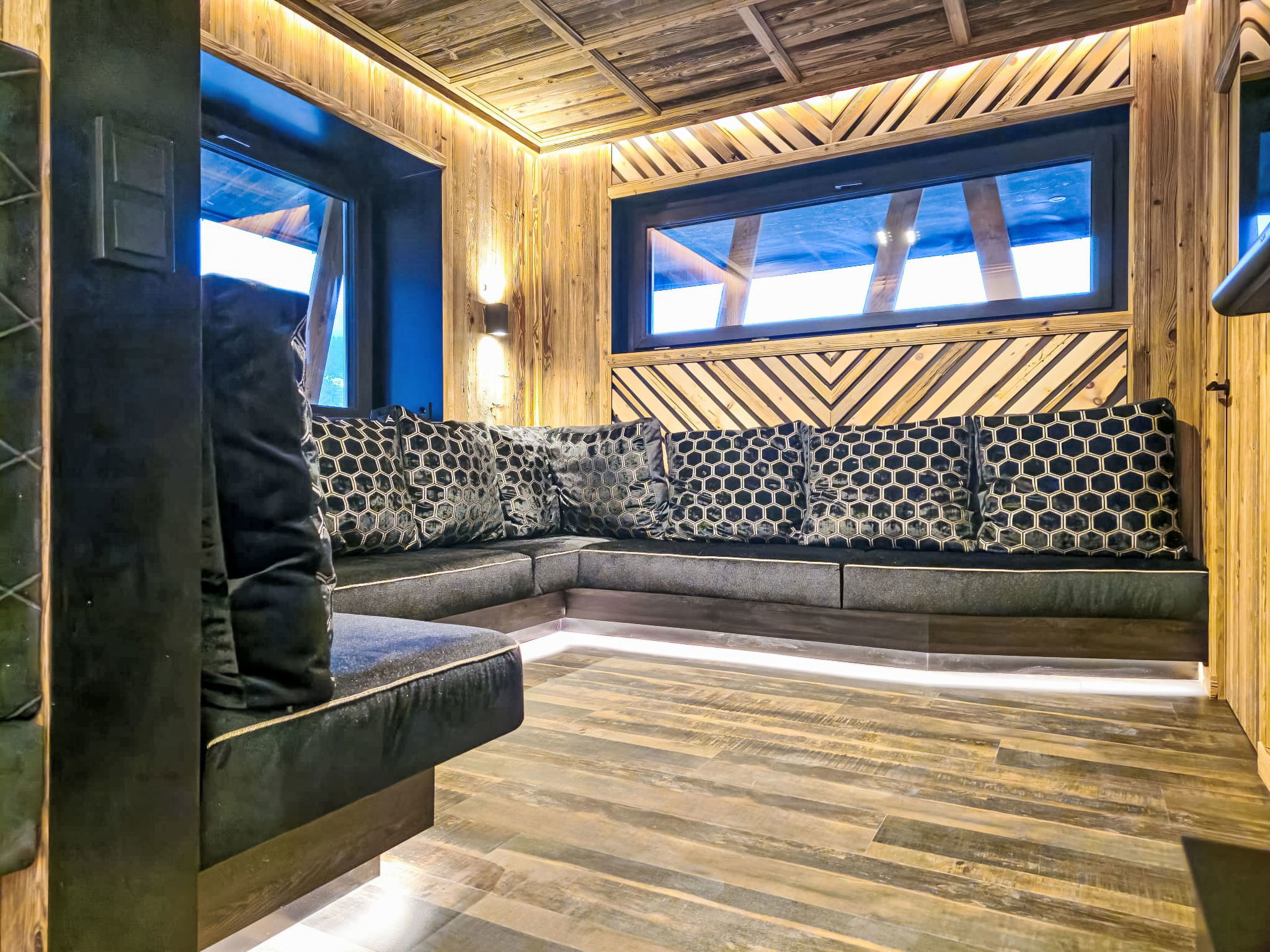 "Rocking home", 10-room chalet 350 m2 on 5 levels. Luxurious and tasteful furnishings: entrance hall. 2 double bedrooms. 2 rooms, each room with 1 double sofabed, 1 double bed and shower/WC. Shower/WC. On the lower ground floor: shower, sep. WC, Sauna. Upper floor: entrance hall. 2 rooms, each room with 1 double sofabed, 1 double bed and shower/WC. 2 double bedrooms. Shower/WC. 2nd upper floor: large living/dining room with open-hearth fireplace, dining table and satellite TV (flat screen). Living/sleeping room. Open kitchen (oven, dishwasher, 4 ceramic glass hob hotplates, microwave, electric coffee machine). Underfloor heating. Parquet floors. Balcony, large terrace 42 m2. Terrace furniture, barbecue, deck chairs. Very beautiful view of the countryside. Facilities: washing machine, dryer, hair dryer. Please note: non-smokers only. Maximum 1 pet/ dog allowed. The luxurious chalet has its own wellness area with hydro massage bath and relaxation room.