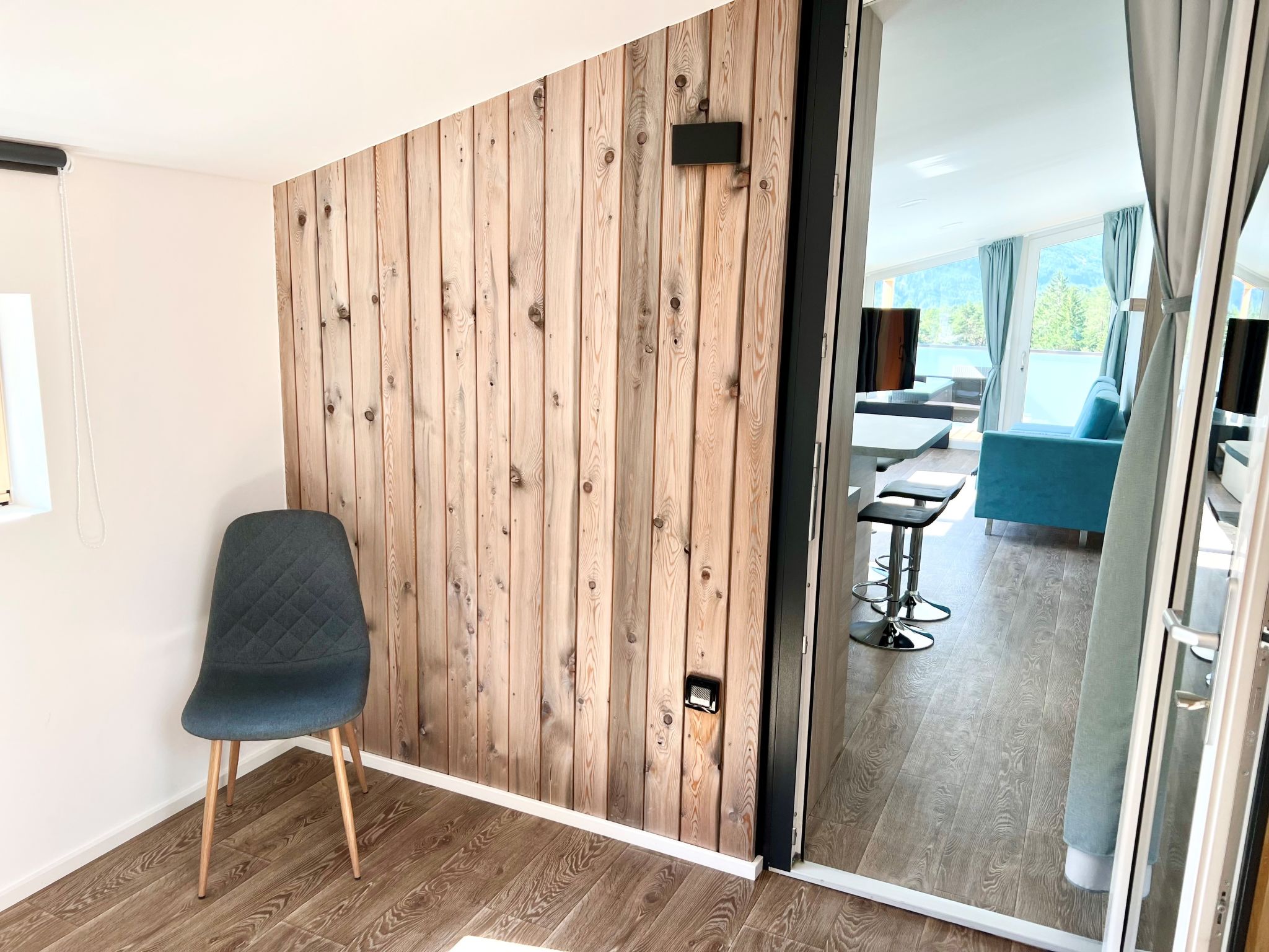 "Sky-Chalet", 3-room chalet 60 m2, south-west facing position. Modern and luxurious furnishings: 1 double bedroom. Exit to the terrace. 1 room with 2 beds and TV (flat screen). Kitchen-/living room (mini-oven, dishwasher, 4 induction hot plates, toaster, kettle, microwave, electric coffee machine) with 1 sofabed, dining table, bar and satellite TV (flat screen). Exit to the terrace. Shower/WC. Heating, air-conditioning. Parquet floors. Large terrace 15 m2, south facing position and west facing position. Terrace furniture. Marvellous panoramic view of the mountains. Please note: non-smoking house. Maximum 1 pet/ dog allowed.