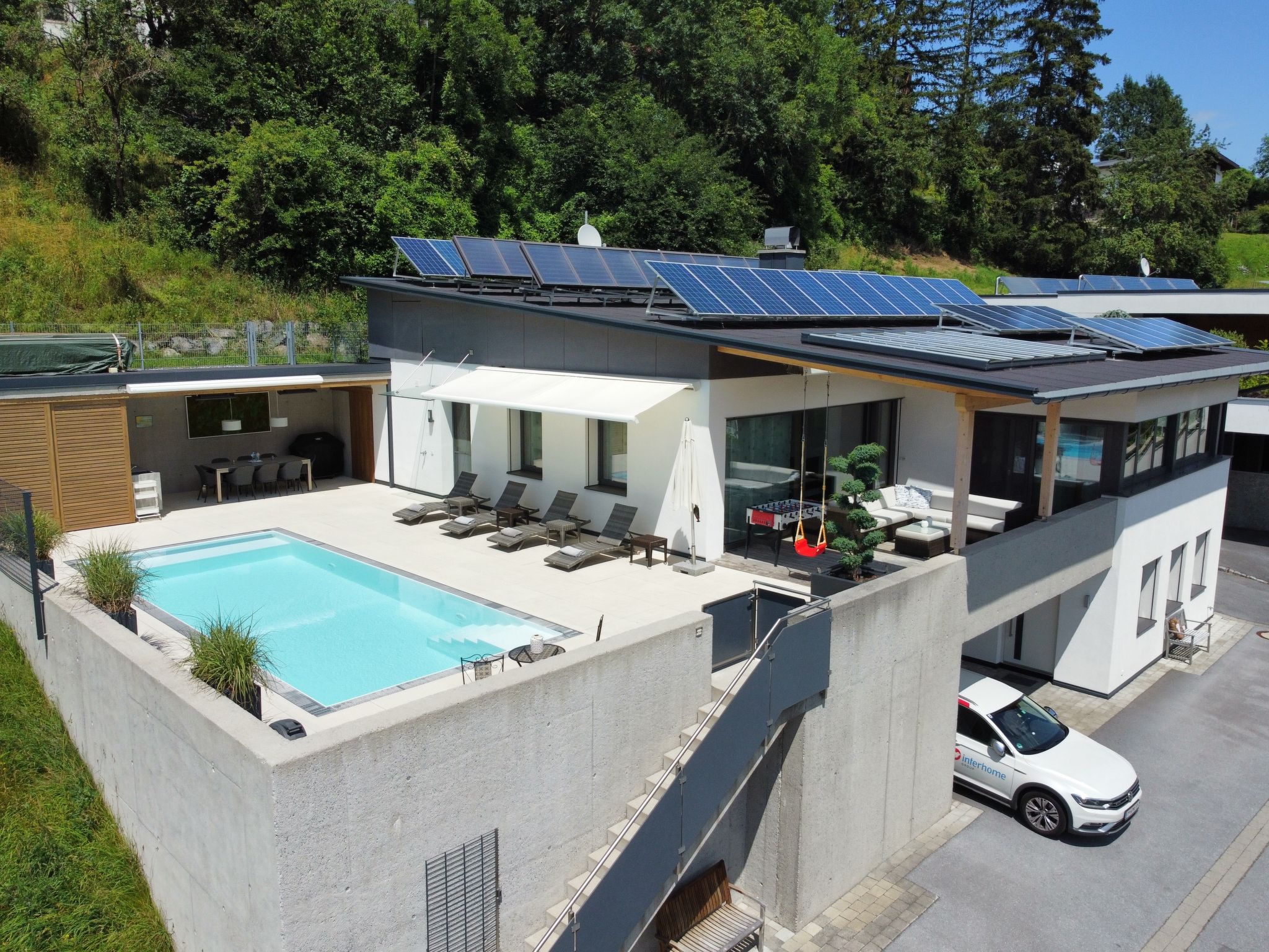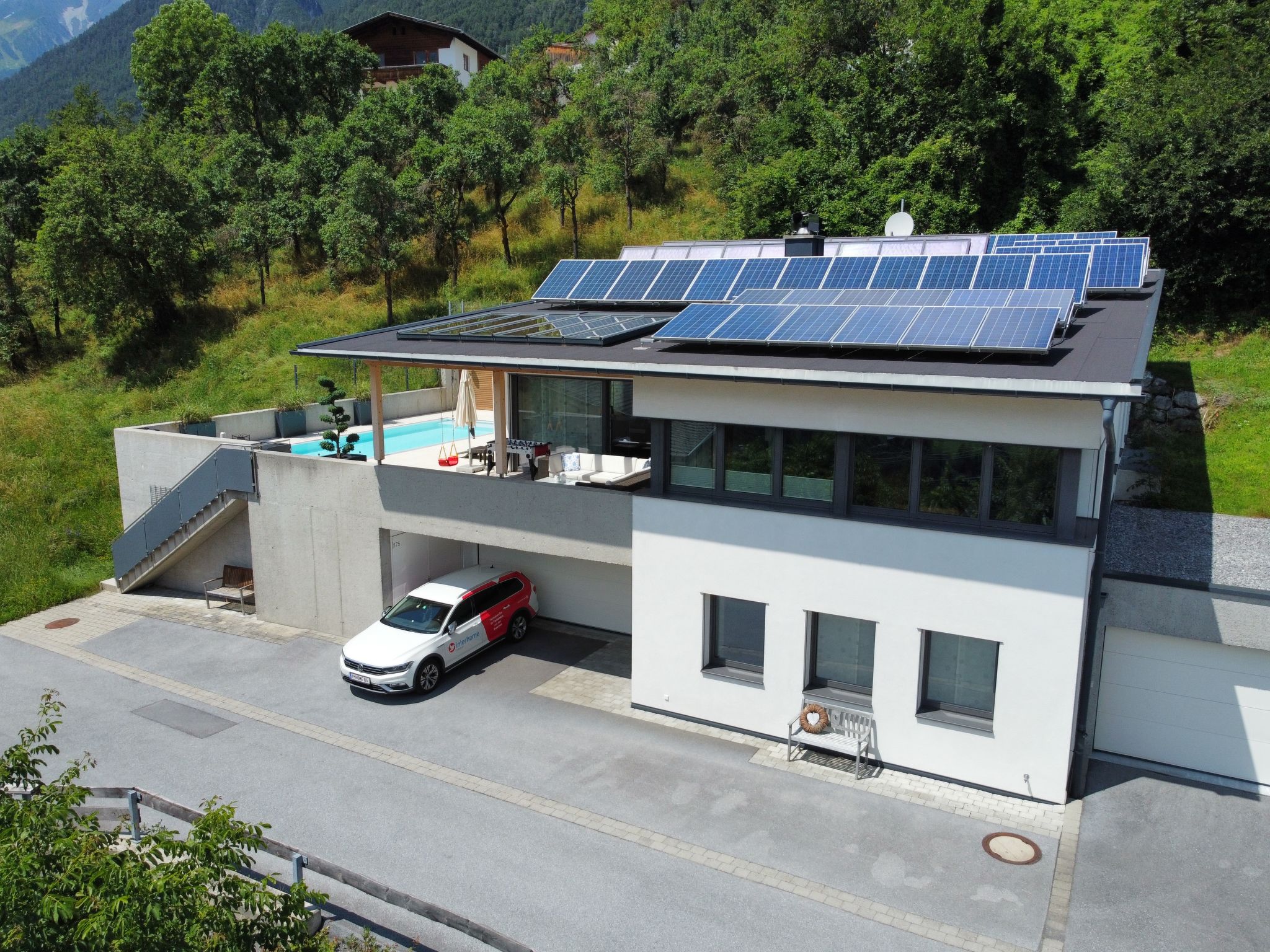 Stanz bei Landeck 3 km from Landeck: Modern house "Villa Renate", 2 storeys, built in 2013, surrounded by meadows. Above Landeck, in the resort Stanz, in a quiet position, 600 m from the edge of the forest, 4.3 km from the skiing area. For shared use: swimming pool (seasonal availability: 03.May. - 28.Sep.). Patio (40 m2), garden furniture, barbecue, parking (for 2 cars). Shop 1.8 km, shopping centre 1.5 km, bakery 2 km, pedestrian zone 2.8 km, bus stop "Stanz b.L. Unterkreuzied" 350 m, railway station "Ötztal Bahnhof" 33.2 km. Well-known ski regions can easily be reached: Venet Bergbahnen 3.6 km, See/Kappl 18 km, Serfaus Fiss Ladis 30 km.