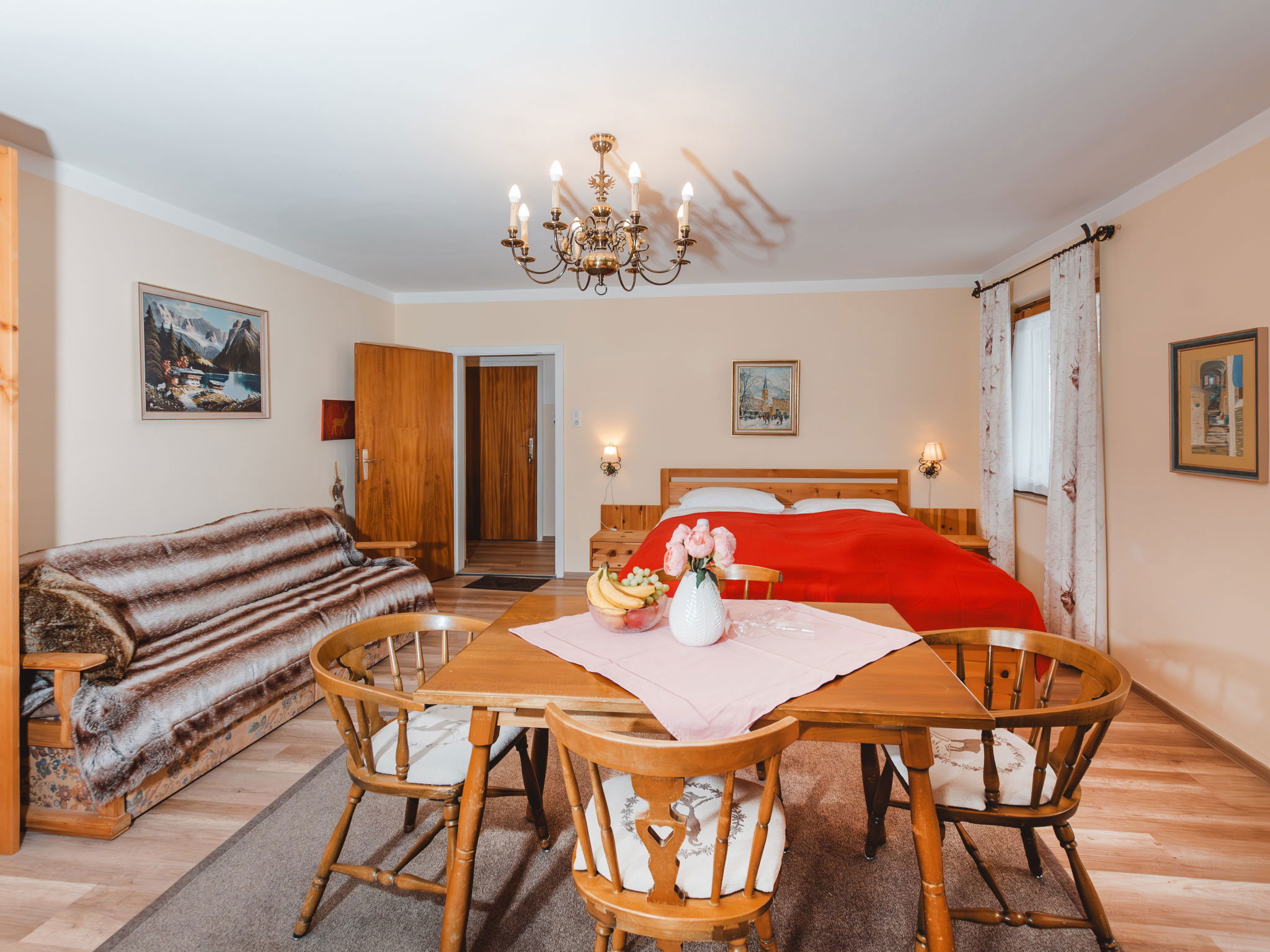 "Margret", 2-room apartment 40 m2. Spacious and bright, tasteful and cosy furnishings: entrance hall. Living/sleeping room with 1 double sofabed, 1 double bed, dining table and cable TV (flat screen). Exit to the balcony. Kitchen (4 hot plates, oven, toaster, kettle, electric coffee machine) with small dining table. Exit to the terrace. Bath/WC. Parquet floors. Comfortable furnishings in the country house style. Balcony, large terrace. Terrace furniture. Beautiful view of the forest. Facilities: safe, hair dryer. Internet (WiFi). Parking, garage (extra) at the house. Please note: suitable for families. Non-smokers only. 2 pets/ dogs allowed. 50403-000158-2020