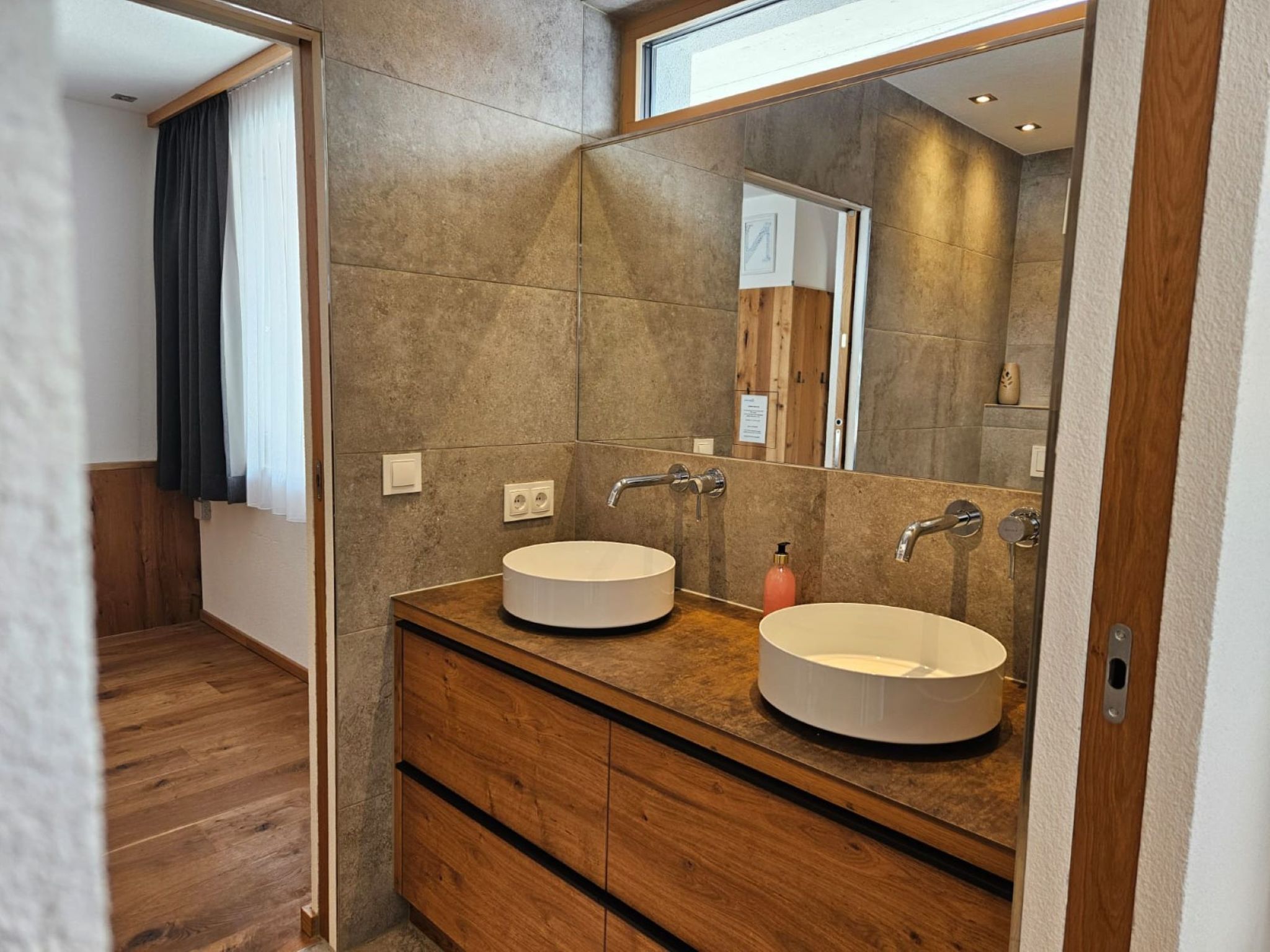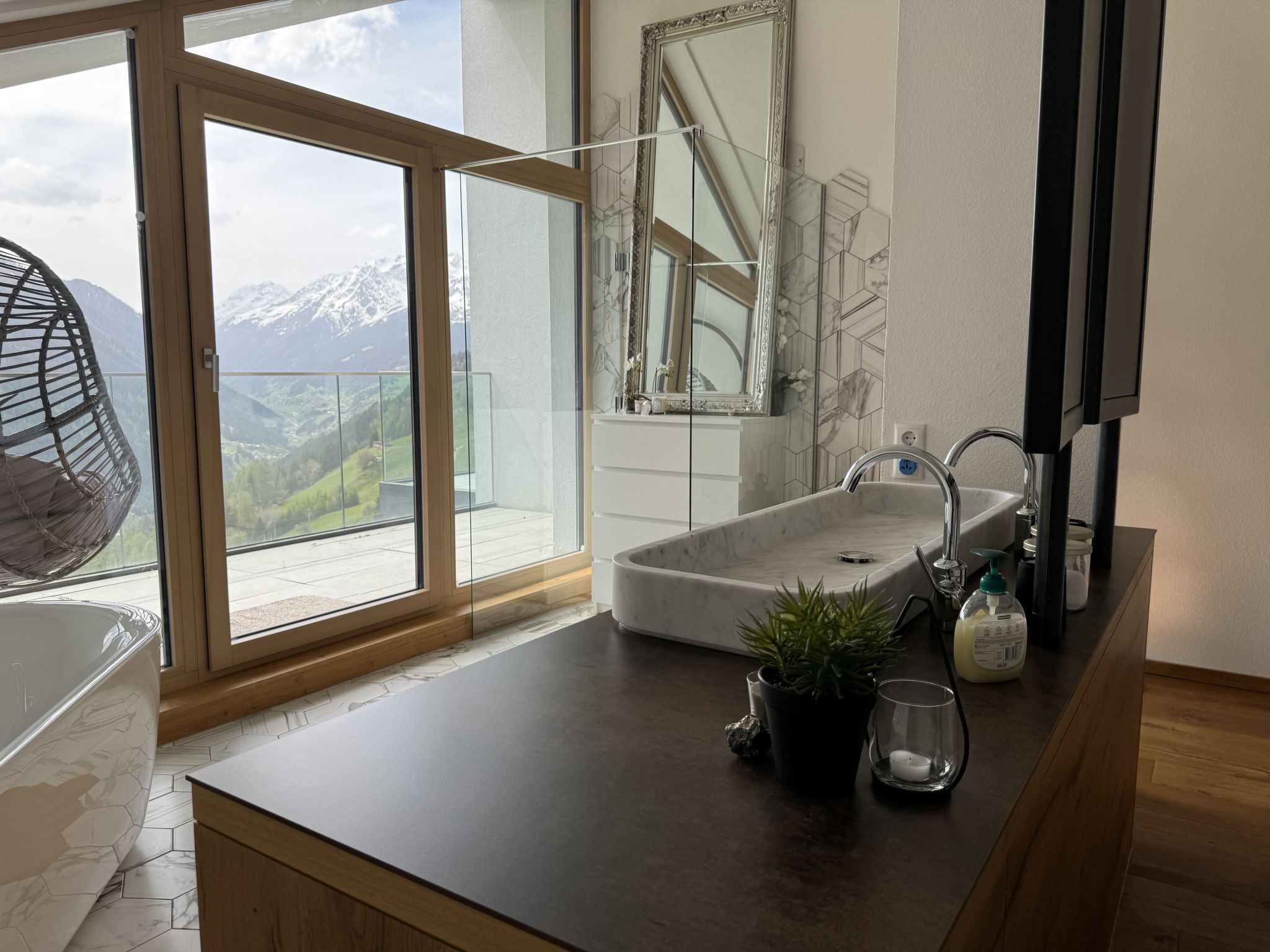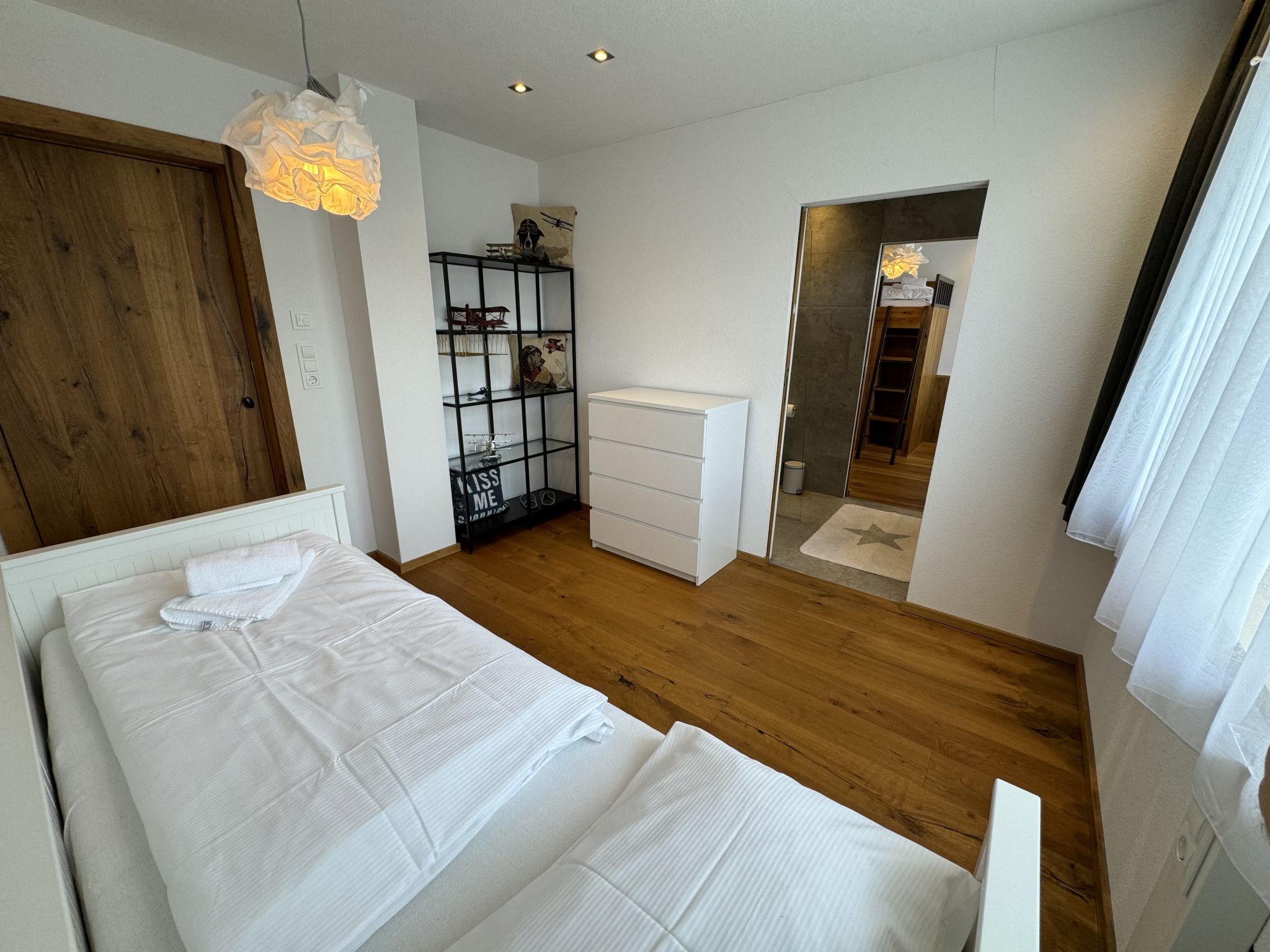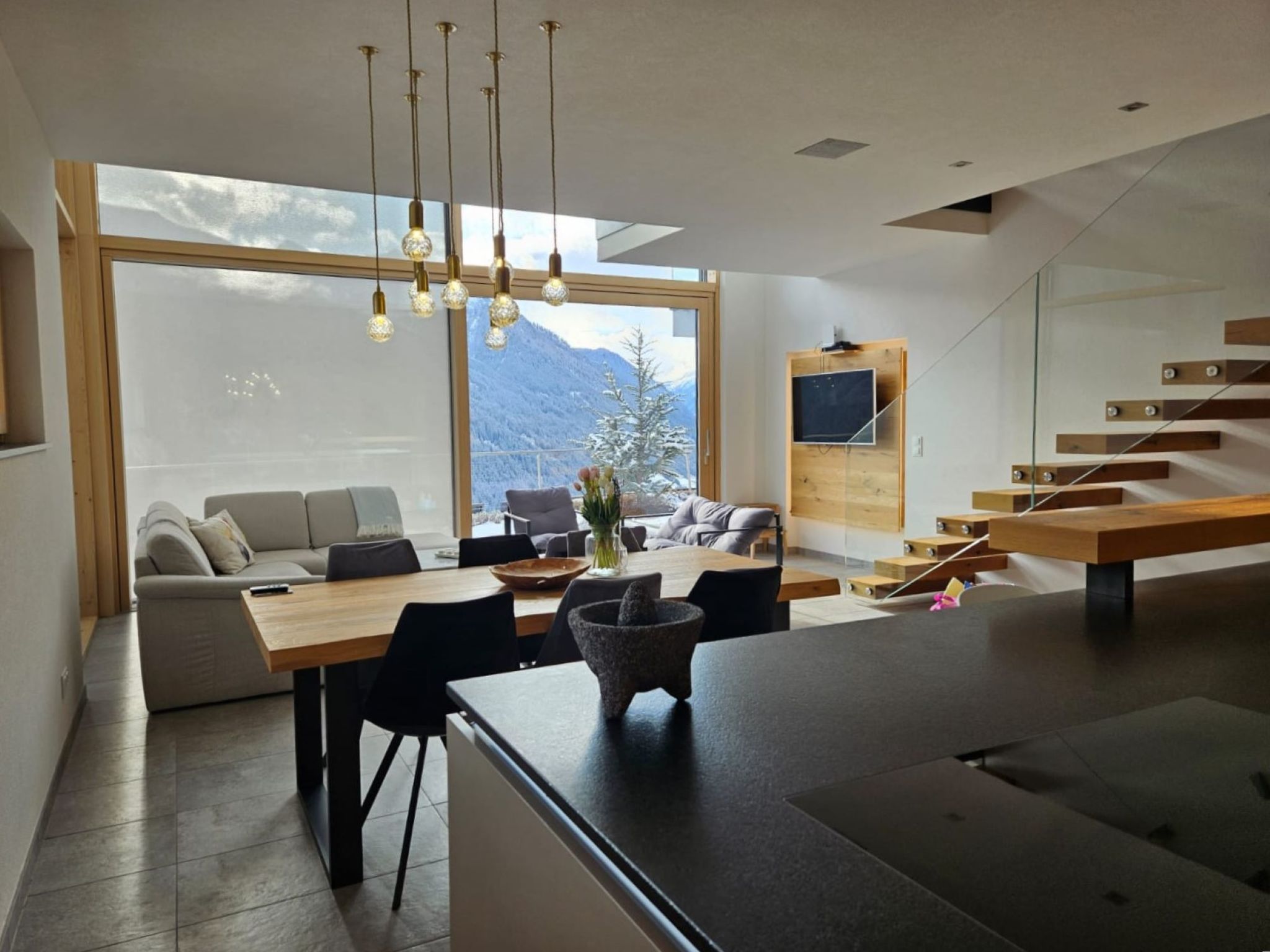 "Skyline Retreat", 4-room semi-detached house 130 m2 on 3 levels. Spacious and bright, modern and luxurious furnishings: 1 room with 1 x 1 bunk beds, bath/WC, shower and double hand-basin. 1 room with 1 double bed. On the lower ground floor: living room with TV. Large, open kitchen (oven, dishwasher, 4 ceramic glass hob hotplates, kettle, freezer, electric coffee machine) with bar, dining table, separate WC. Upper floor: Studio with 1 double bed, separate WC, double hand-basin and with corner bath. Exit to the balcony. Very beautiful panoramic view of the mountains and the valley. Facilities: Internet (WiFi, free). Suitable for families. Underfloor heating throughout the house. Party guests are not welcome.