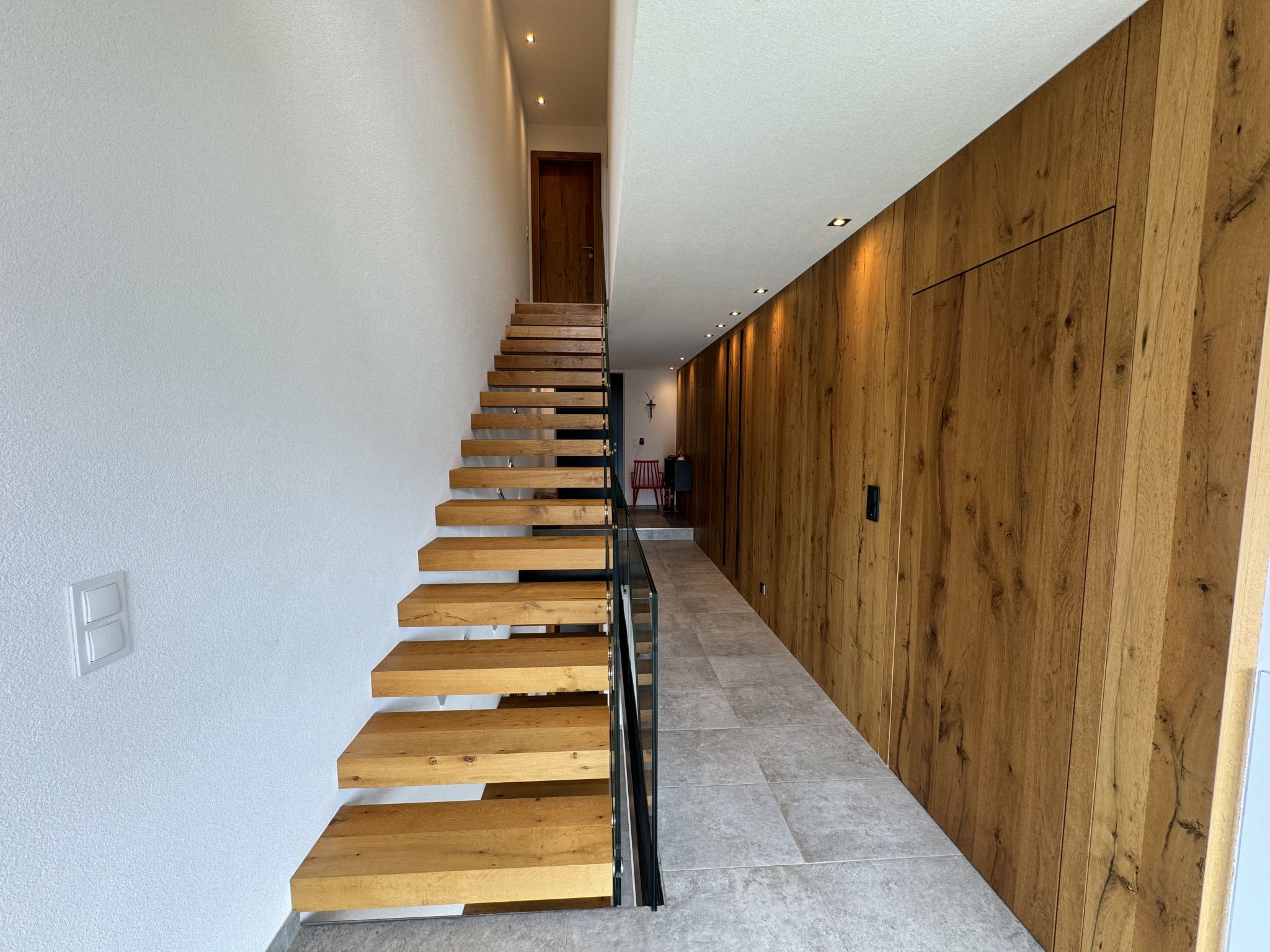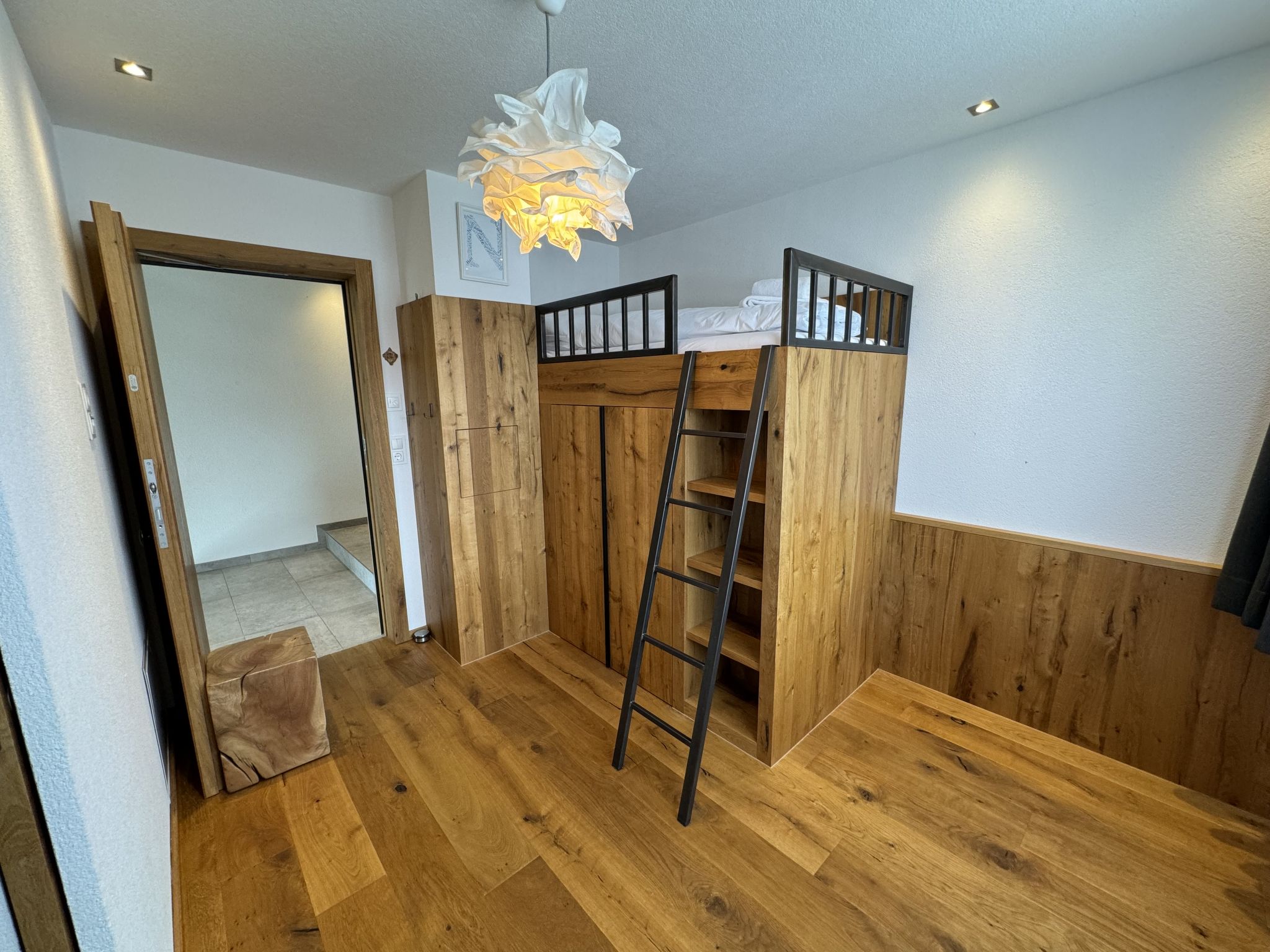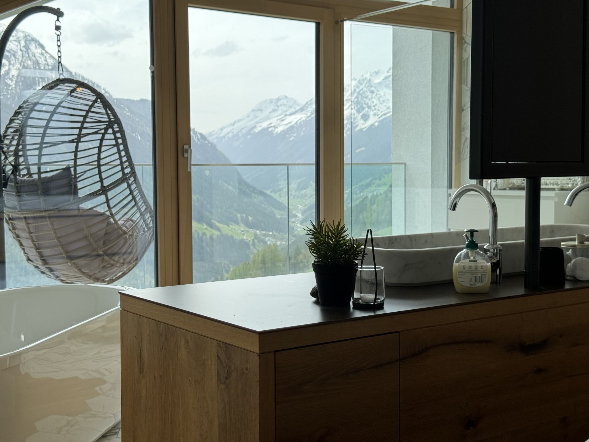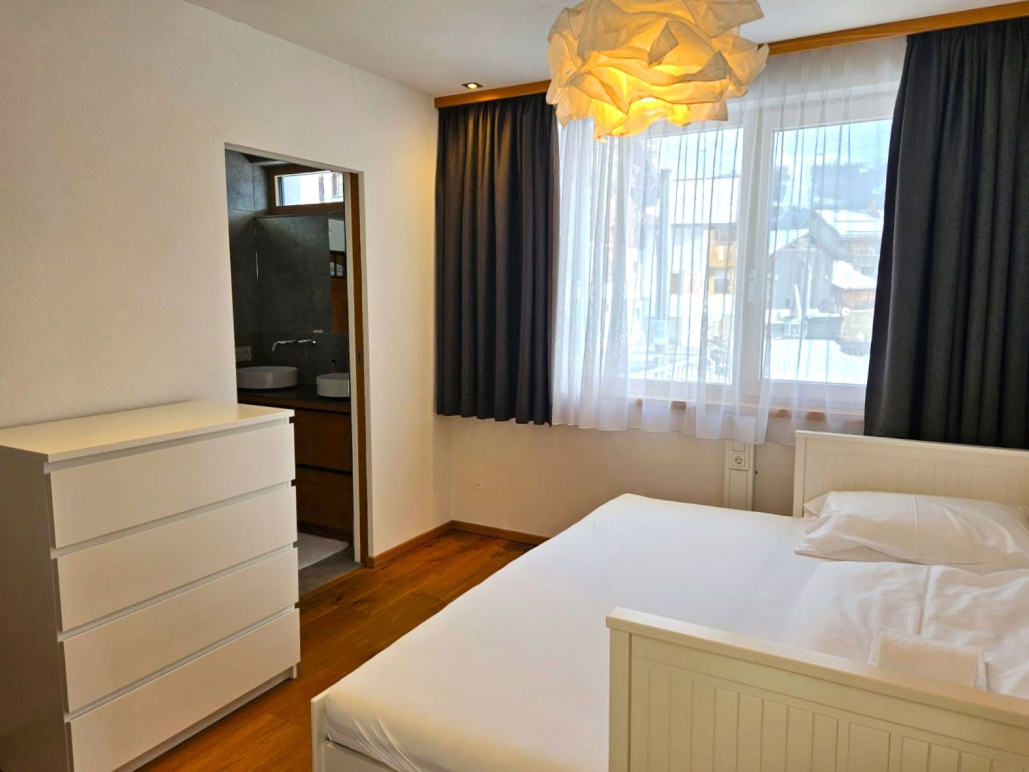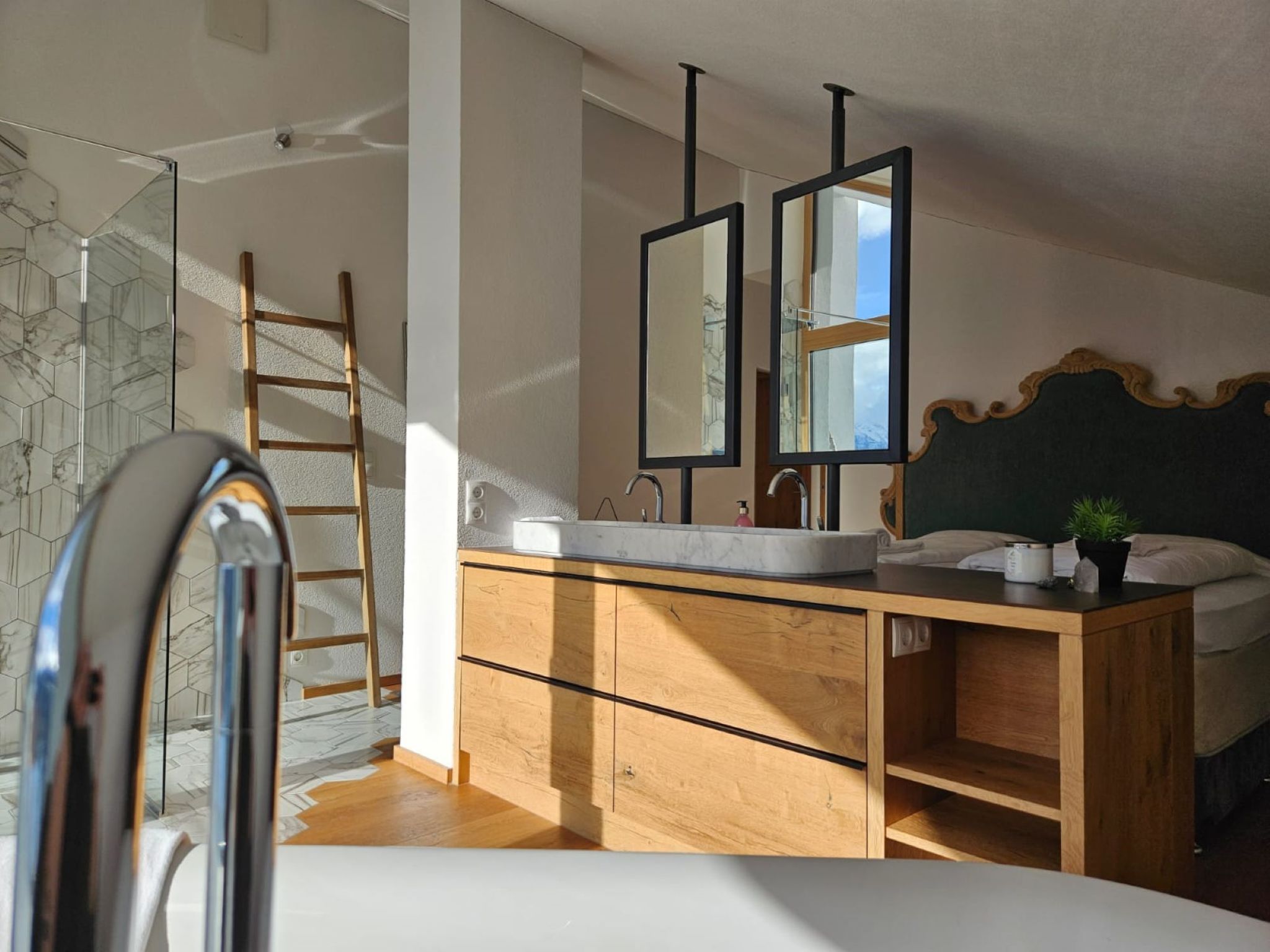 "Skyline Retreat", 4-room semi-detached house 130 m2 on 3 levels. Spacious and bright, modern and luxurious furnishings: 1 room with 1 x 1 bunk beds, bath/WC, shower and double hand-basin. 1 room with 1 double bed. On the lower ground floor: living room with TV. Large, open kitchen (oven, dishwasher, 4 ceramic glass hob hotplates, kettle, freezer, electric coffee machine) with bar, dining table, separate WC. Upper floor: Studio with 1 double bed, separate WC, double hand-basin and with corner bath. Exit to the balcony. Very beautiful panoramic view of the mountains and the valley. Facilities: Internet (WiFi, free). Suitable for families. Underfloor heating throughout the house. Party guests are not welcome.