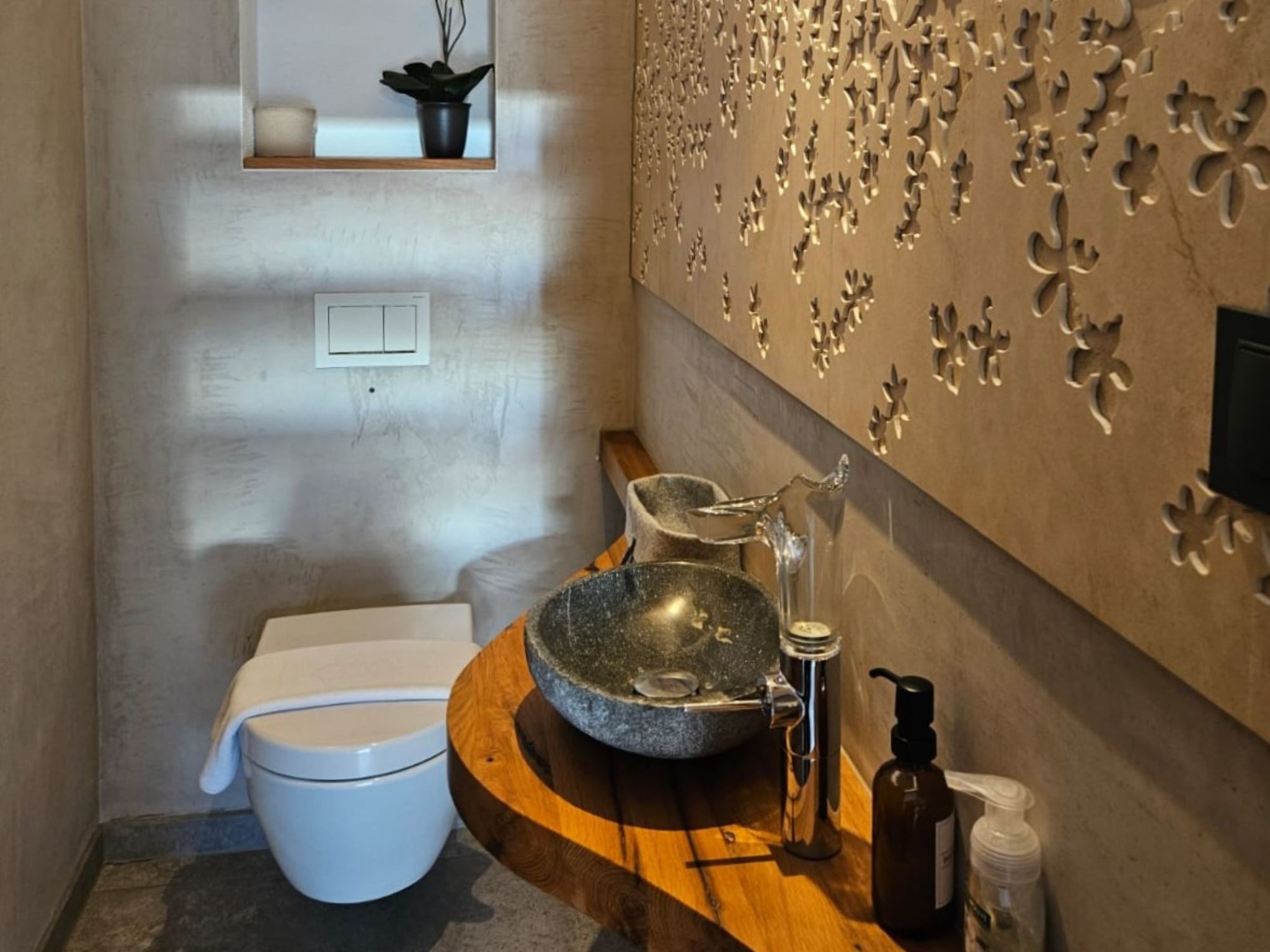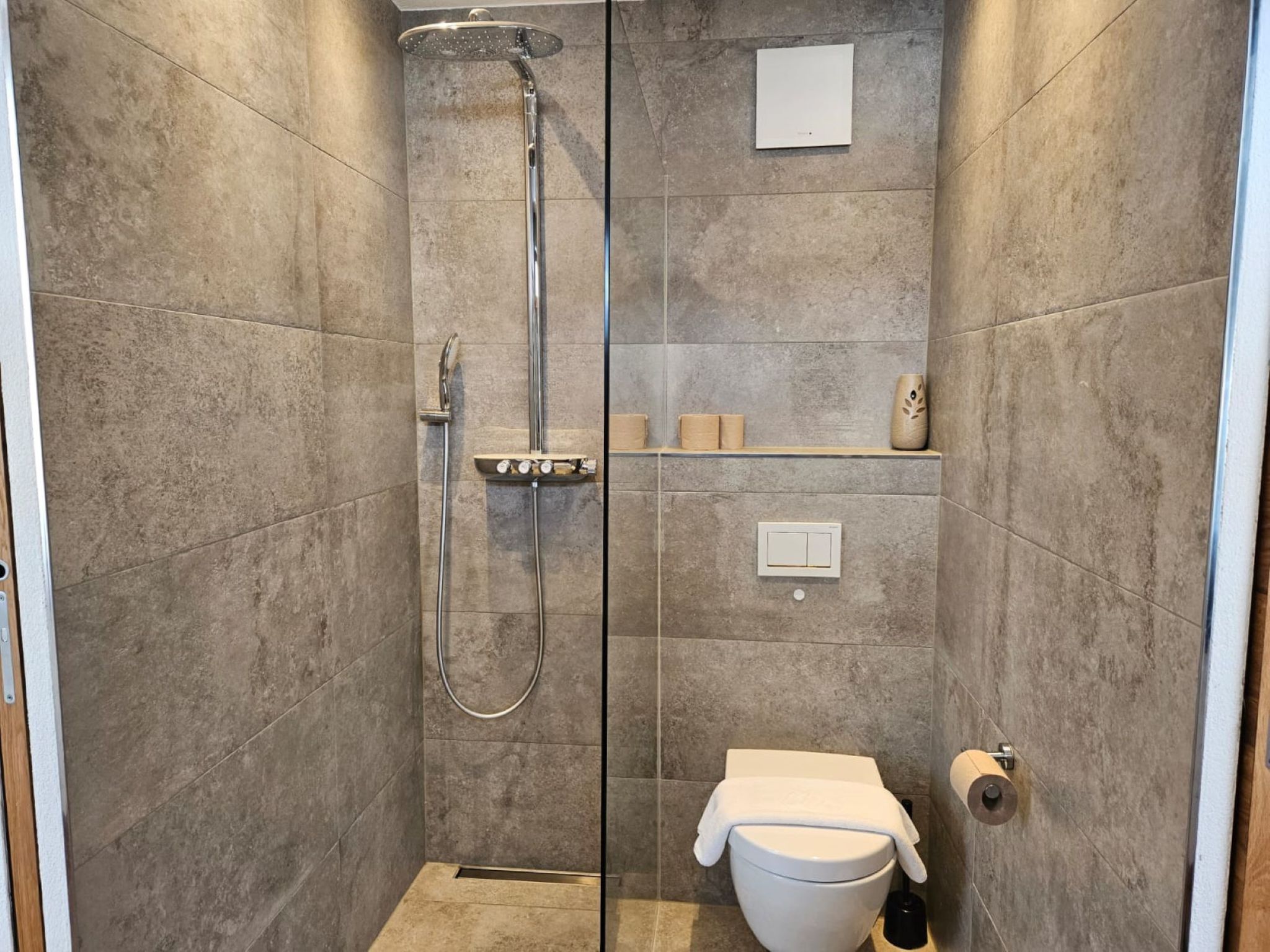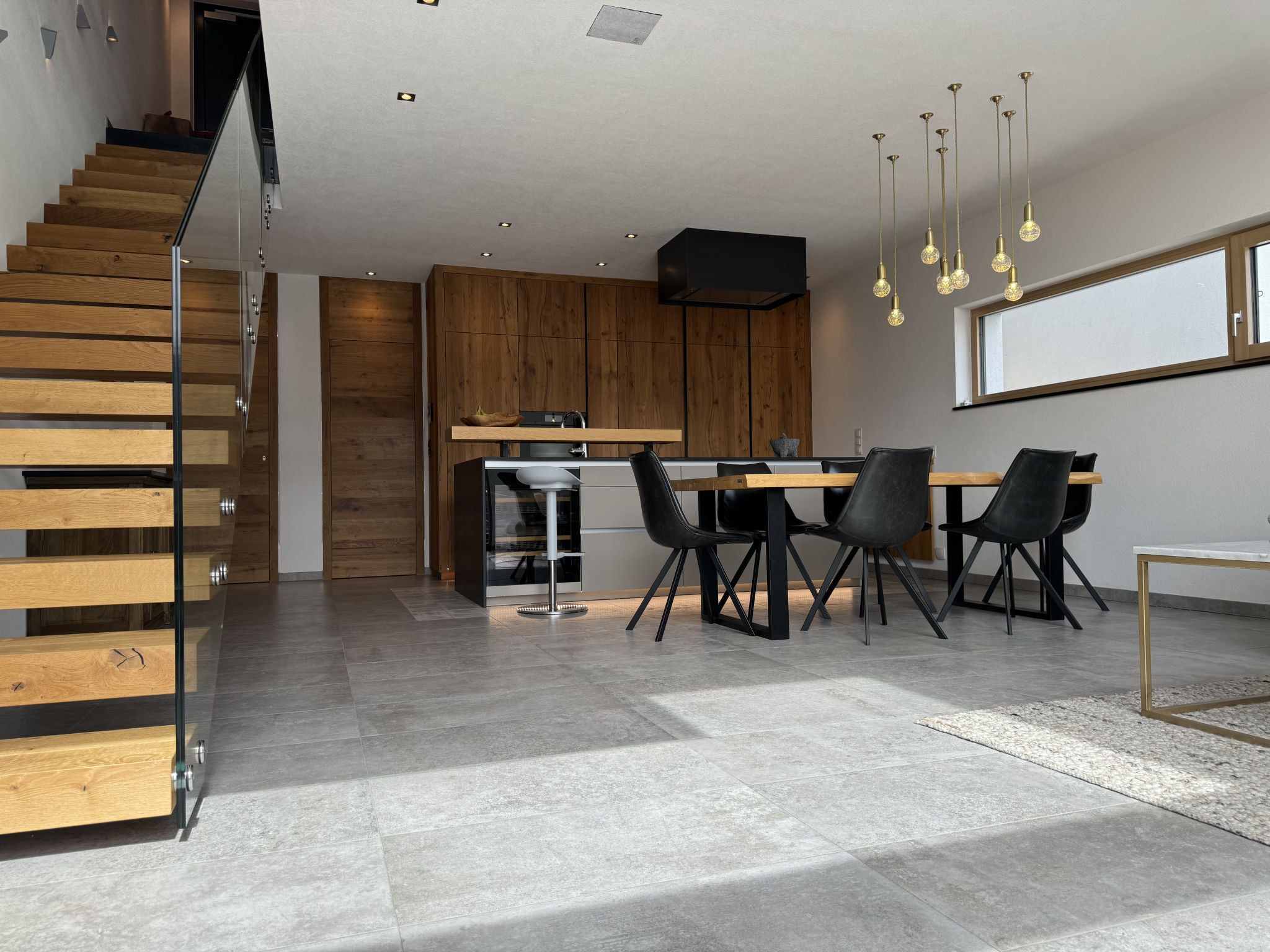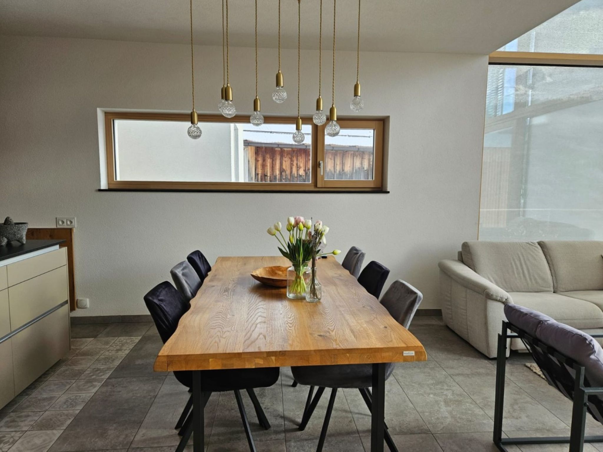 "Skyline Retreat", 4-room semi-detached house 130 m2 on 3 levels. Spacious and bright, modern and luxurious furnishings: 1 room with 1 x 1 bunk beds, bath/WC, shower and double hand-basin. 1 room with 1 double bed. On the lower ground floor: living room with TV. Large, open kitchen (oven, dishwasher, 4 ceramic glass hob hotplates, kettle, freezer, electric coffee machine) with bar, dining table, separate WC. Upper floor: Studio with 1 double bed, separate WC, double hand-basin and with corner bath. Exit to the balcony. Very beautiful panoramic view of the mountains and the valley. Facilities: Internet (WiFi, free). Suitable for families. Underfloor heating throughout the house. Party guests are not welcome.