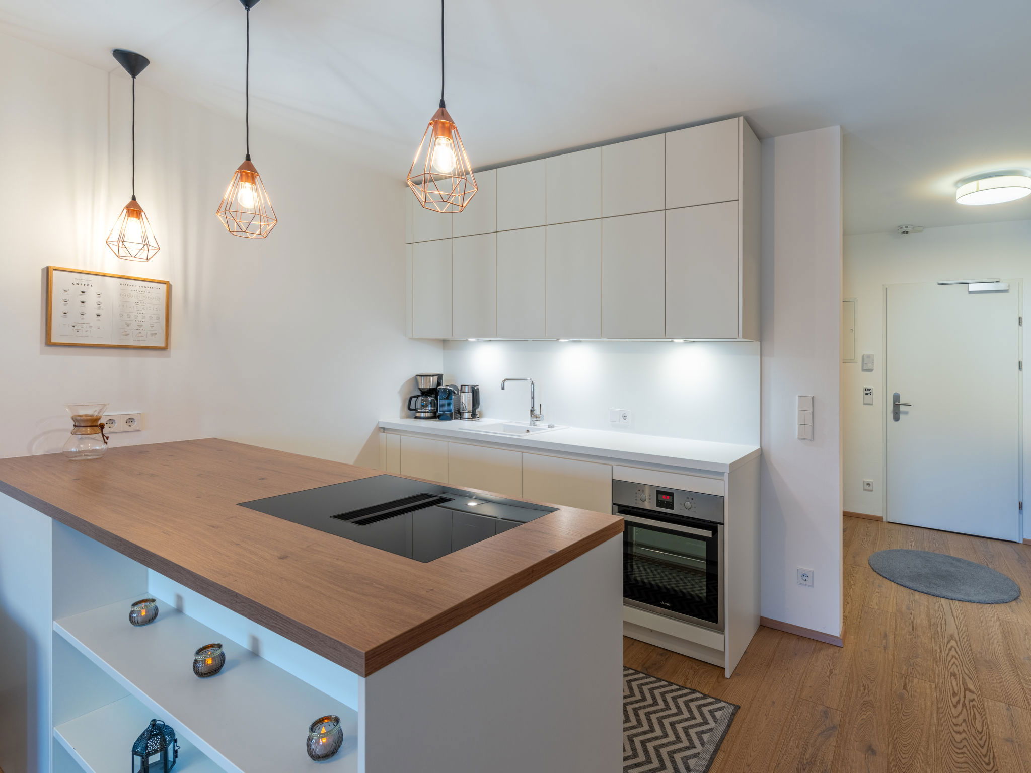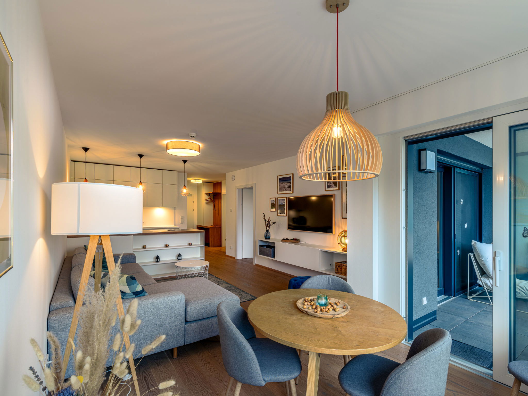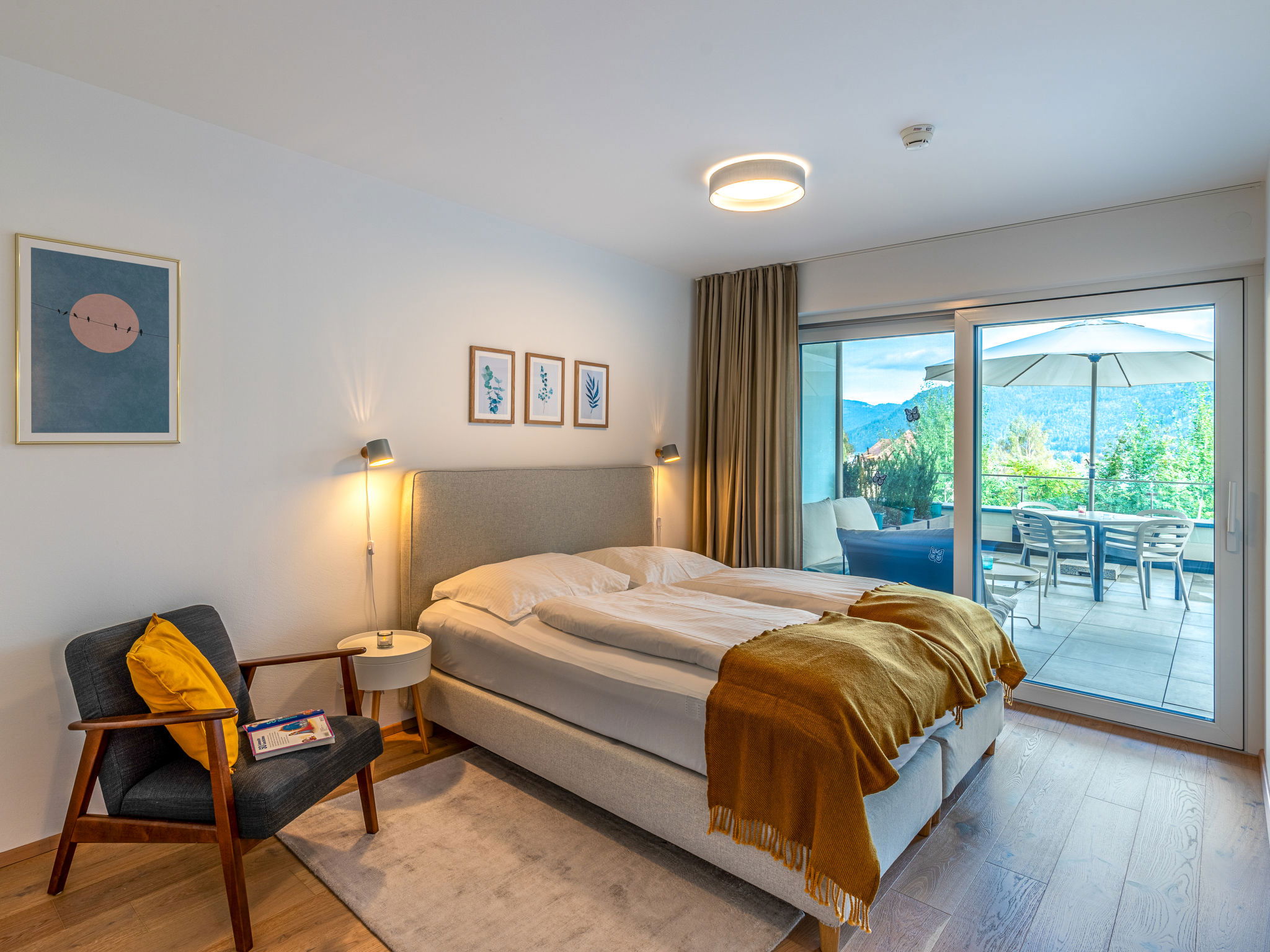 "Sonnentanz alpe maritima Ski & See-Top 2", 2-room apartment 63 m2, on the upper ground floor. Bright, very modern and tasteful furnishings: entrance hall. Living/dining room with dining table and satellite TV (flat screen). Exit to the balcony, to the terrace. 1 double bedroom. Exit to the loggia. Open kitchen (oven, dishwasher, 4 ceramic glass hob hotplates, toaster, kettle, microwave, electric coffee machine, Capsules for coffee machine (Nespresso) extra). Shower, sep. WC. Parquet floors. Large balcony 8 m2, large terrace 26 m2. Terrace furniture, balcony furniture. Very beautiful panoramic view of the lake and the mountains. Facilities: washing machine, mosquito net, hair dryer. Internet (WiFi, free). Parking (roofed, 1 car) at the house. E-charging station. Please note: non-smokers only. Smoke alarm.
