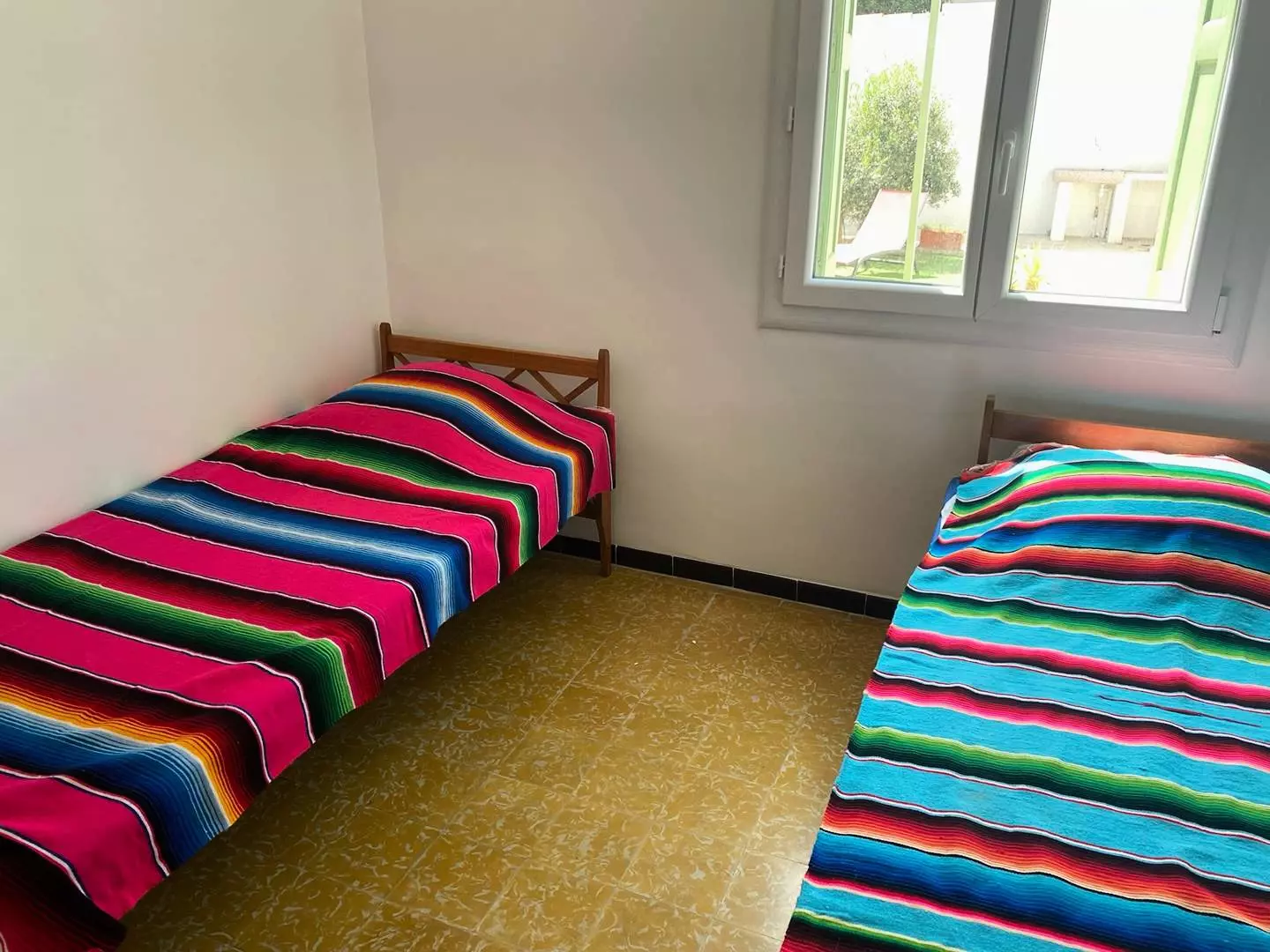 The house has two bedrooms: one with a double bed and the other with two single beds, perfect for accommodating the whole family or friends.