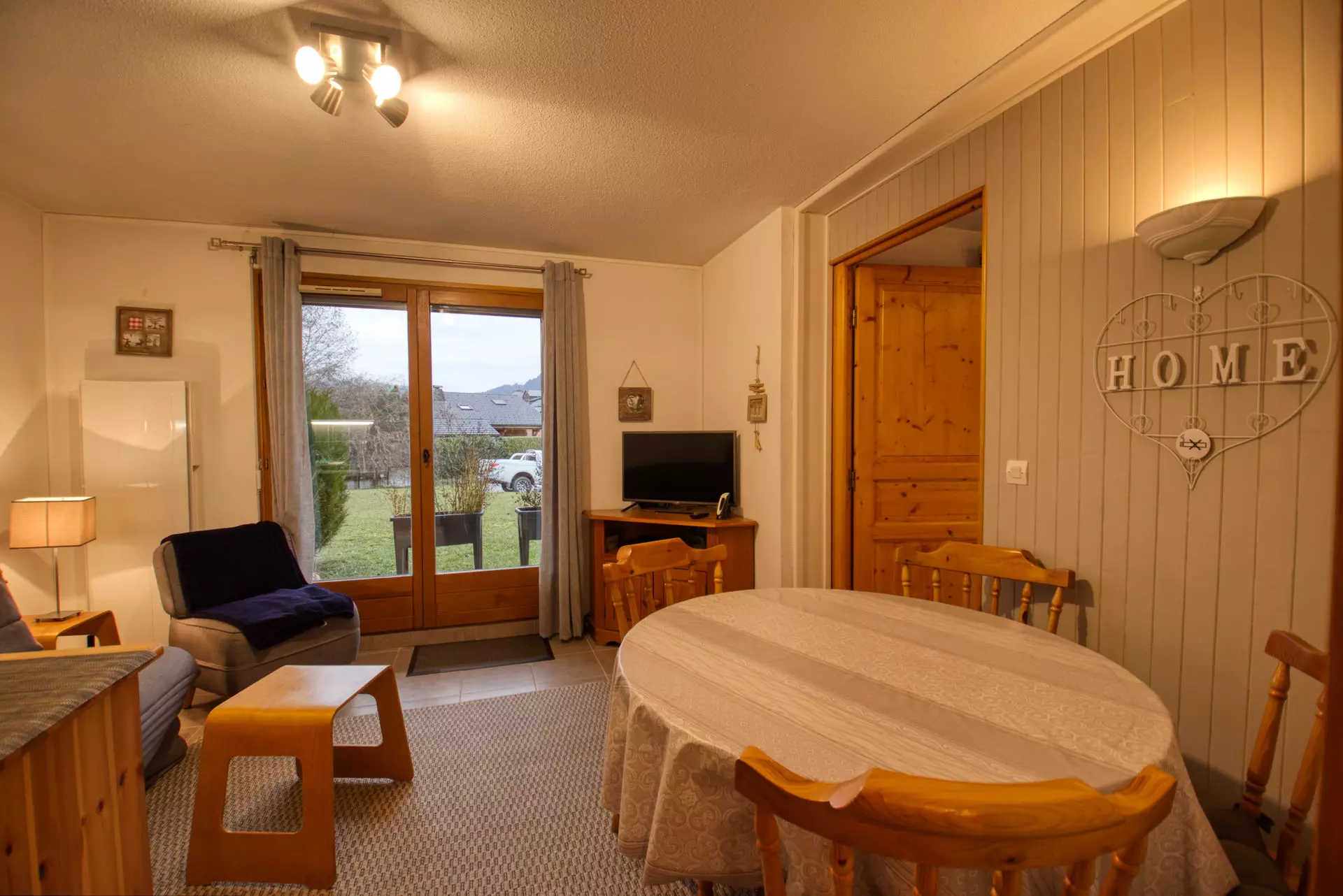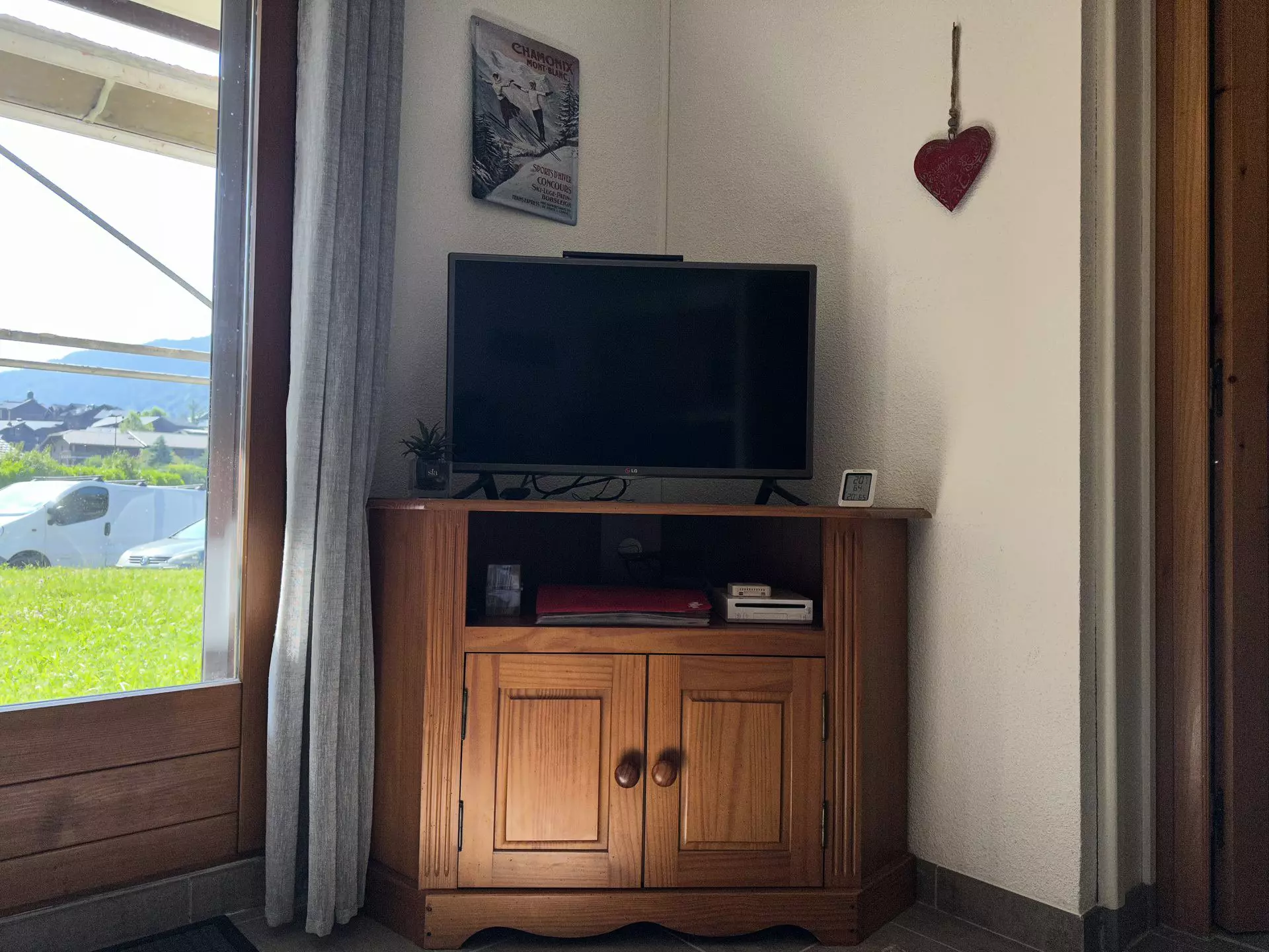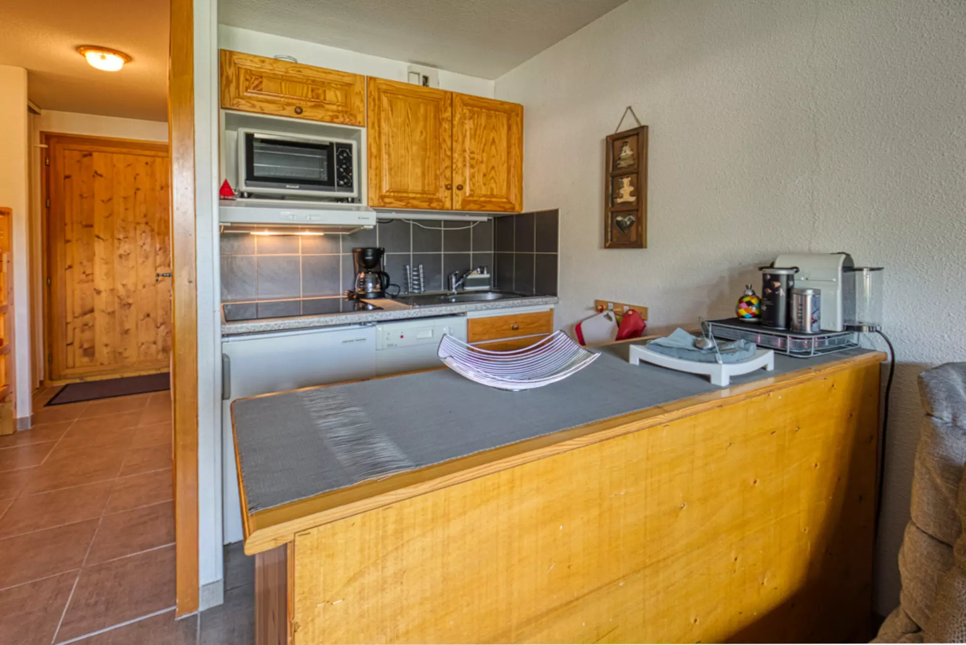 The apartment's interior includes an entrance hall with a mountain corner, a bathroom with a bathtub and a non-separate toilet. You will also find a bedroom opening onto a small east-facing terrace. The living area offers a comfortable space with a television, a DVD player and a WII game console (please note that no games are provided) as well as a fully equipped kitchen area.