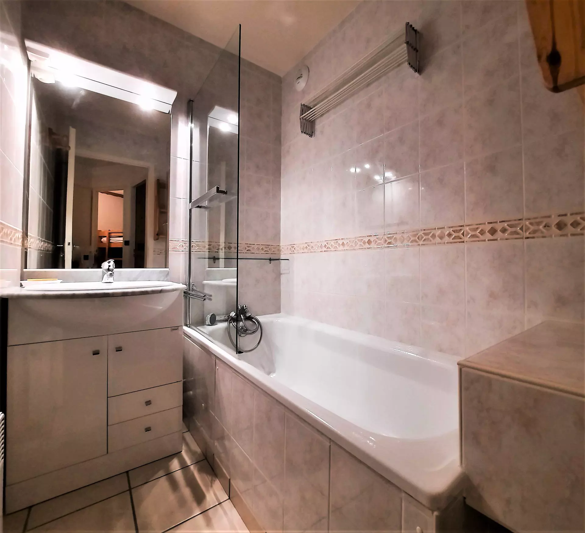 Bathroom: sink, bathtub, towel dryer