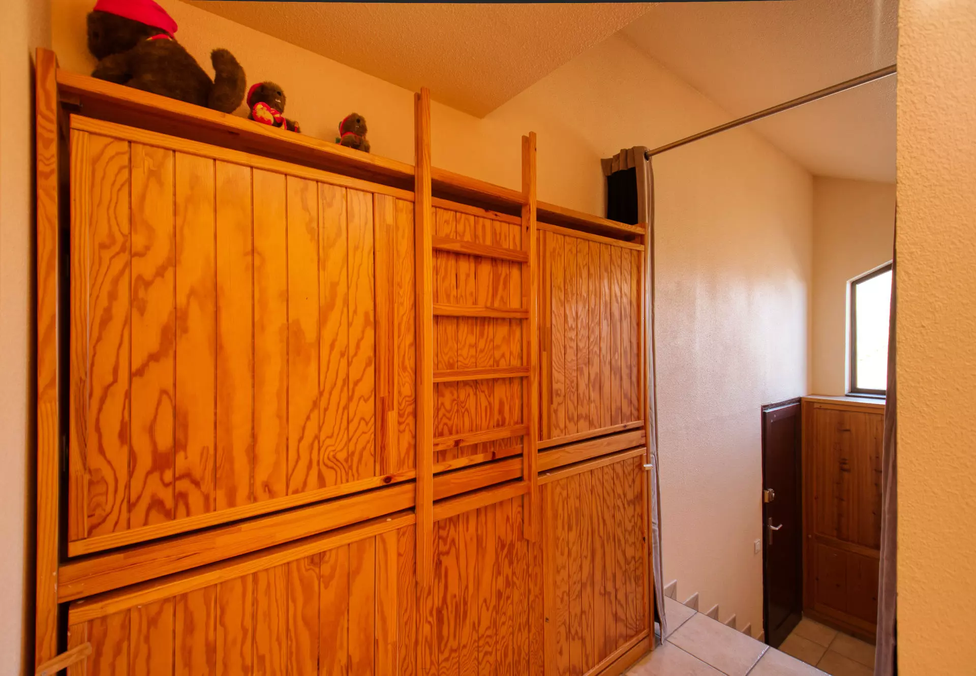 An entrance hall with cupboard and a staircase to access the apartment, a cabin, a shower room with toilet and washing machine, a living room with non-convertible sofa and TV, equipped kitchen area, upstairs you will find 2 bedrooms, one of which is under the eaves