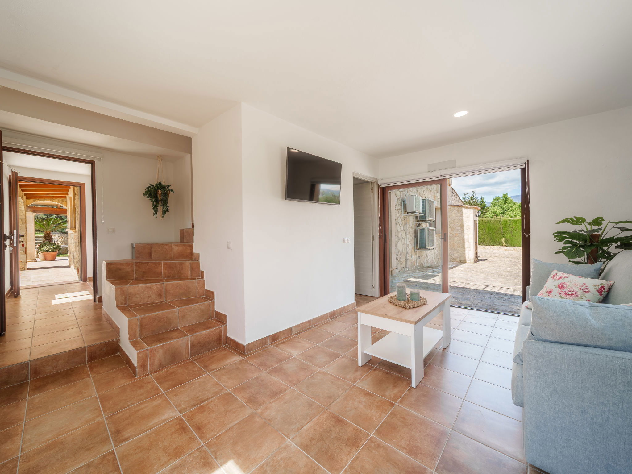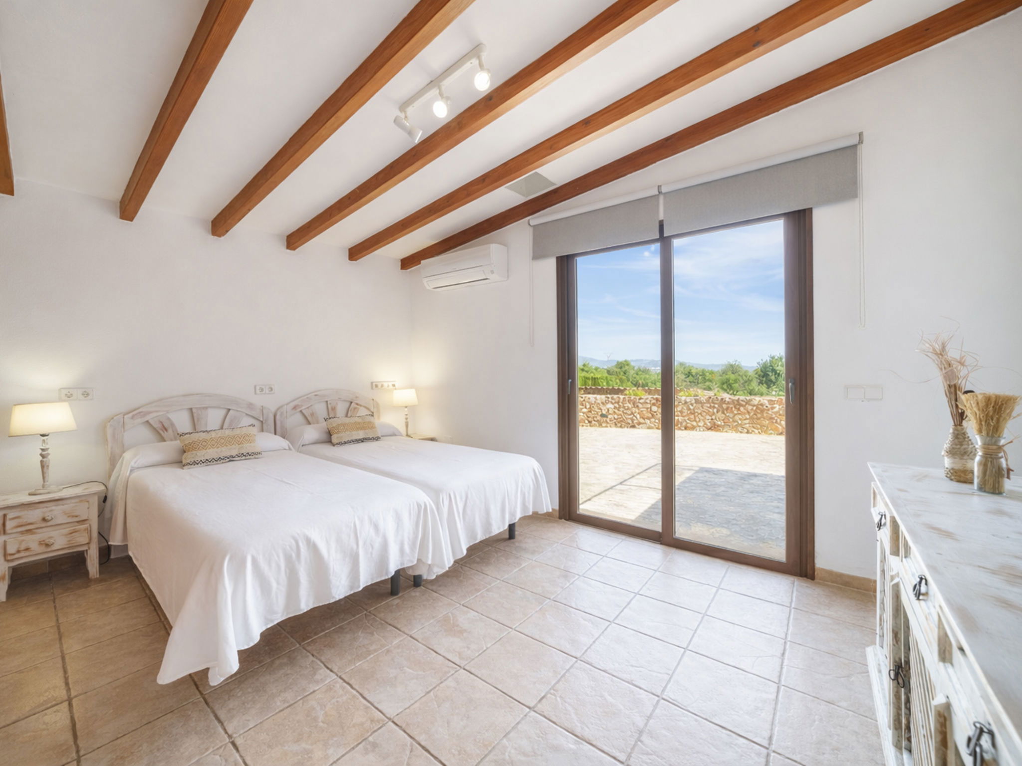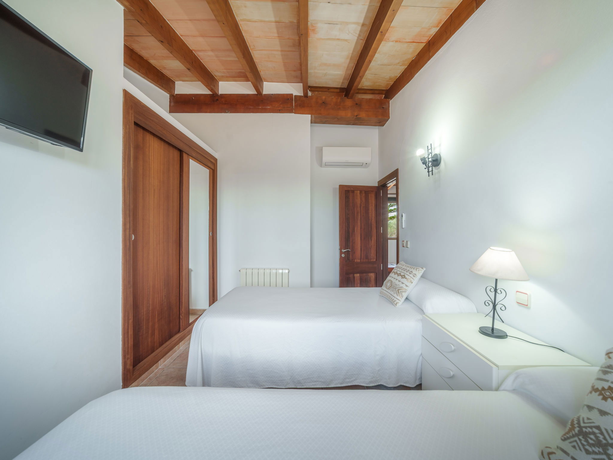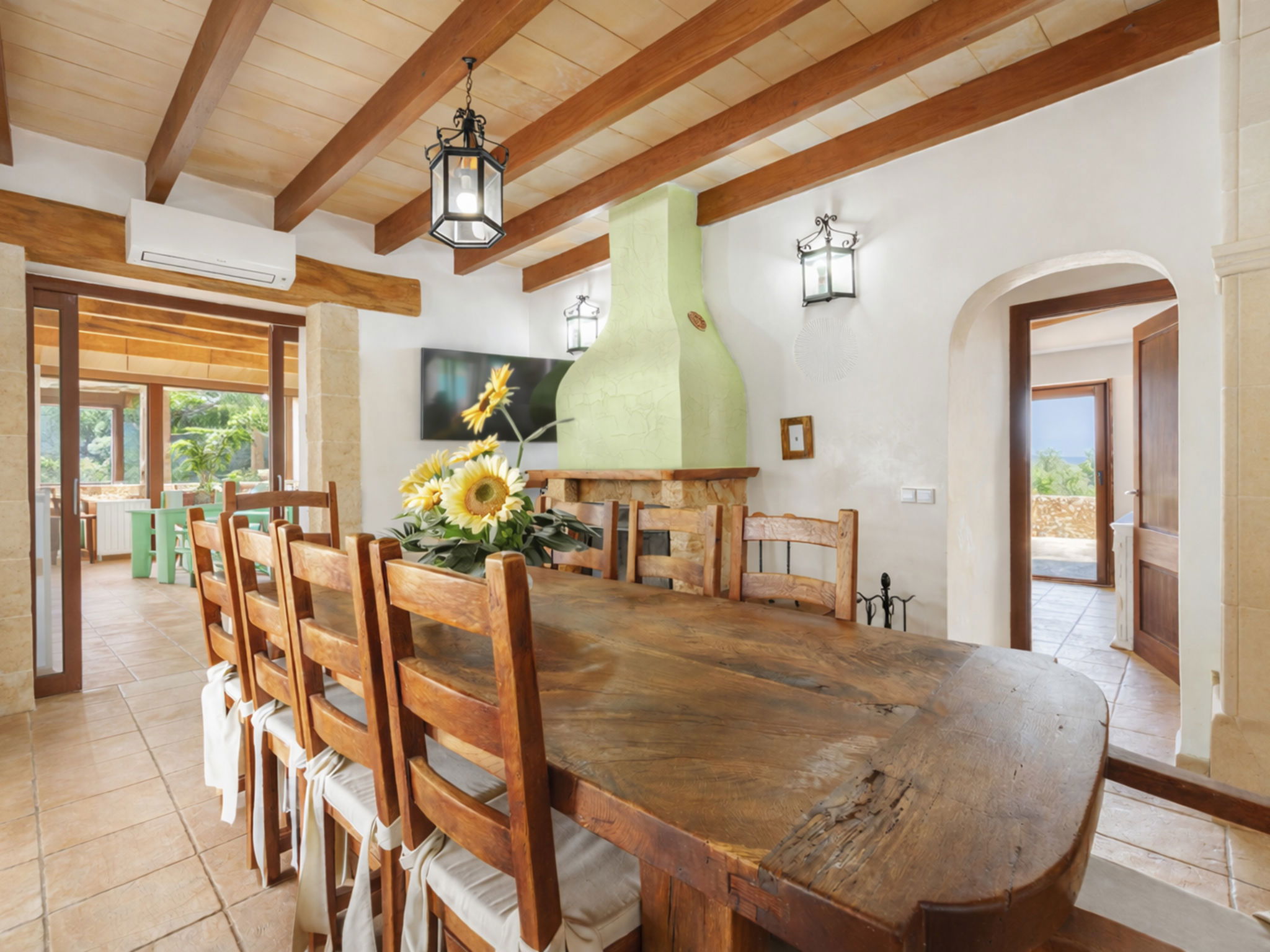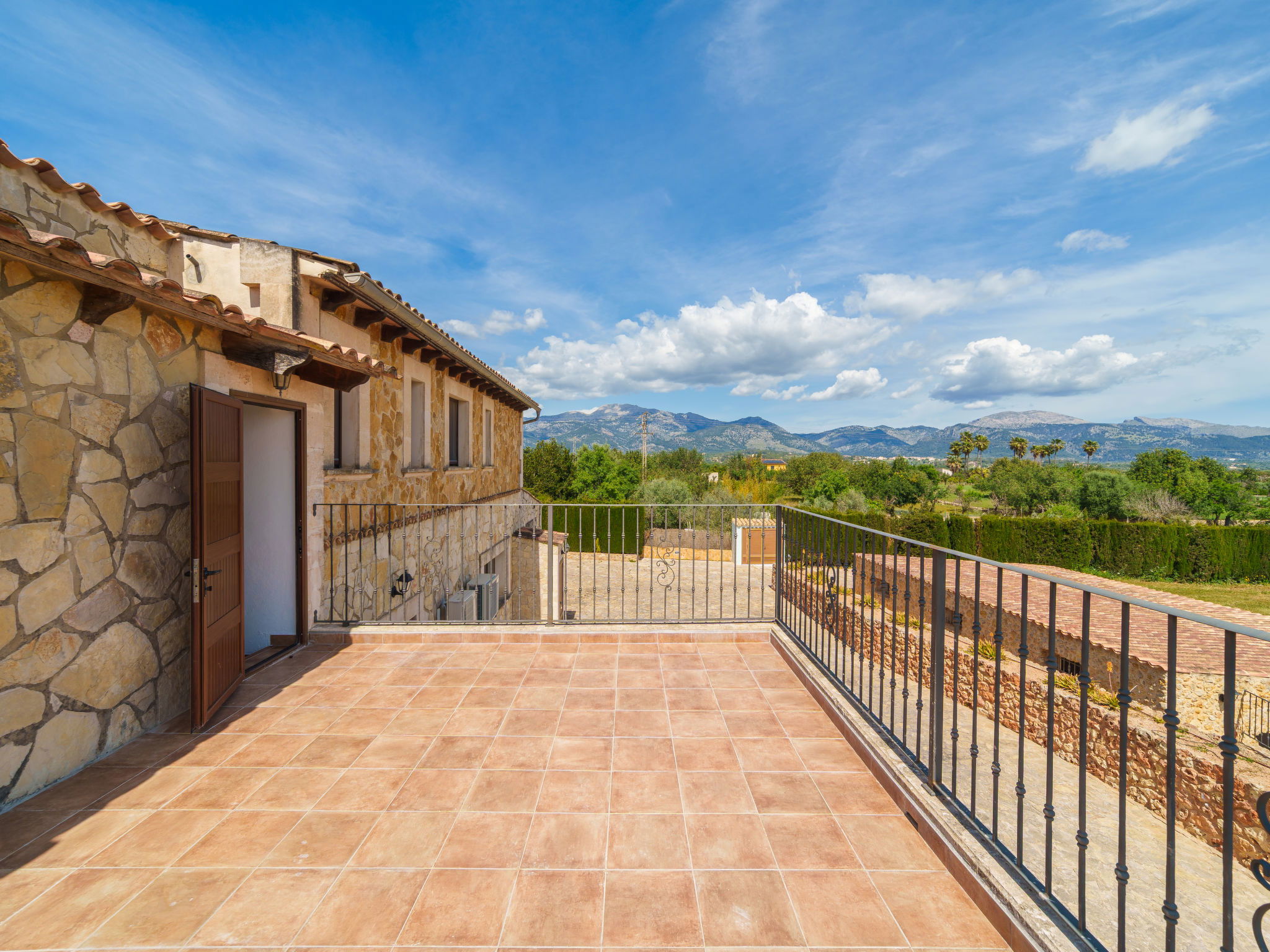 "Son Bosc", 6-room villa 450 m2 on 2 levels. Object suitable for 9 adults. Spacious and bright, fully renovated, comfortable and cosy furnishings: large living room with panoramic window with digital TV, flat screen, air conditioning and forced-air heating. Exit to the patio. 1 large double bedroom with sliding door with 2 beds (90 cm, length 200 cm), digital TV, flat screen, air conditioning and forced-air heating. Exit to the patio. Lounge with digital TV, flat screen, air conditioning and forced-air heating. Exit to the patio. Kitchen-/living room (oven, dishwasher, 3 ceramic glass hob hotplates, microwave, freezer, electric coffee machine) with dining table, open-hearth fireplace (only for decoration), air conditioning and forced-air heating. Exit to the patio. Bath/WC, shower/WC. Upper floor: 1 large double bedroom with panoramic window Dressing room with 1 french bed (180 cm, length 200 cm), digital TV, flat screen, air conditioning and forced-air heating. (ladder), 1 double bedroom with panoramic window with 1 french bed (150 cm, length 200 cm), digital TV, flat screen, air conditioning and forced-air heating. (ladder), 1 double bedroom with panoramic window with 2 beds (90 cm, length 200 cm), digital TV, flat screen, air conditioning and forced-air heating. 1 large double bedroom with panoramic window with 1 french bed (150 cm, length 200 cm), air conditioning and forced-air heating. Exit to the balcony. 2 showers/WC, double hand-basin. Natural stone floors. Large balcony, large patio, lawn, porch. Terrace furniture, barbecue, deck chairs (9), covered balcony, sitting area. Very beautiful view of the mountains and the countryside. Facilities: washing machine, dryer, iron, children's high chair, baby cot for up to 2 year olds, hair dryer. Internet (WiFi, free). Parking (roofed), garage on the property at the house. Please note: suitable for families one double bedroom is outside the apartment. No lift. The pool mentioned in the description is for private use. ETV/11105 // Reg. Nr.: ESFCTU0000070110000267710000000000000000000ETV/111052