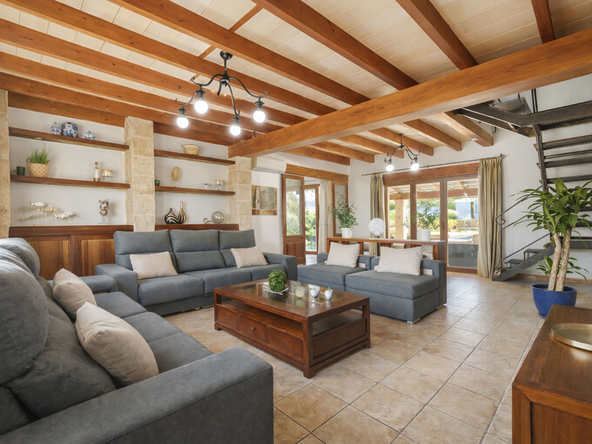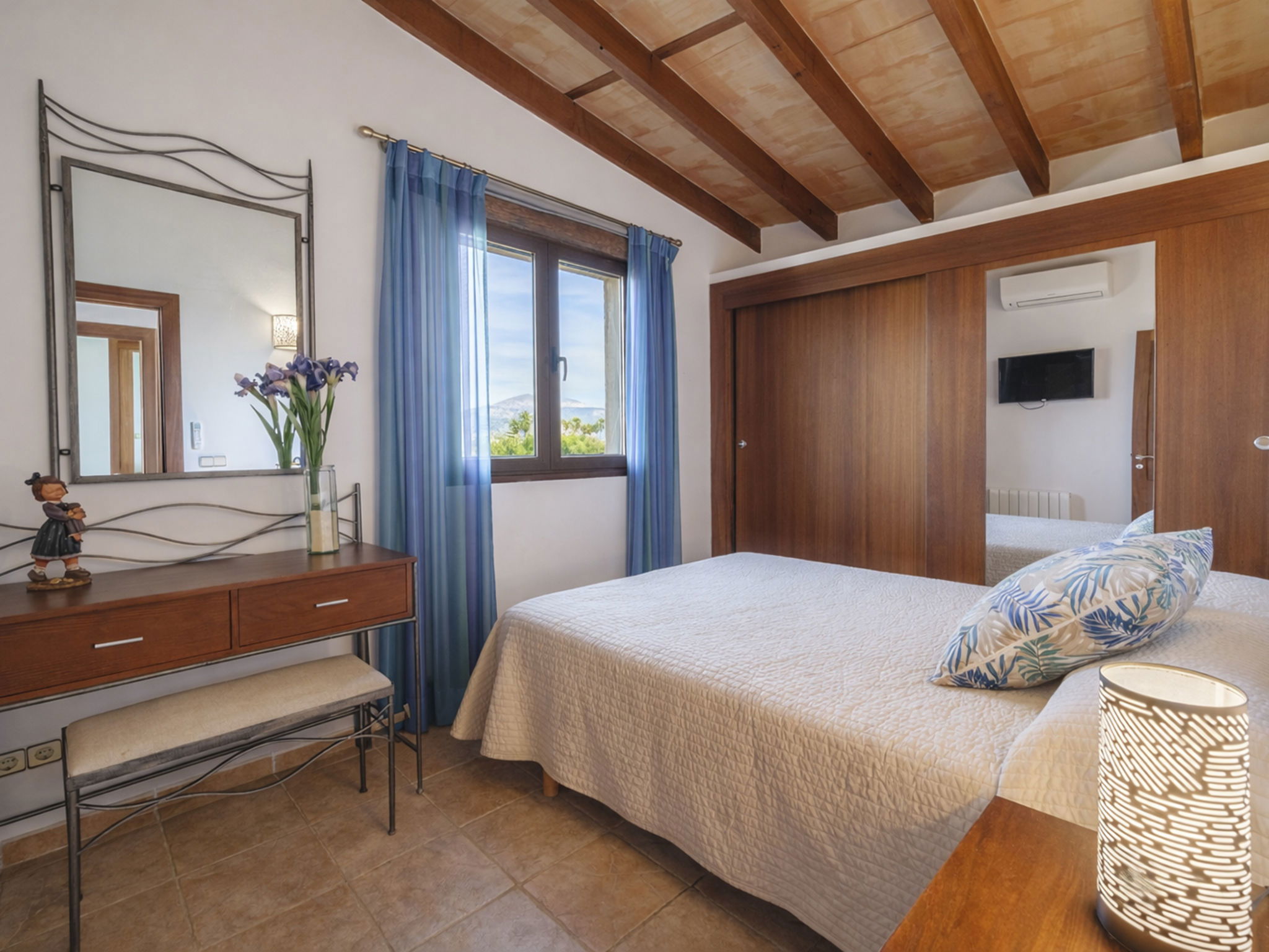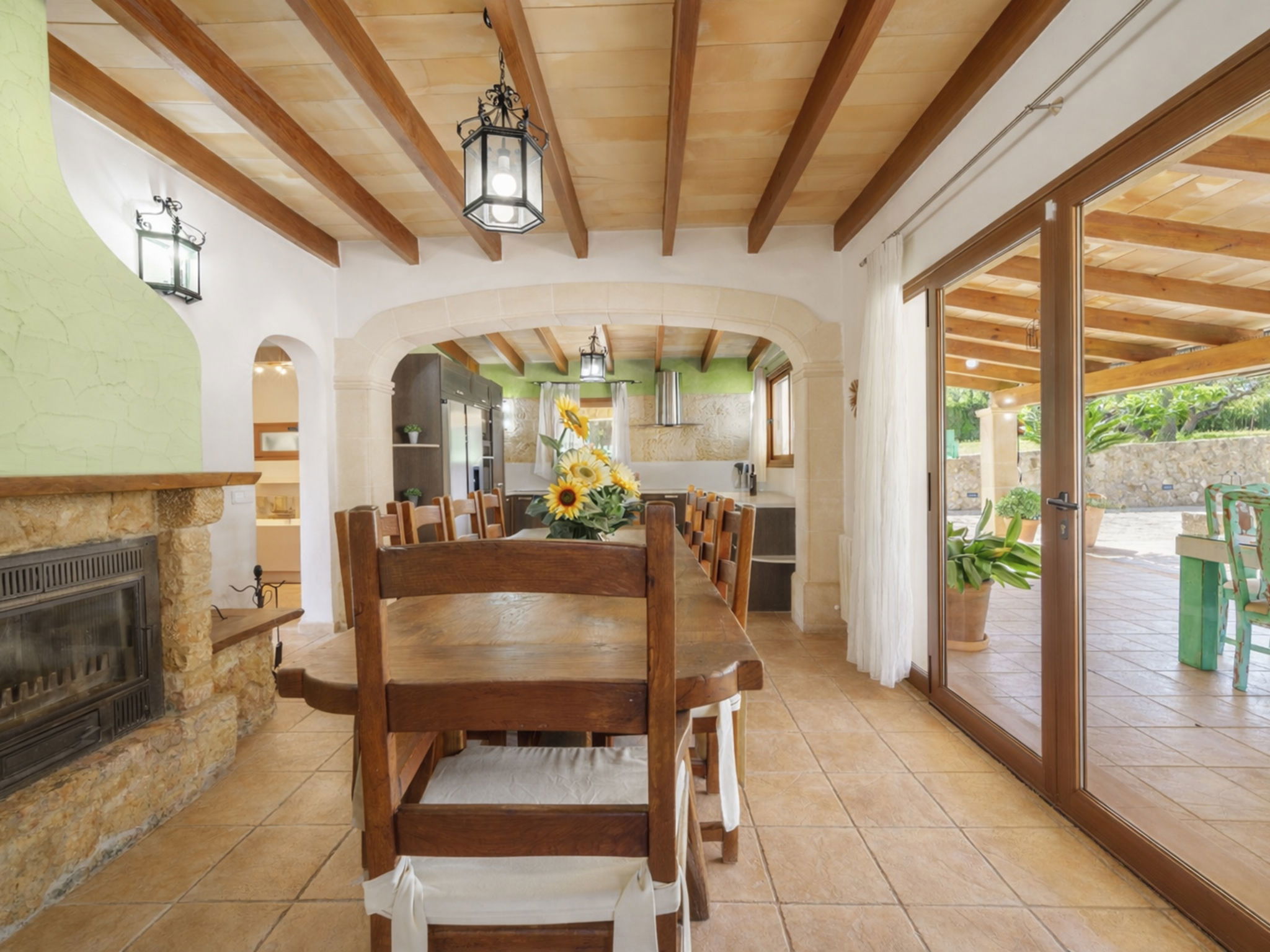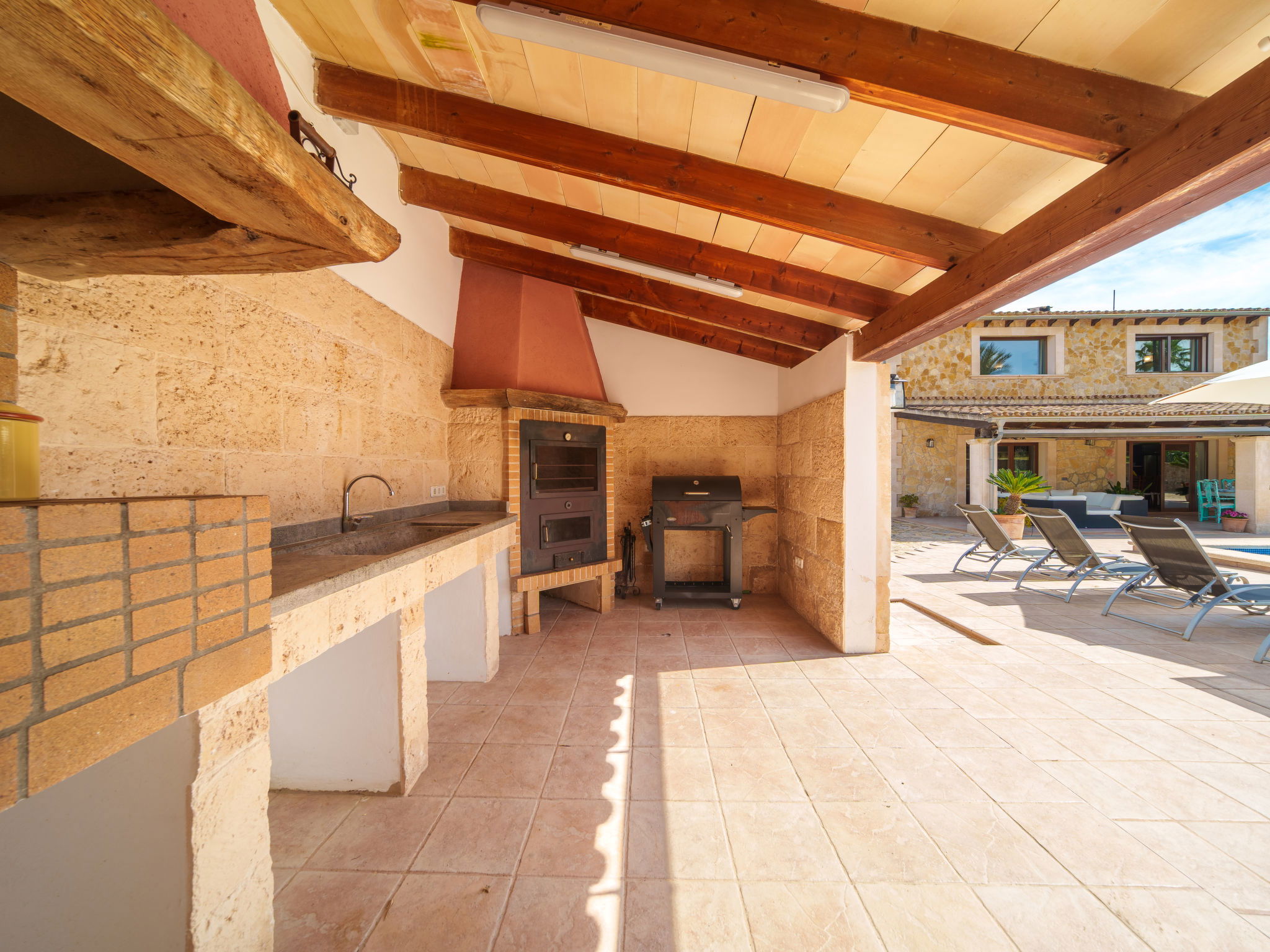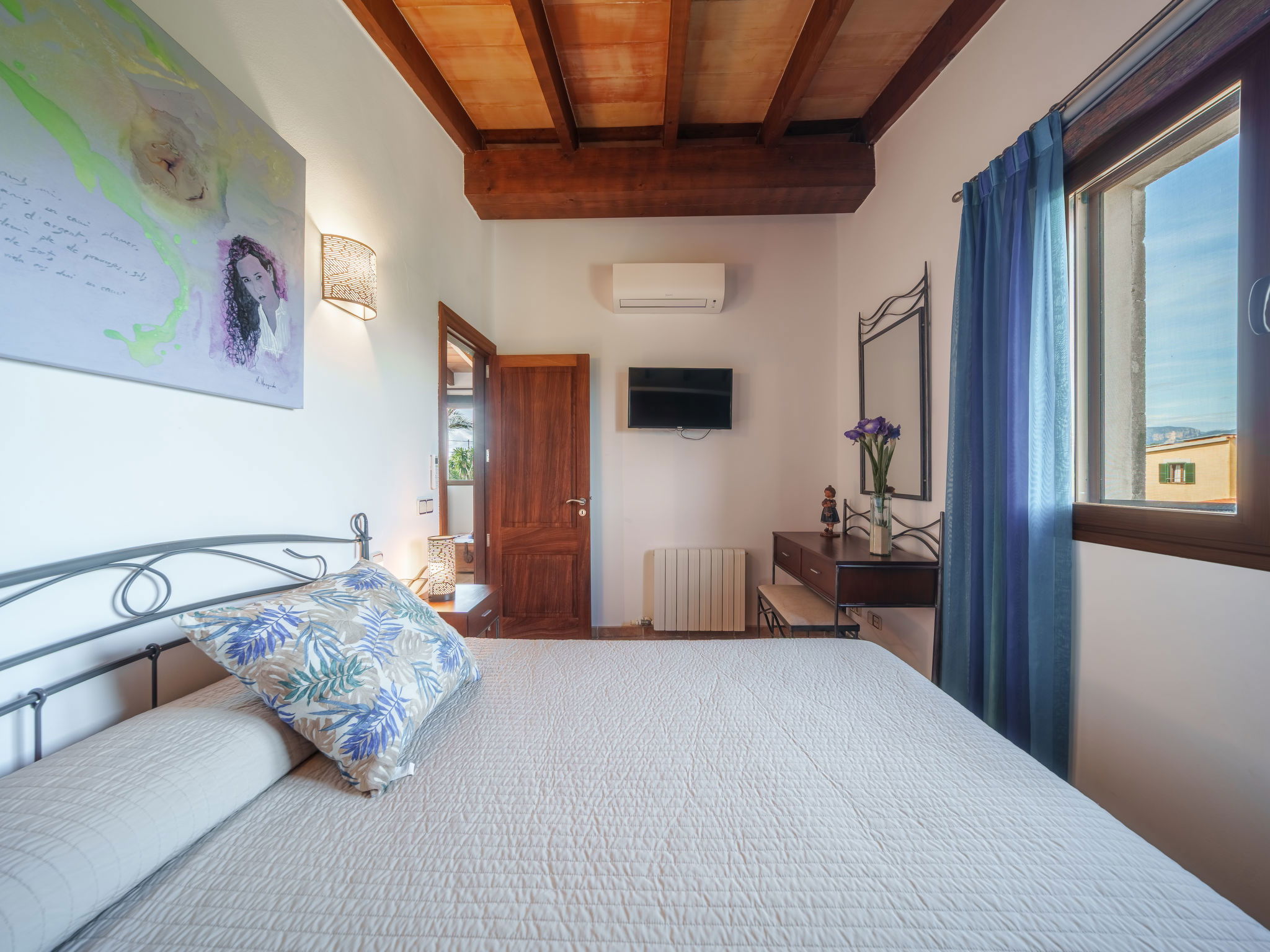 "Son Bosc", 6-room villa 450 m2 on 2 levels. Object suitable for 9 adults. Spacious and bright, fully renovated, comfortable and cosy furnishings: large living room with panoramic window with digital TV, flat screen, air conditioning and forced-air heating. Exit to the patio. 1 large double bedroom with sliding door with 2 beds (90 cm, length 200 cm), digital TV, flat screen, air conditioning and forced-air heating. Exit to the patio. Lounge with digital TV, flat screen, air conditioning and forced-air heating. Exit to the patio. Kitchen-/living room (oven, dishwasher, 3 ceramic glass hob hotplates, microwave, freezer, electric coffee machine) with dining table, open-hearth fireplace (only for decoration), air conditioning and forced-air heating. Exit to the patio. Bath/WC, shower/WC. Upper floor: 1 large double bedroom with panoramic window Dressing room with 1 french bed (180 cm, length 200 cm), digital TV, flat screen, air conditioning and forced-air heating. (ladder), 1 double bedroom with panoramic window with 1 french bed (150 cm, length 200 cm), digital TV, flat screen, air conditioning and forced-air heating. (ladder), 1 double bedroom with panoramic window with 2 beds (90 cm, length 200 cm), digital TV, flat screen, air conditioning and forced-air heating. 1 large double bedroom with panoramic window with 1 french bed (150 cm, length 200 cm), air conditioning and forced-air heating. Exit to the balcony. 2 showers/WC, double hand-basin. Natural stone floors. Large balcony, large patio, lawn, porch. Terrace furniture, barbecue, deck chairs (9), covered balcony, sitting area. Very beautiful view of the mountains and the countryside. Facilities: washing machine, dryer, iron, children's high chair, baby cot for up to 2 year olds, hair dryer. Internet (WiFi, free). Parking (roofed), garage on the property at the house. Please note: suitable for families one double bedroom is outside the apartment. No lift. The pool mentioned in the description is for private use. ETV/11105 // Reg. Nr.: ESFCTU0000070110000267710000000000000000000ETV/111052