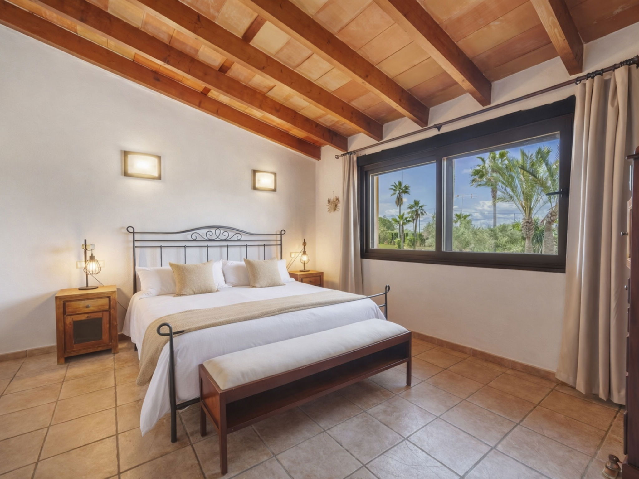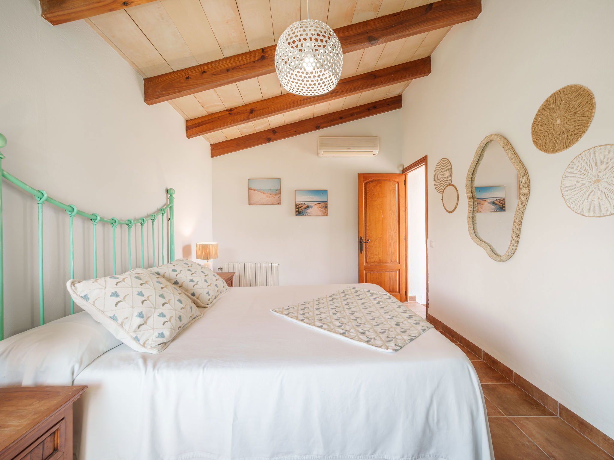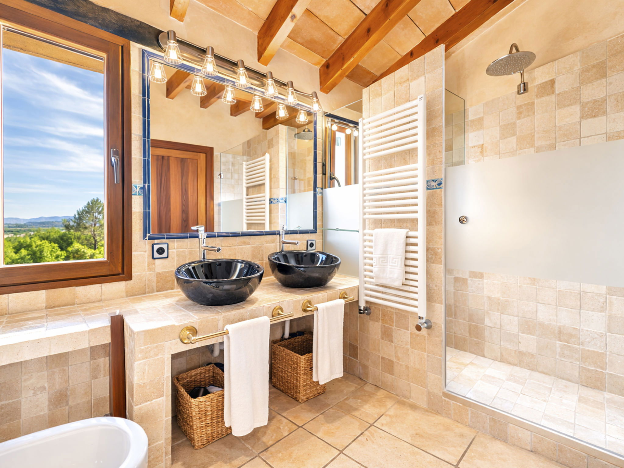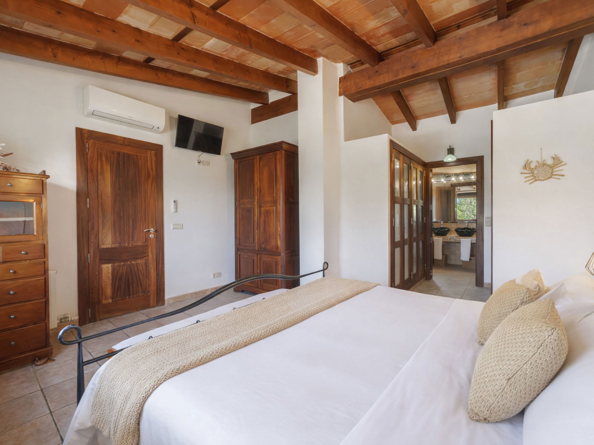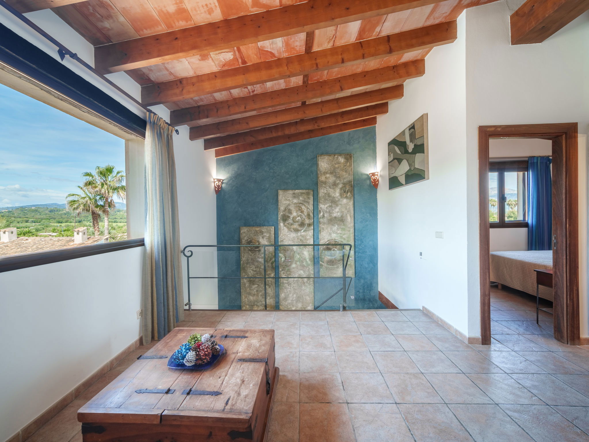 "Son Bosc", 6-room villa 450 m2 on 2 levels. Object suitable for 9 adults. Spacious and bright, fully renovated, comfortable and cosy furnishings: large living room with panoramic window with digital TV, flat screen, air conditioning and forced-air heating. Exit to the patio. 1 large double bedroom with sliding door with 2 beds (90 cm, length 200 cm), digital TV, flat screen, air conditioning and forced-air heating. Exit to the patio. Lounge with digital TV, flat screen, air conditioning and forced-air heating. Exit to the patio. Kitchen-/living room (oven, dishwasher, 3 ceramic glass hob hotplates, microwave, freezer, electric coffee machine) with dining table, open-hearth fireplace (only for decoration), air conditioning and forced-air heating. Exit to the patio. Bath/WC, shower/WC. Upper floor: 1 large double bedroom with panoramic window Dressing room with 1 french bed (180 cm, length 200 cm), digital TV, flat screen, air conditioning and forced-air heating. (ladder), 1 double bedroom with panoramic window with 1 french bed (150 cm, length 200 cm), digital TV, flat screen, air conditioning and forced-air heating. (ladder), 1 double bedroom with panoramic window with 2 beds (90 cm, length 200 cm), digital TV, flat screen, air conditioning and forced-air heating. 1 large double bedroom with panoramic window with 1 french bed (150 cm, length 200 cm), air conditioning and forced-air heating. Exit to the balcony. 2 showers/WC, double hand-basin. Natural stone floors. Large balcony, large patio, lawn, porch. Terrace furniture, barbecue, deck chairs (9), covered balcony, sitting area. Very beautiful view of the mountains and the countryside. Facilities: washing machine, dryer, iron, children's high chair, baby cot for up to 2 year olds, hair dryer. Internet (WiFi, free). Parking (roofed), garage on the property at the house. Please note: suitable for families one double bedroom is outside the apartment. No lift. The pool mentioned in the description is for private use. ETV/11105 // Reg. Nr.: ESFCTU0000070110000267710000000000000000000ETV/111052